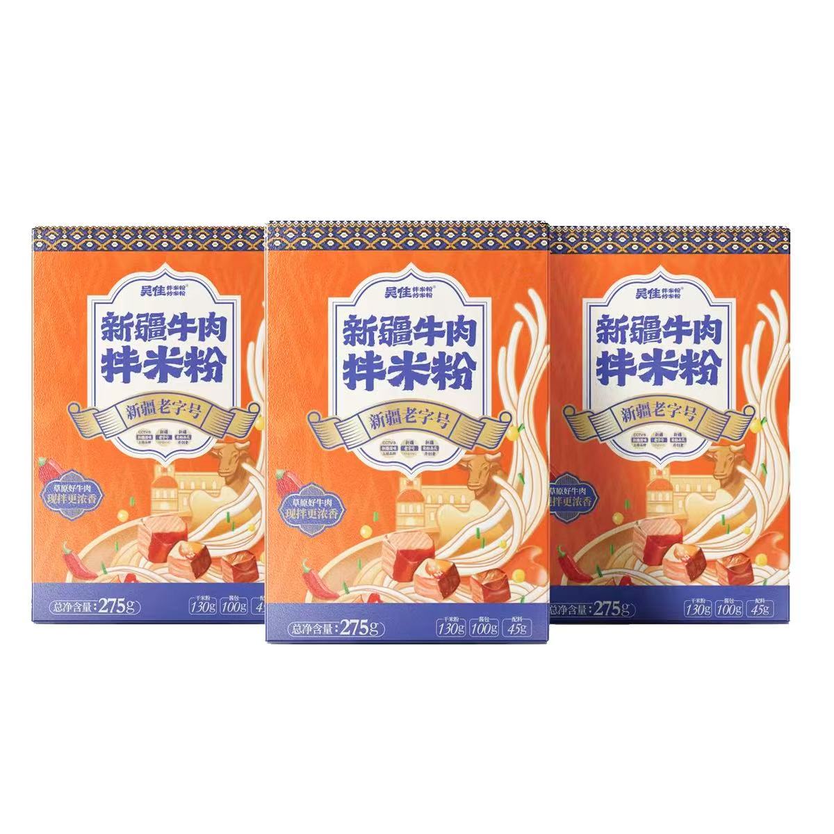 吴佳拌米粉牛肉干粉组合(4份)规格:干米粉130g*4包,肉酱100g*4包,酥豌豆15g*4包,酸豇豆20g*4包,合计1092克!(4人份量!独立包装)