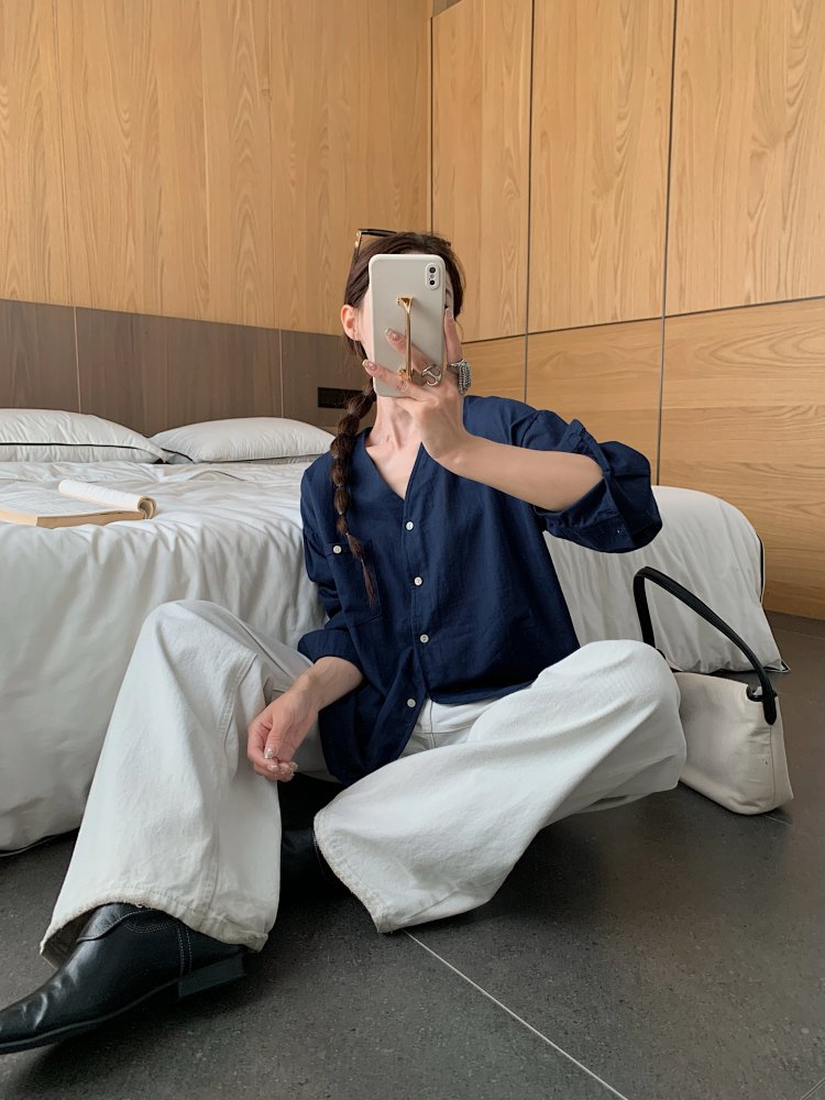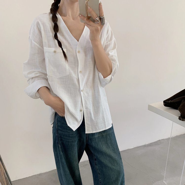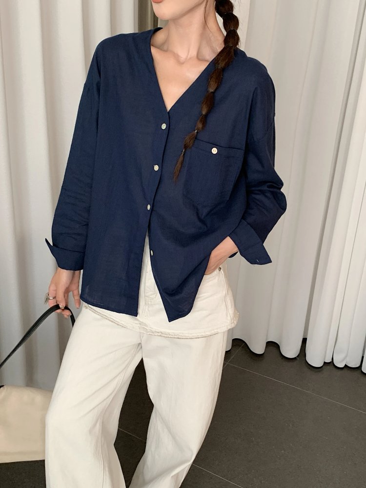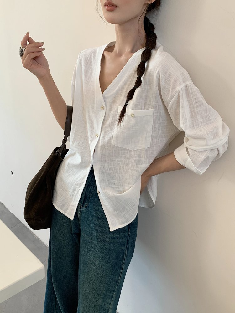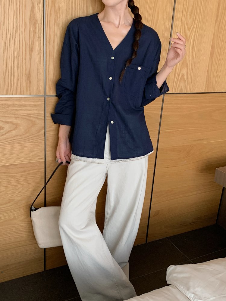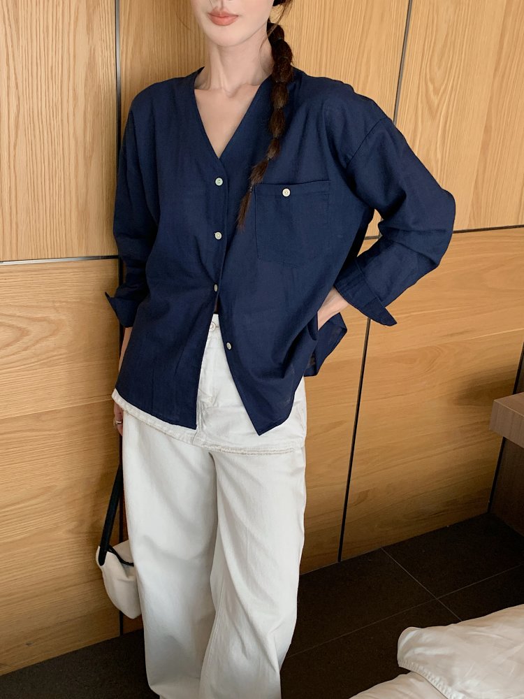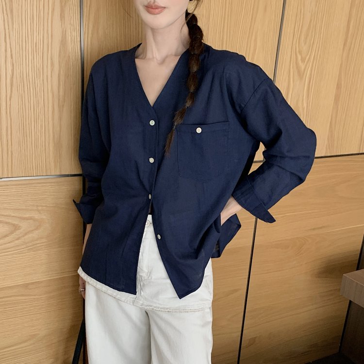 V领长袖衬衫—简约休闲V领棉麻衬衫