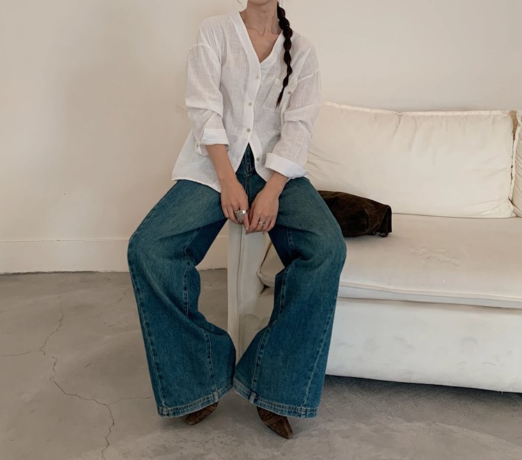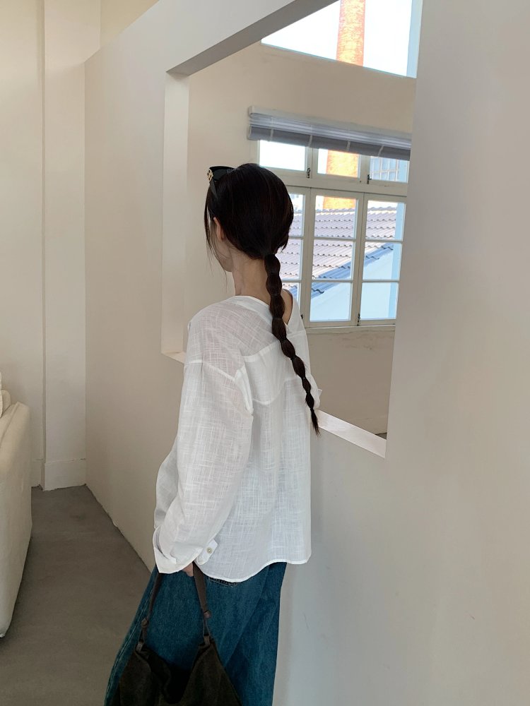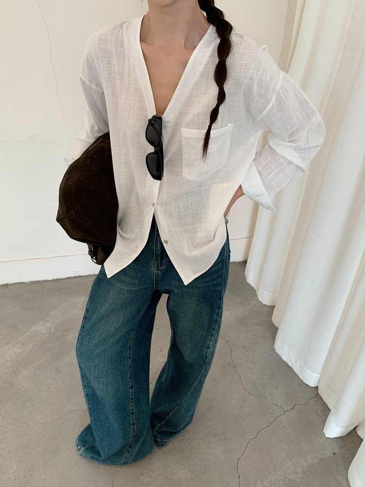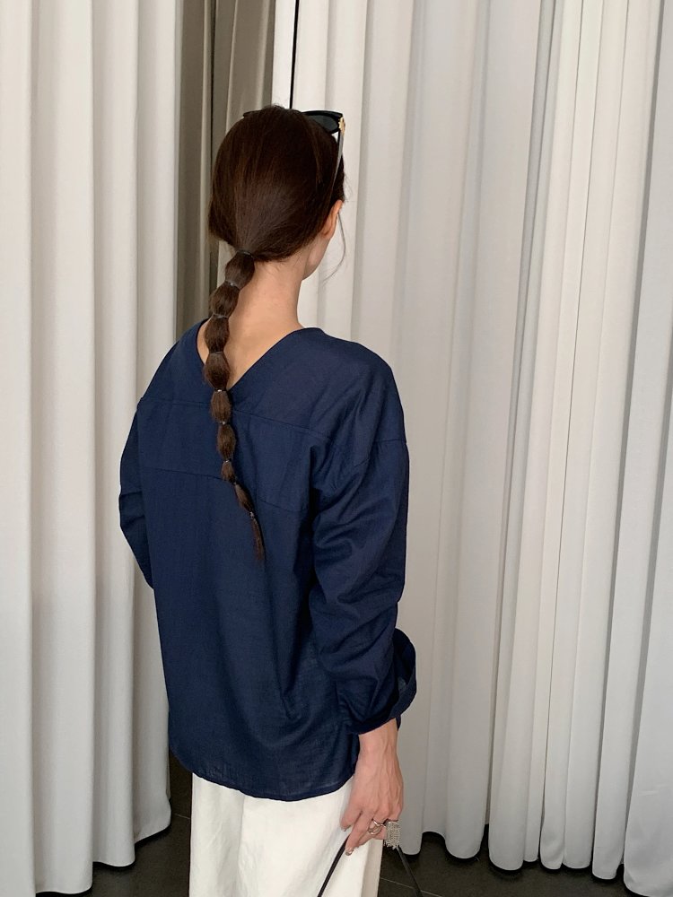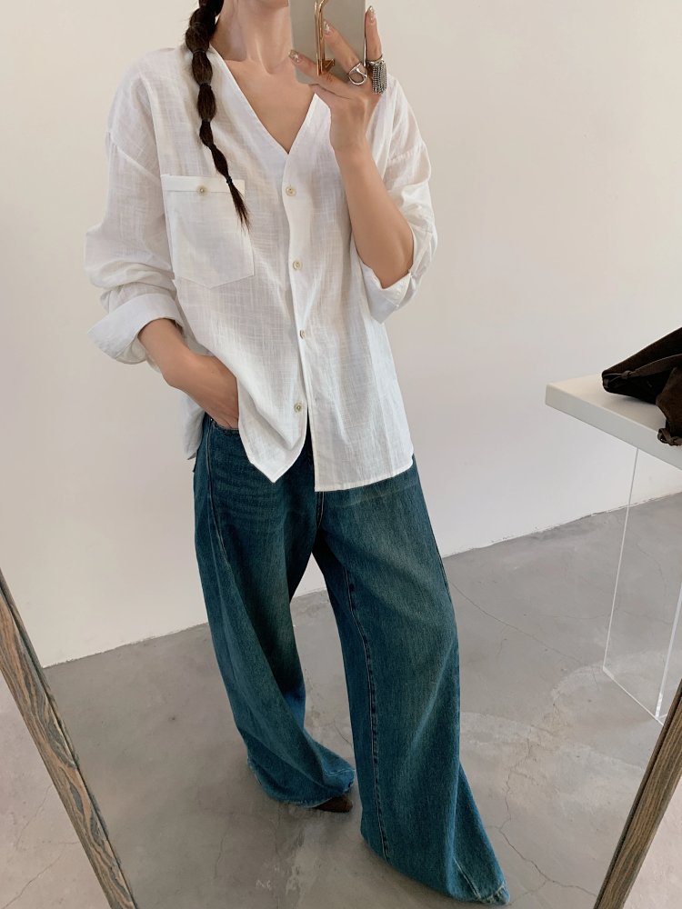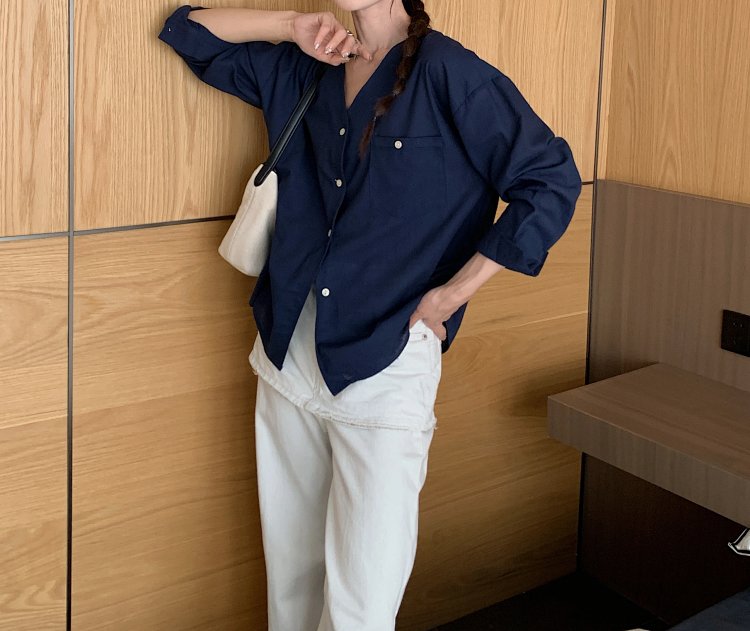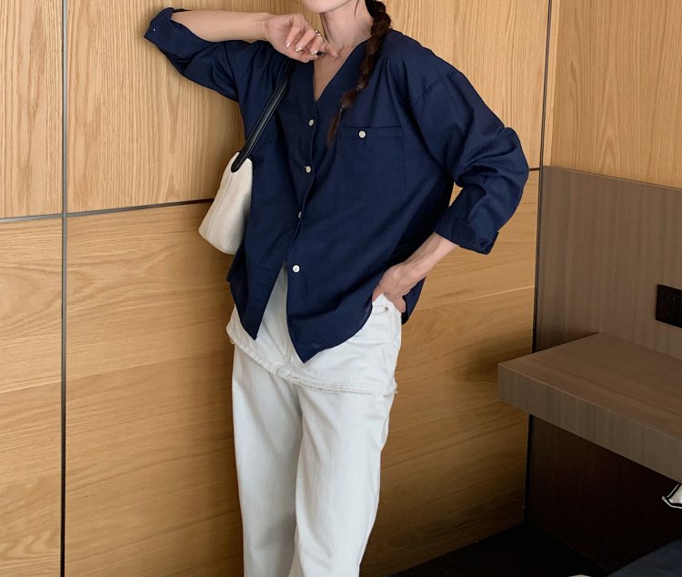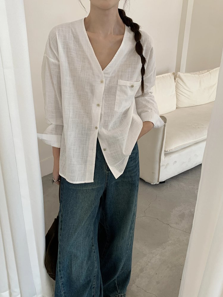 V领长袖衬衫—简约休闲V领棉麻衬衫
