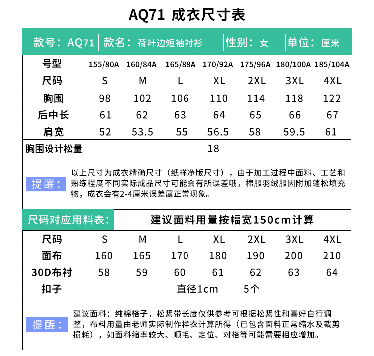 裁缝学苑AQ71 格子上衣夏季新款荷叶边短袖衬衫纸样女装服装打板