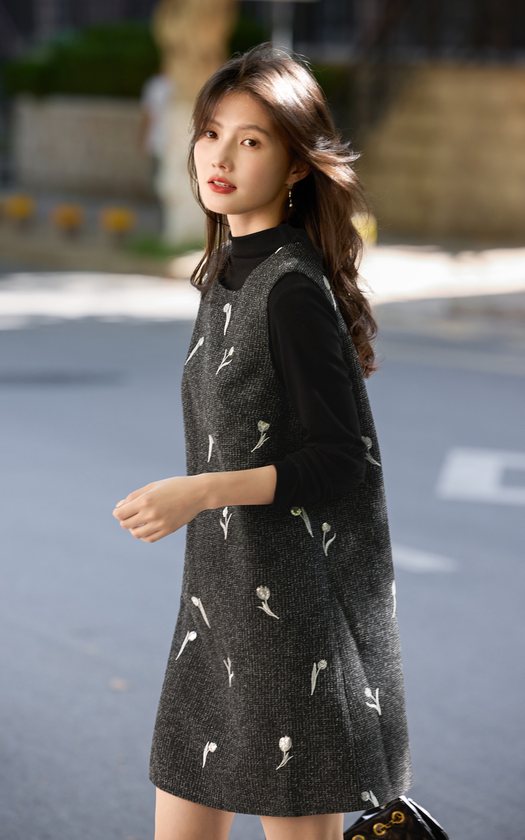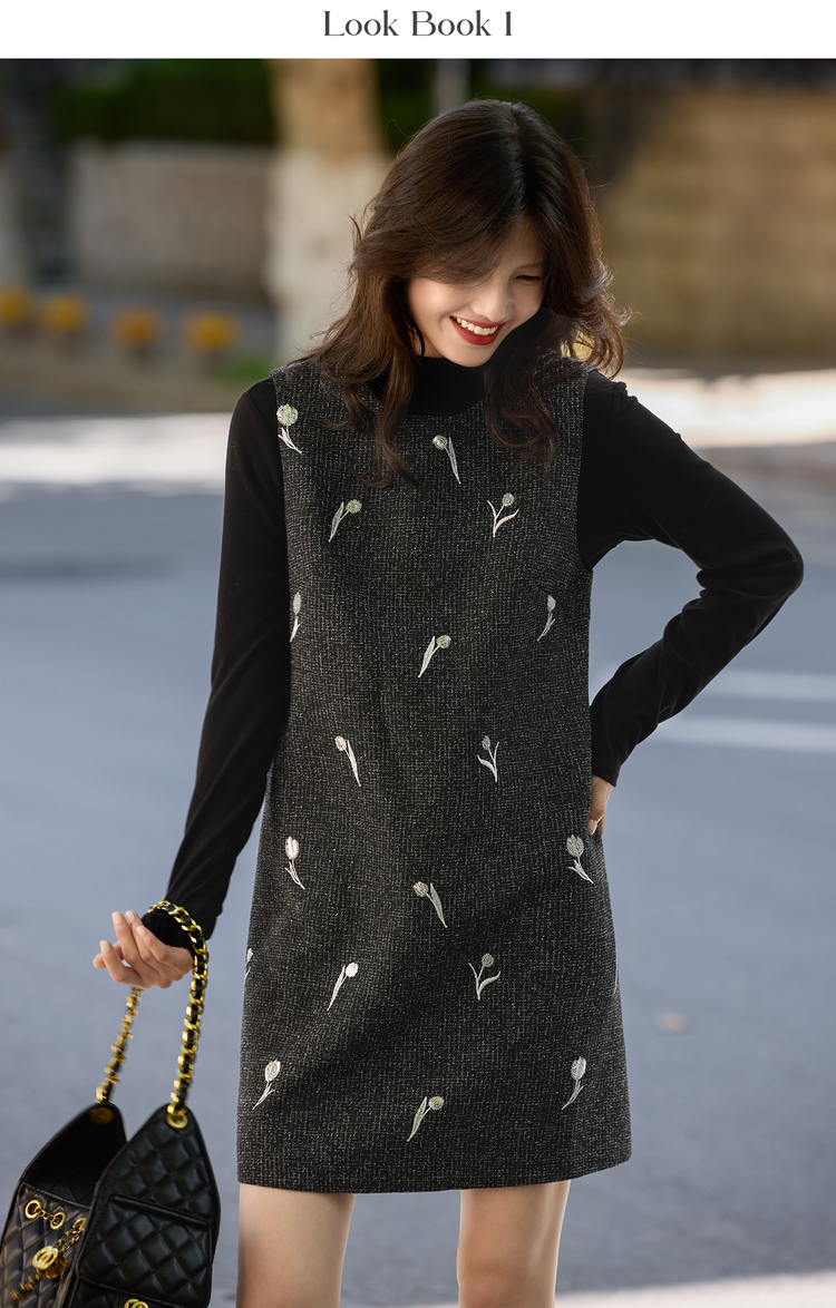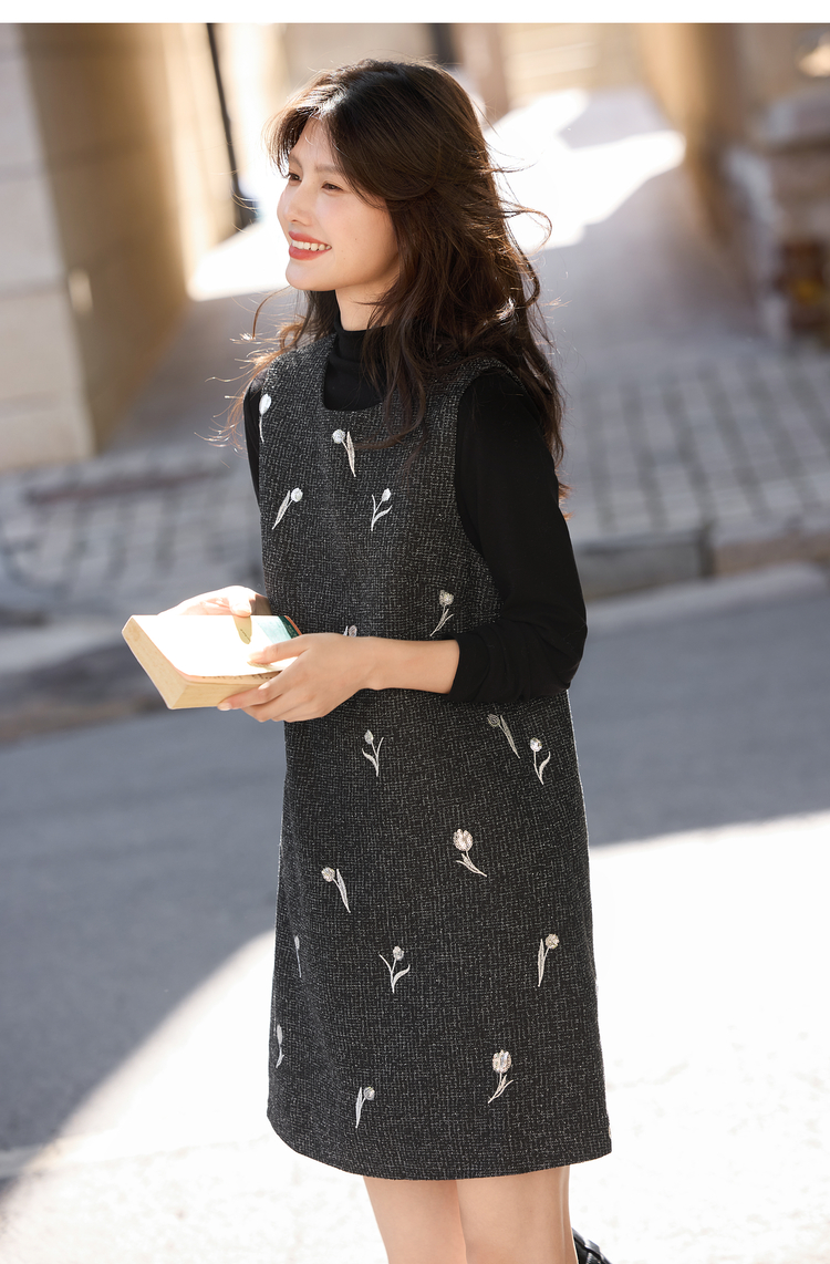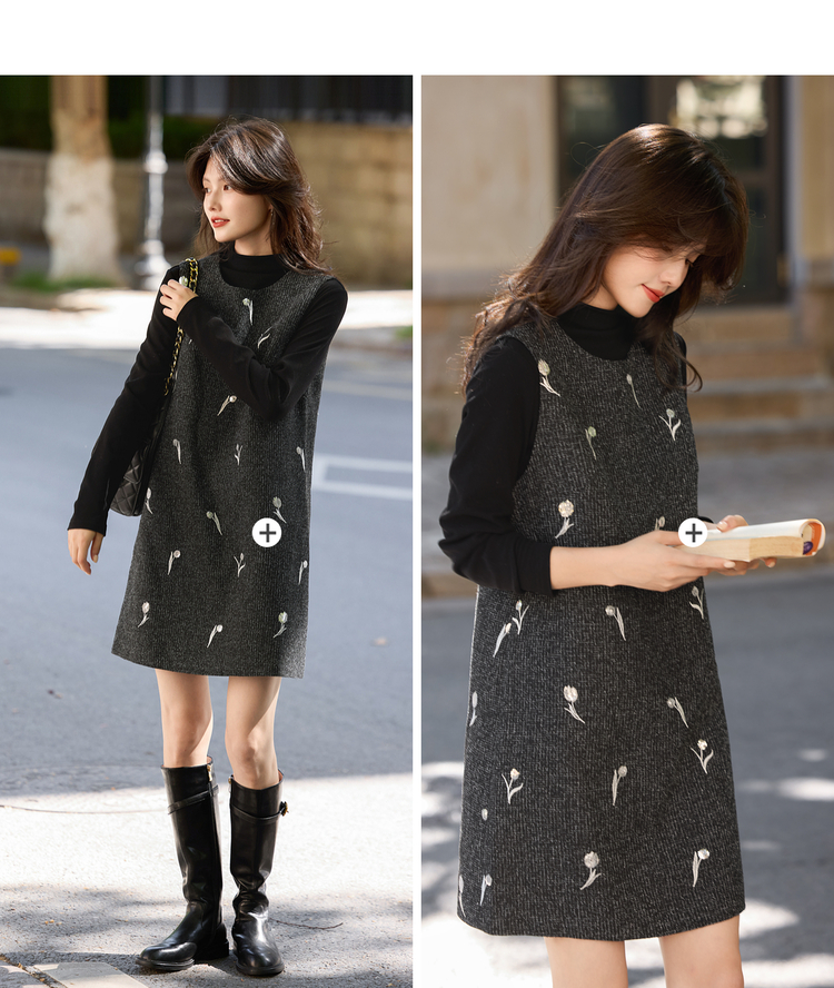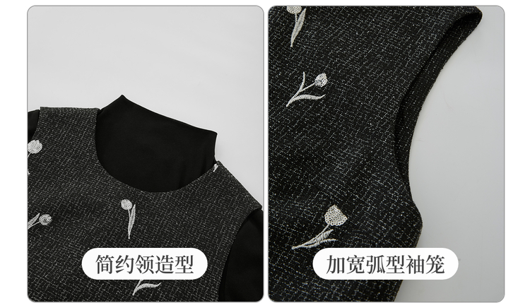 【年终特卖】熙世界郁金香刺绣背心裙套装女秋冬针织打底衫无袖直筒短裙两件套