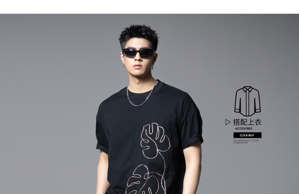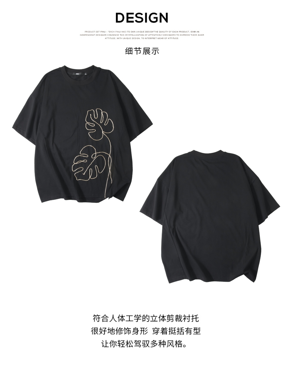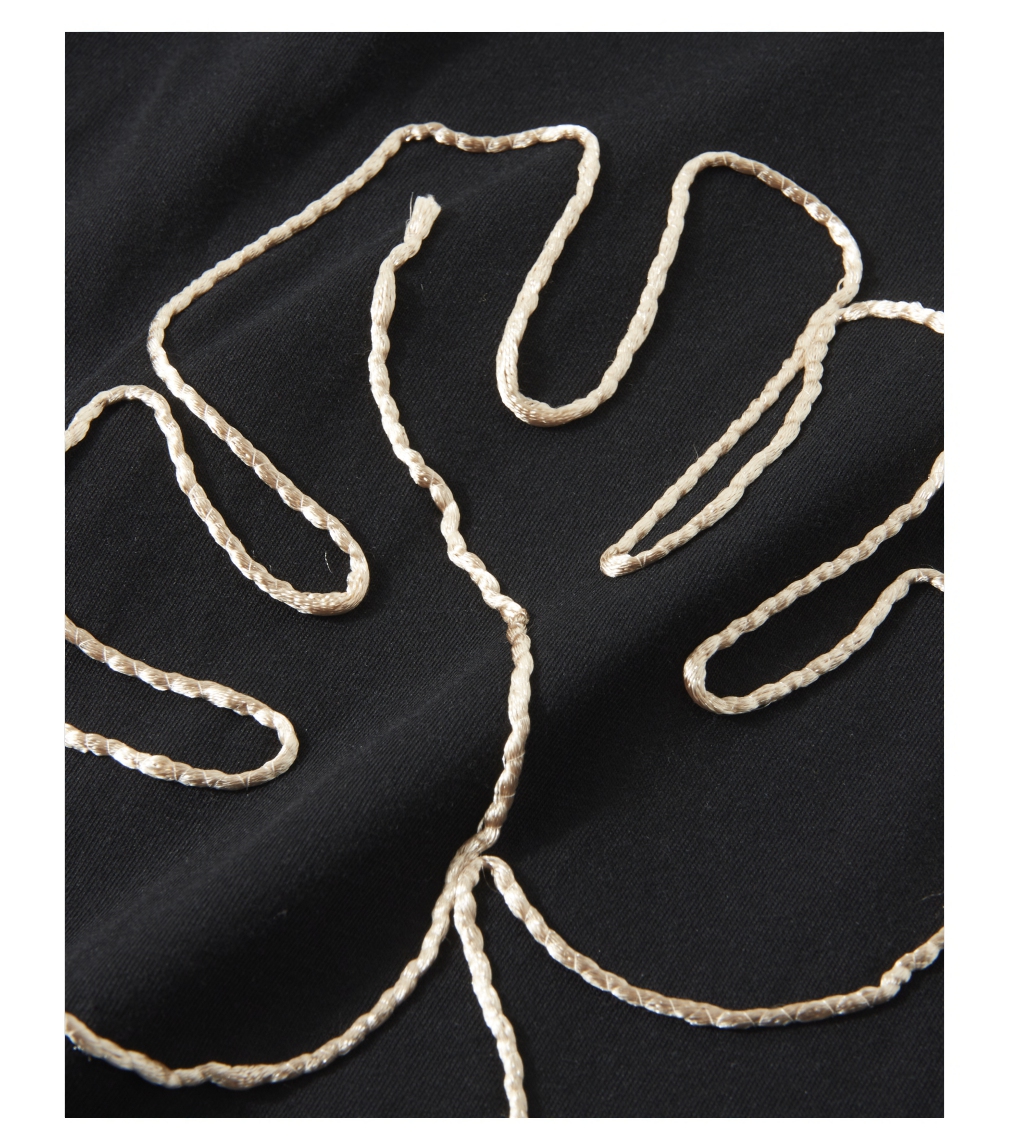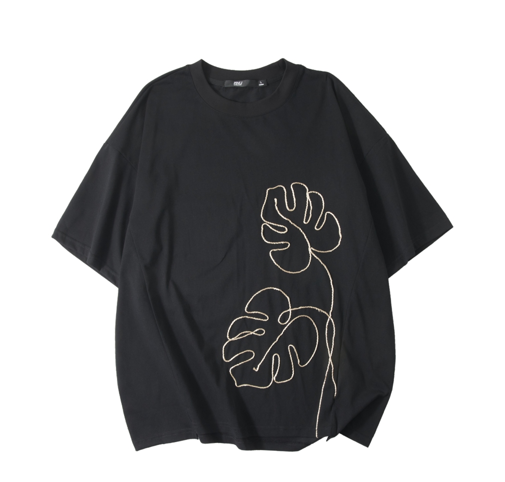 PINLI品立2025夏季新款男士树叶盘绳短袖T恤潮牌宽松休闲体恤上衣B252111027