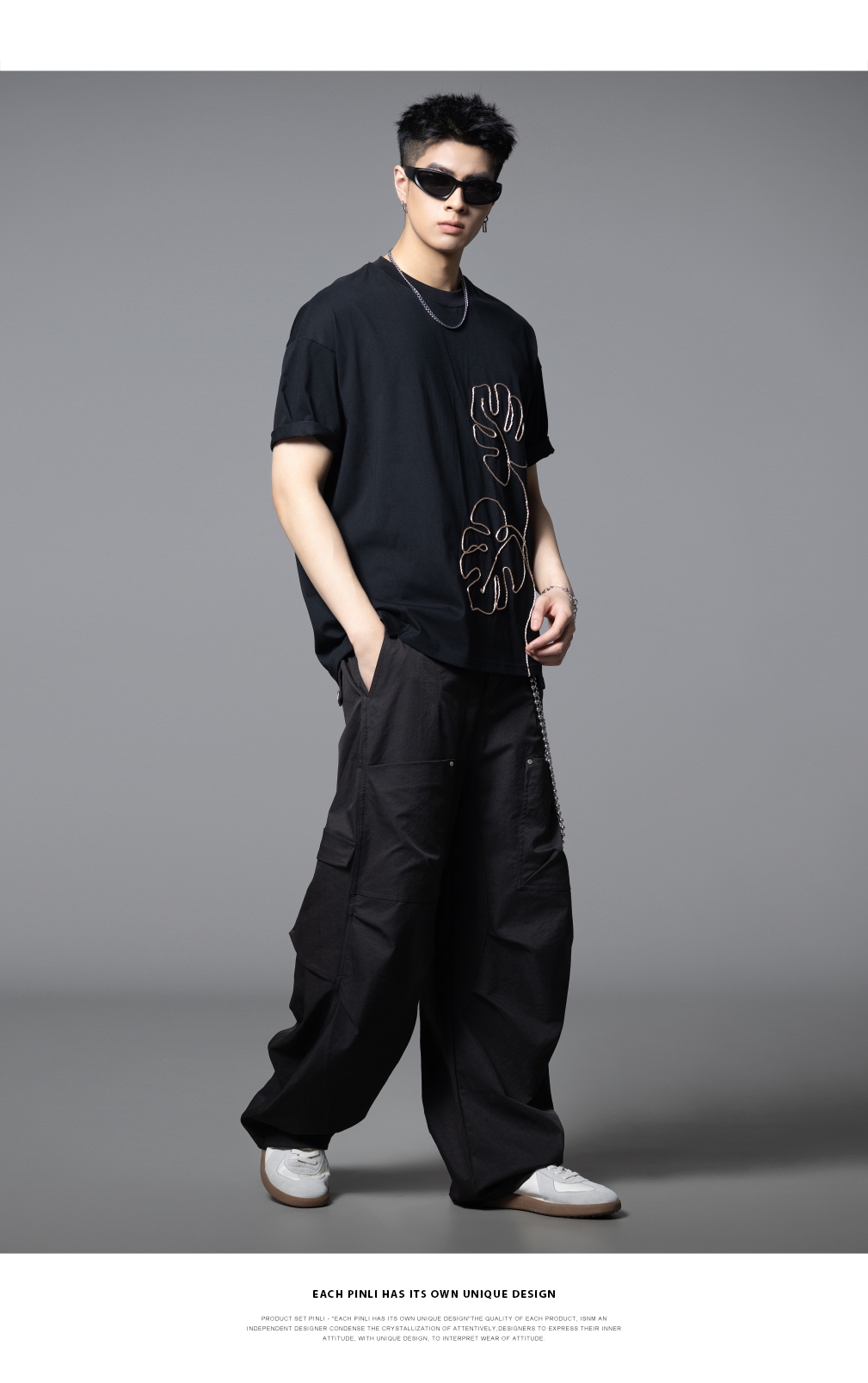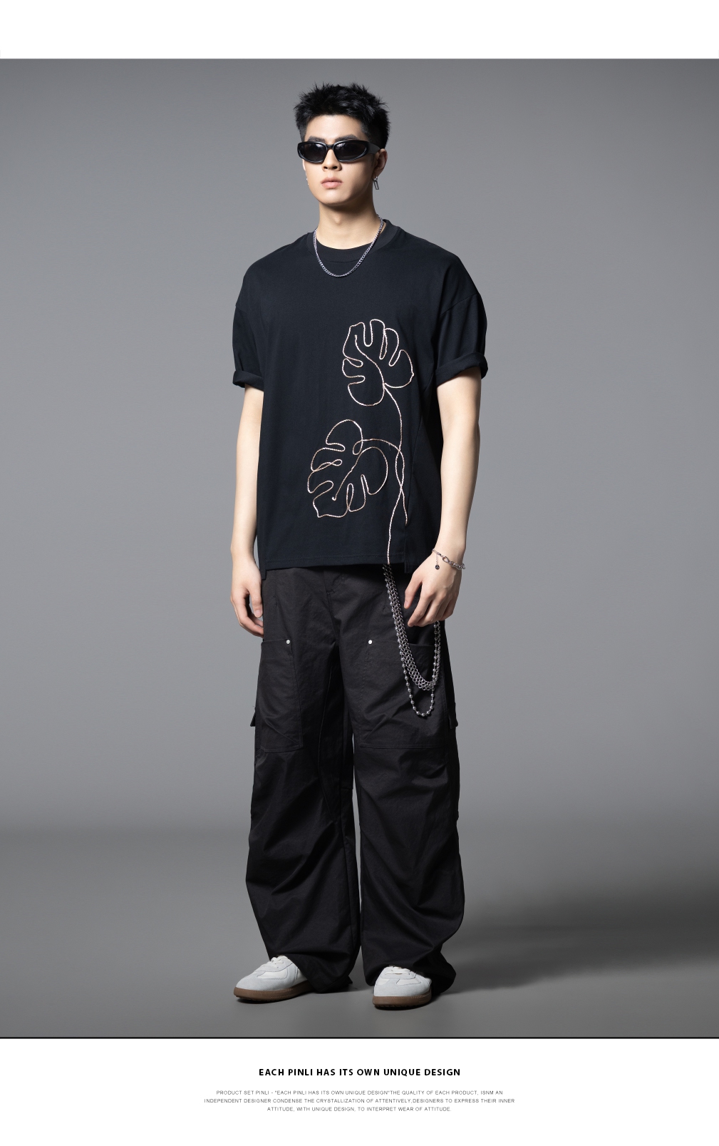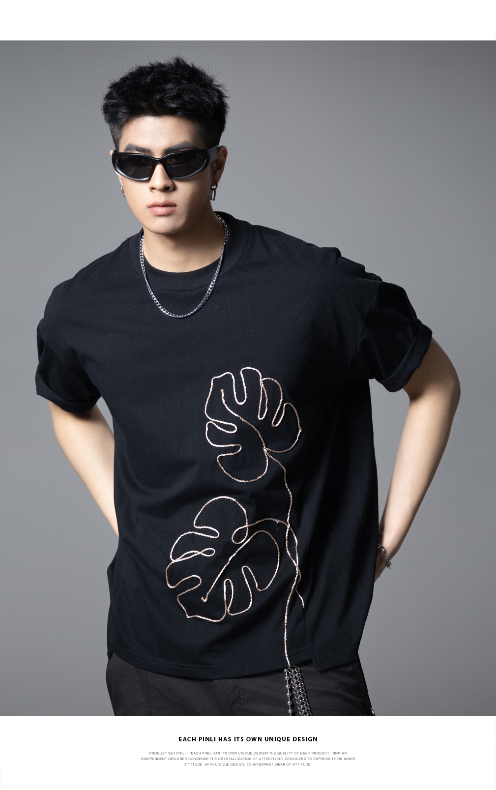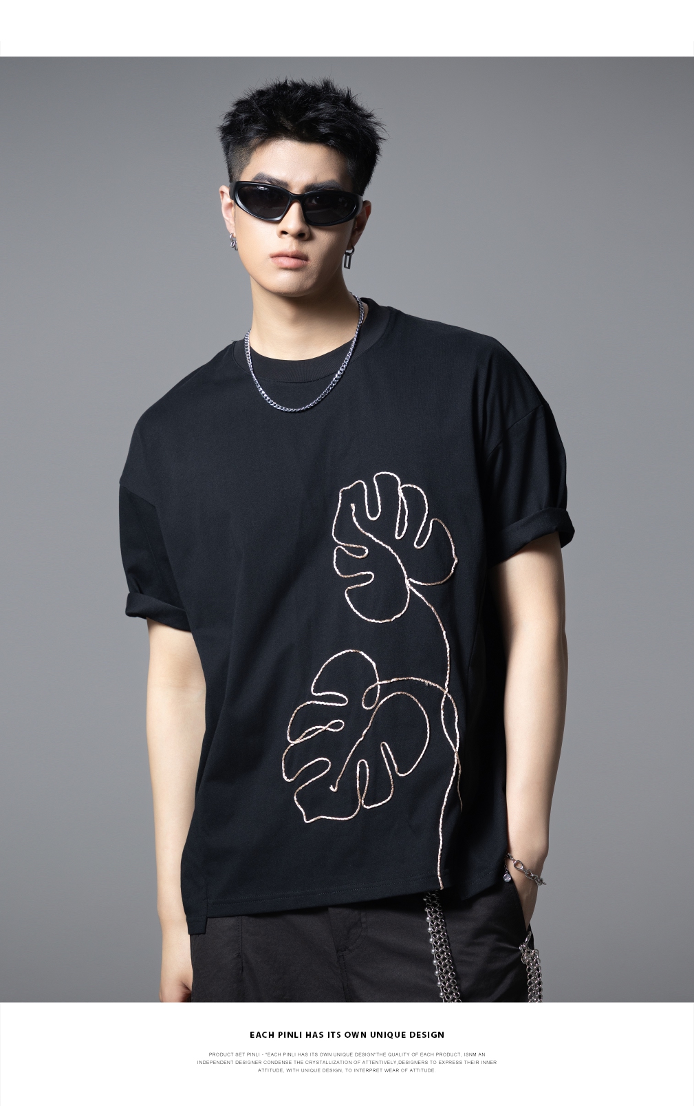 PINLI品立2025夏季新款男士树叶盘绳短袖T恤潮牌宽松休闲体恤上衣B252111027