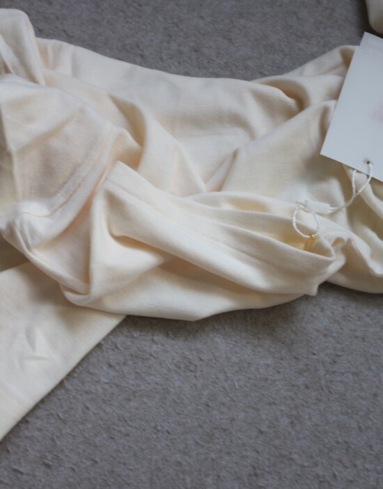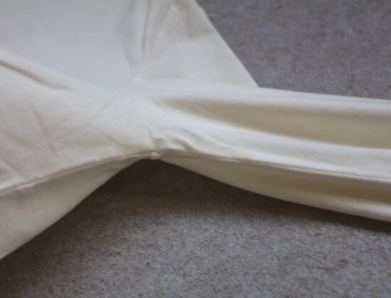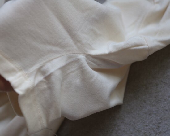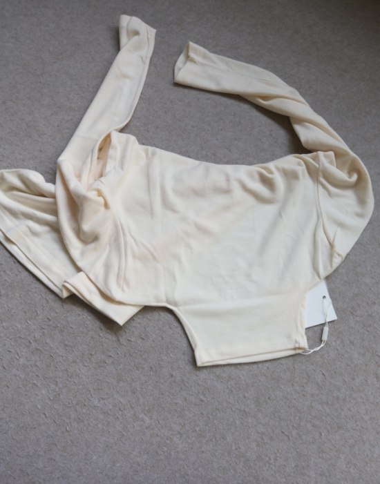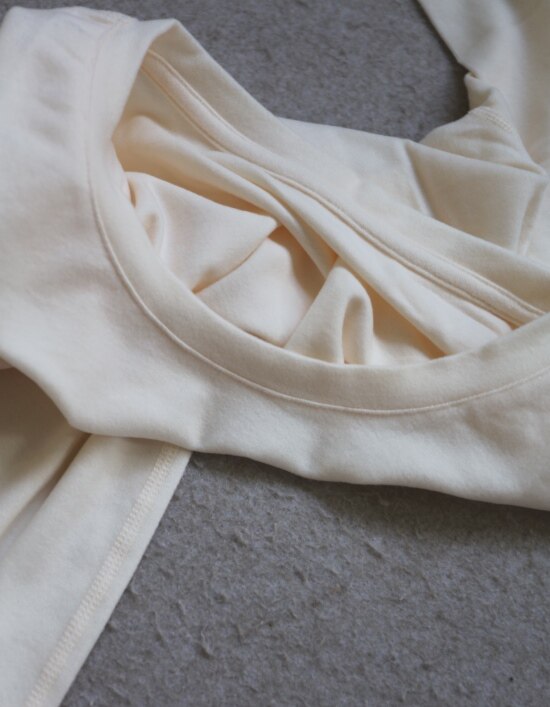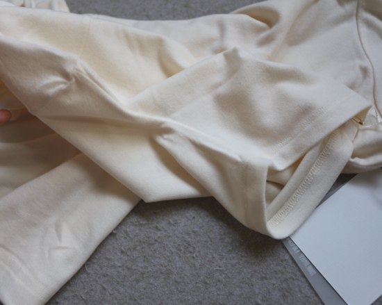 内领口的后半圈 有压条包边 弹力螺纹领口 肩线刚好在肩头