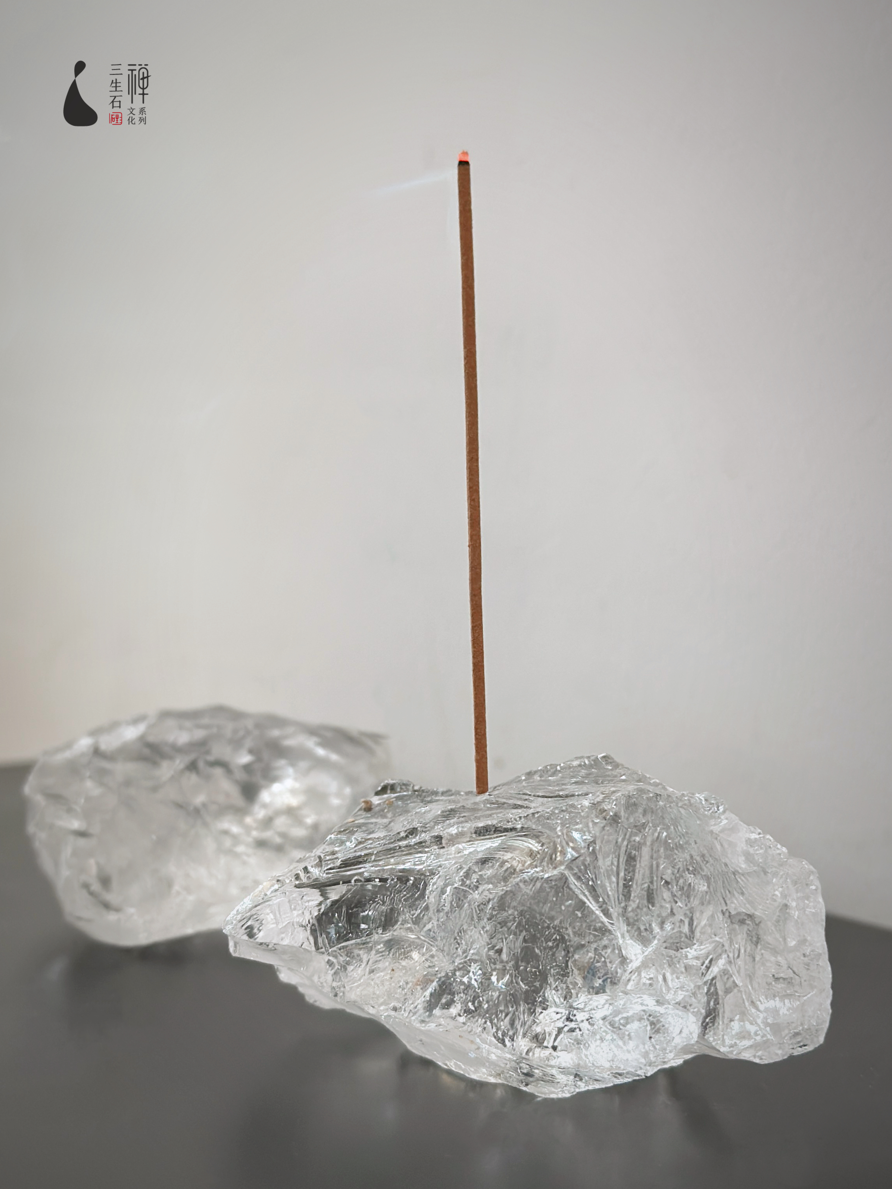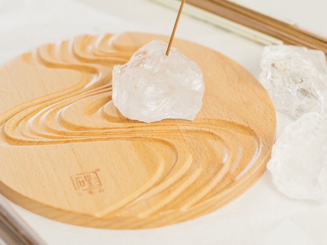 天然白水晶原石香插+天然榉木山水香盘