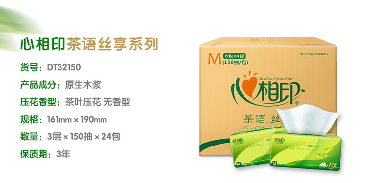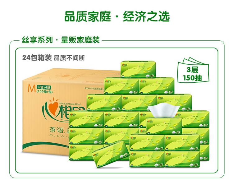 心相印抽纸 茶语丝享系列3层150抽面巾纸*24包纸巾(M plus码 母婴可用 整箱销售)(新老包装随机发货)