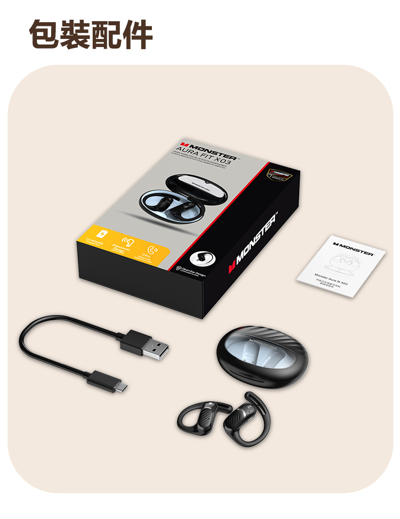 产品包装清单:耳机*1(1对)、充电线*1、说明书*1、合格证*1