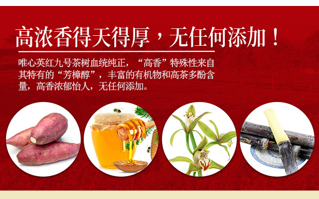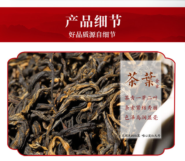 - 不用洗的红茶,唯心英红九号。 产自英德红茶核心区,无公害种植,古法制作,自产自销。外形条索紧直,汤色红艳明亮,香气鲜尚持久,滋味浓厚鲜甘。 试试,你会发现茶汤鲜爽,超值!