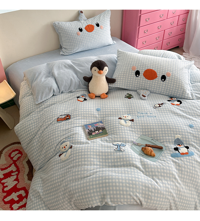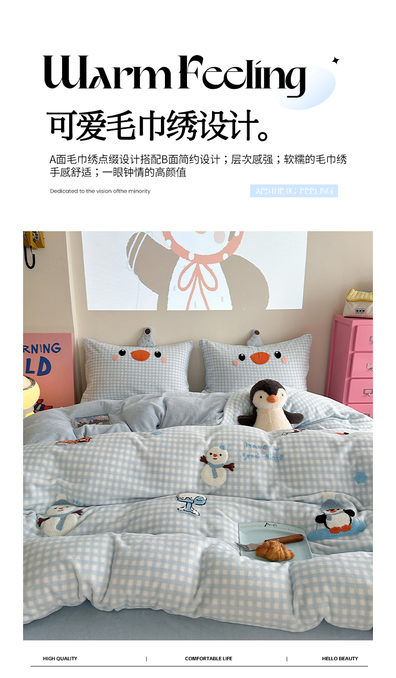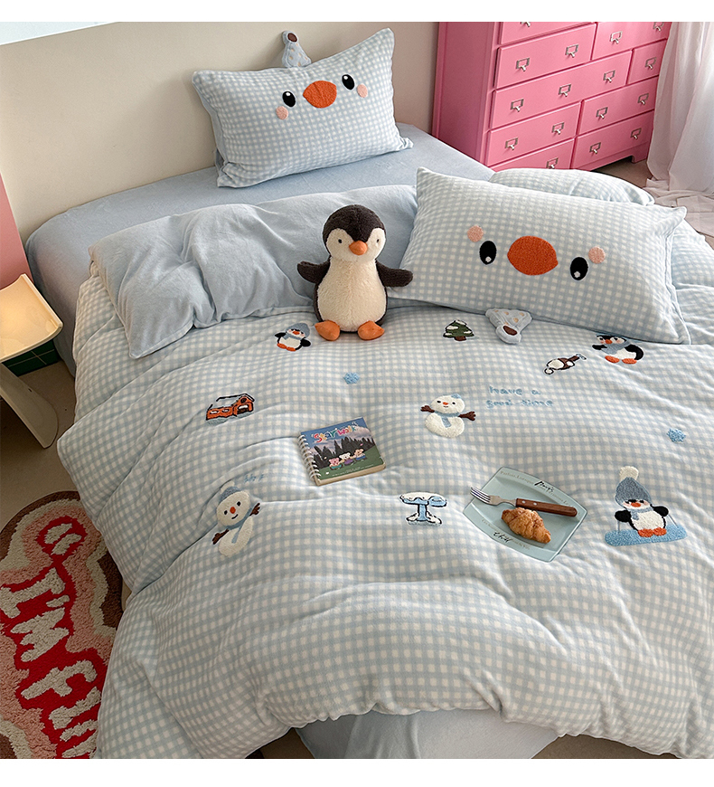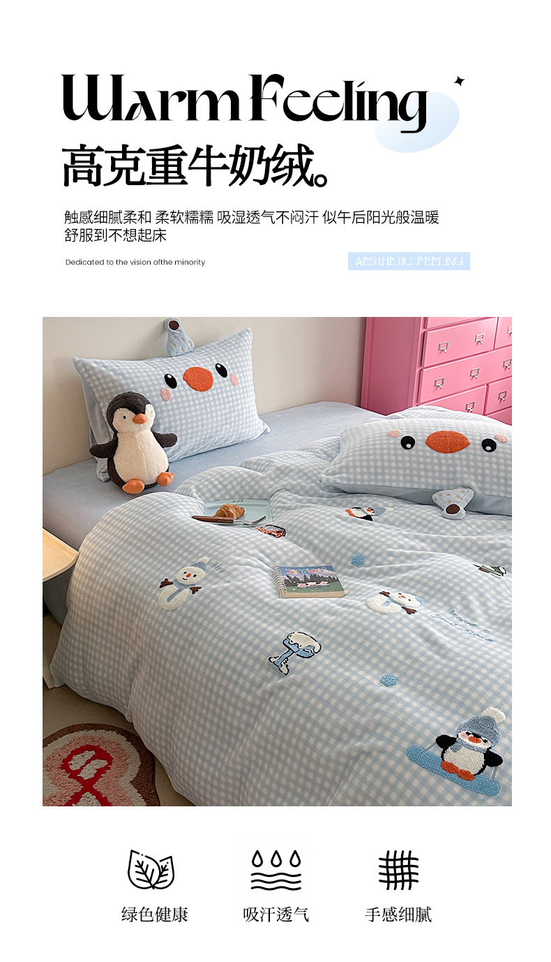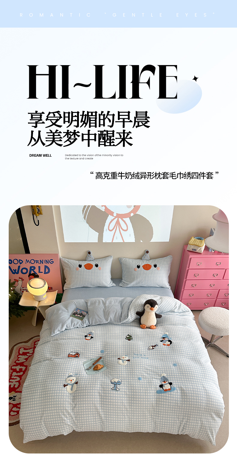 高克重异型牛奶绒绣花卡通四件套 抗静电蓄热保暖牛奶绒套件