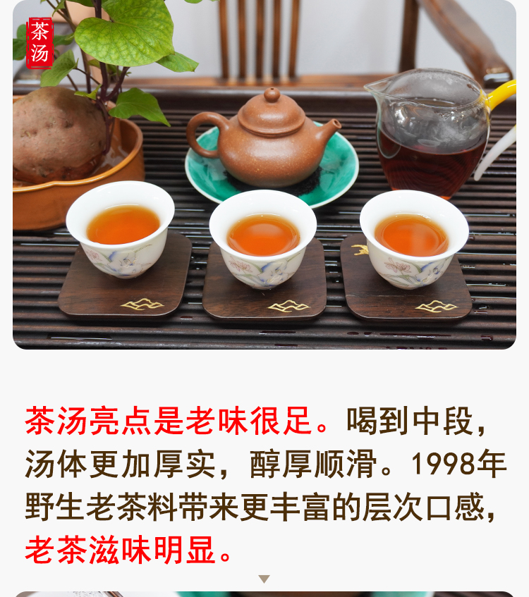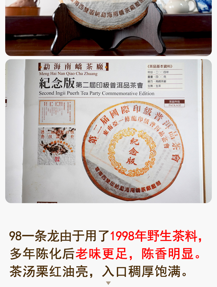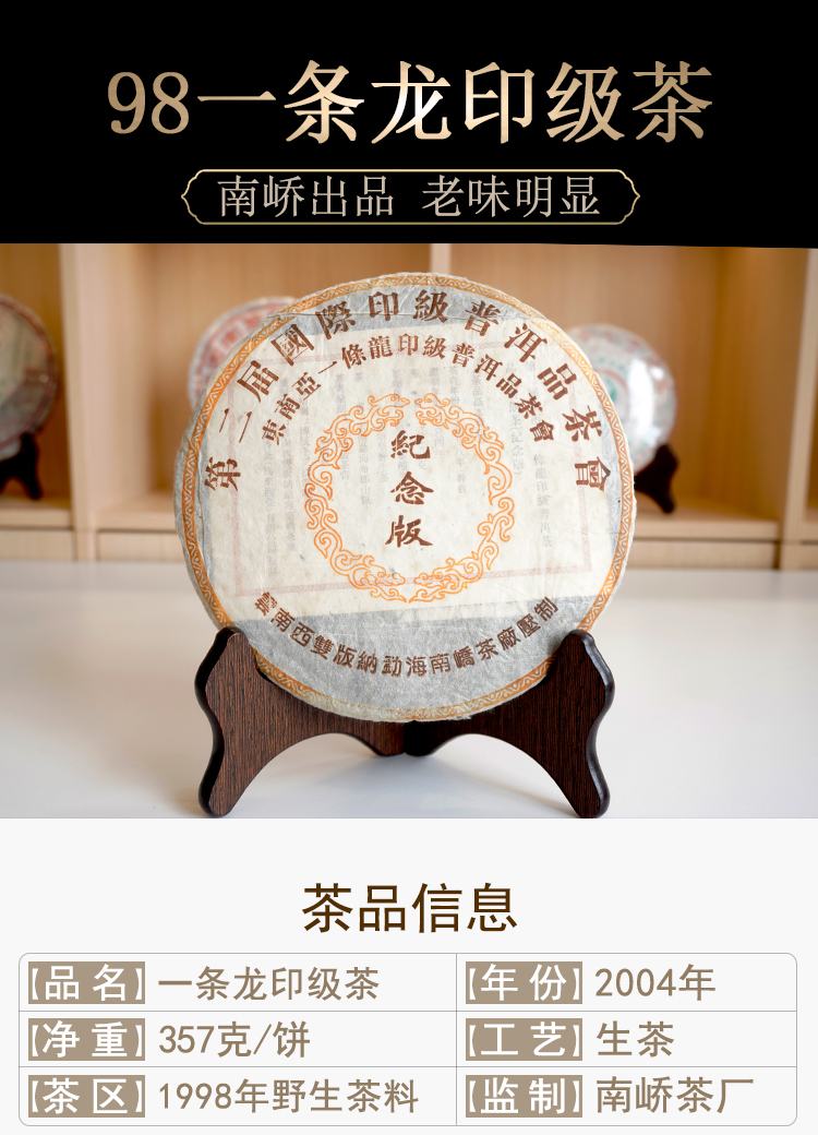 2004年南峤茶厂出厂俗称”印级茶一条龙“1998年老原料压制纪念版 原料好老味不错 回甘比较普通不惊艳 汤感比较柔和顺滑 价格好