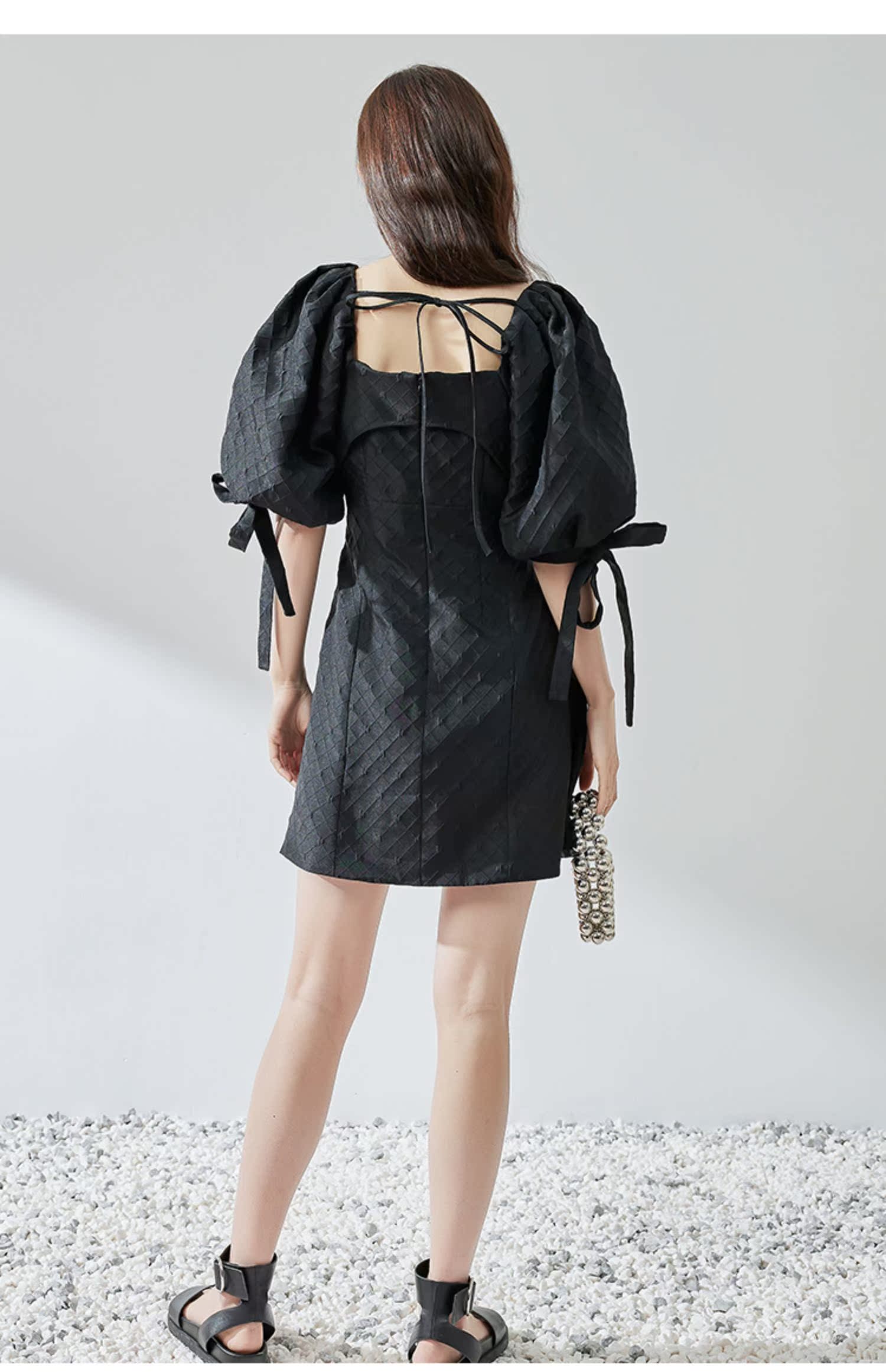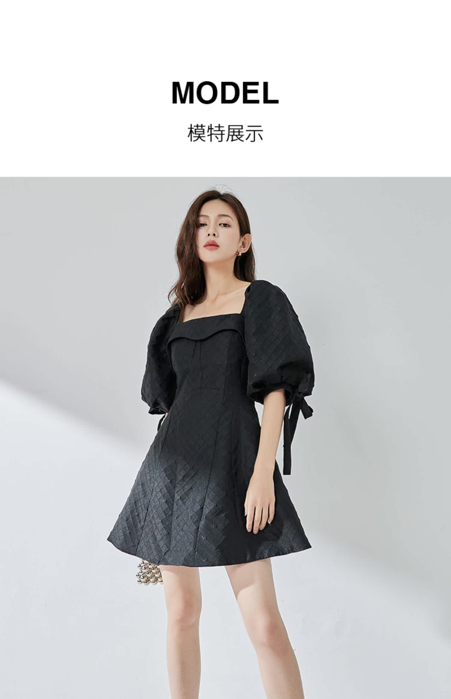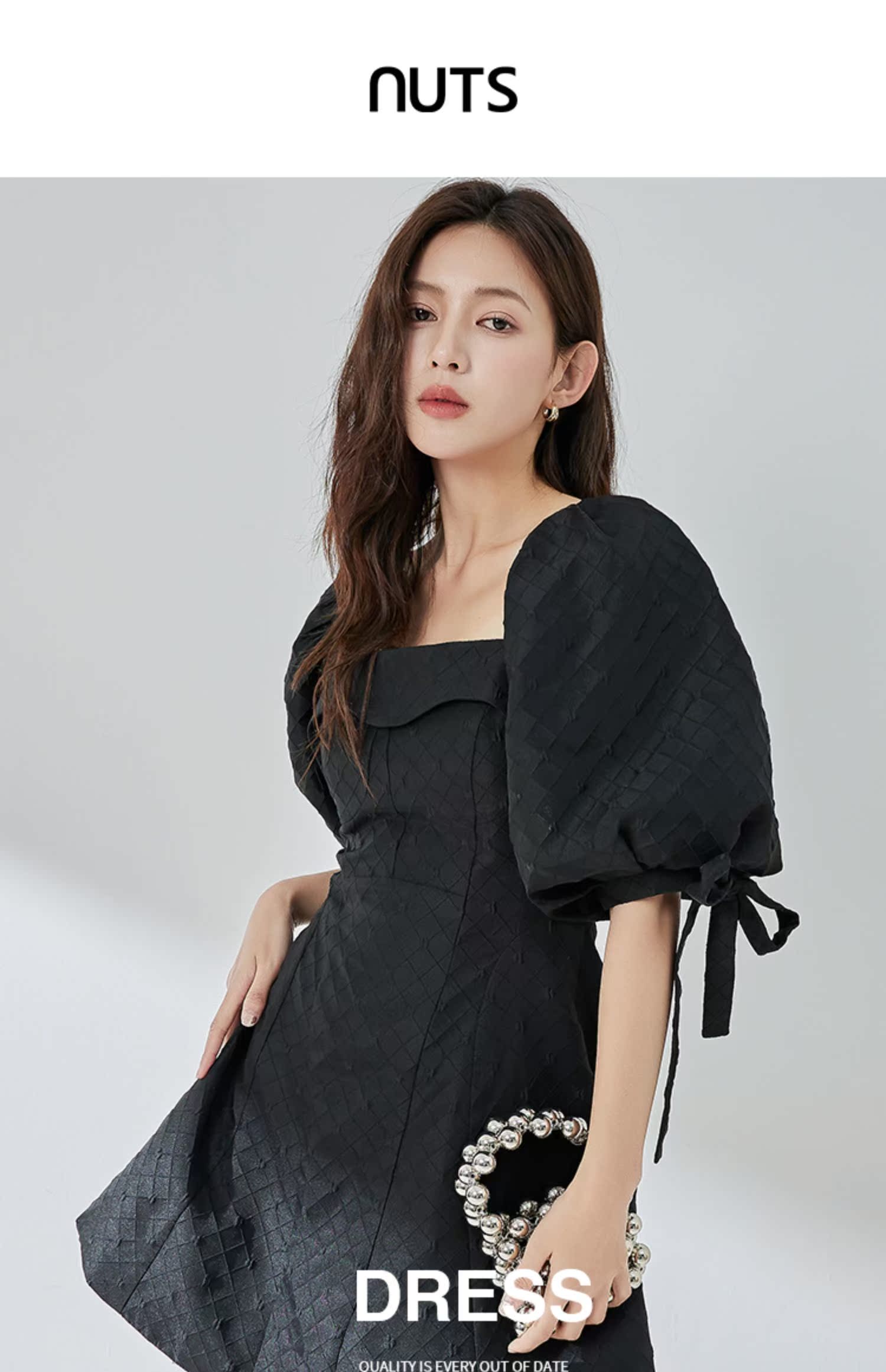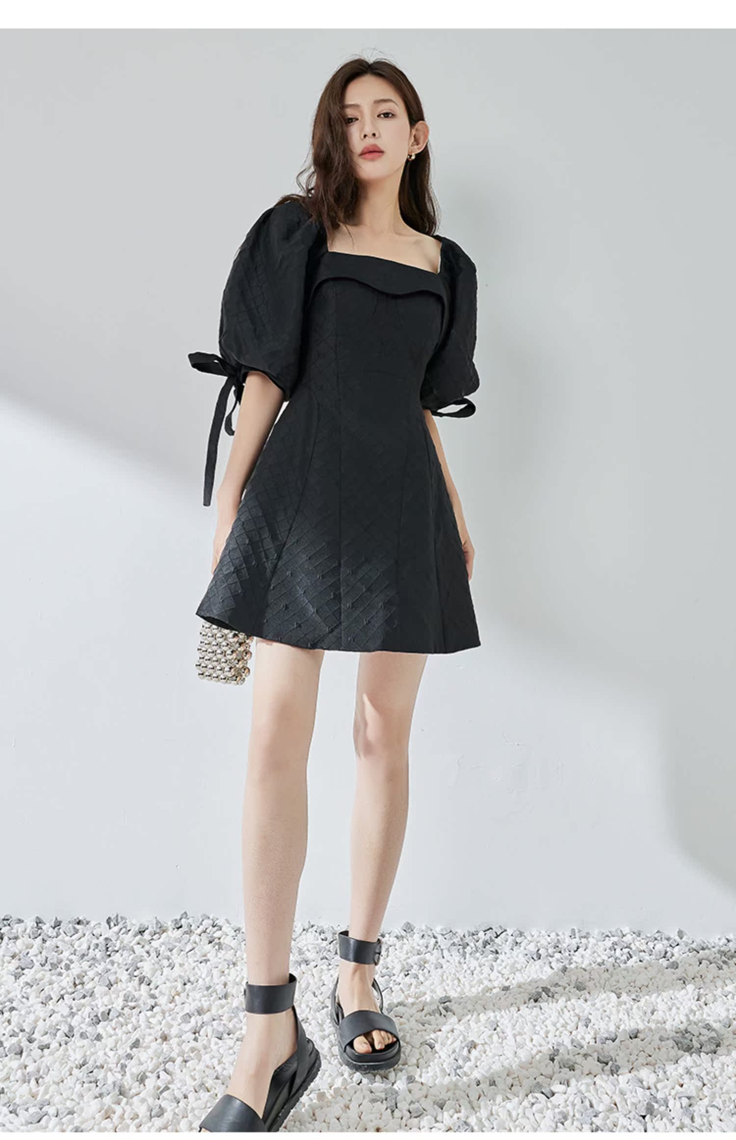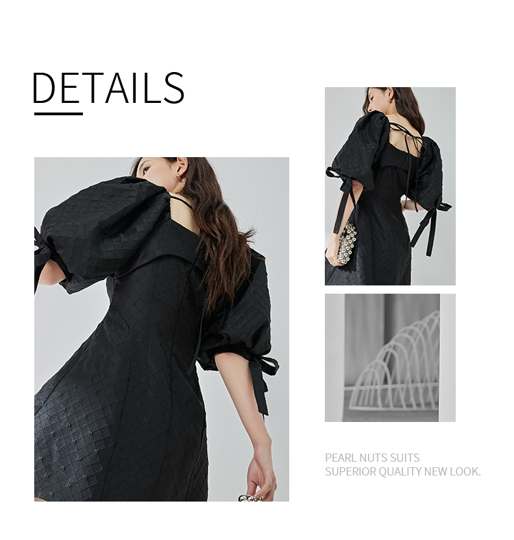 NUTS夏季新品黑色时尚优雅气质方领短袖蝴蝶结显瘦连衣裙324101141B