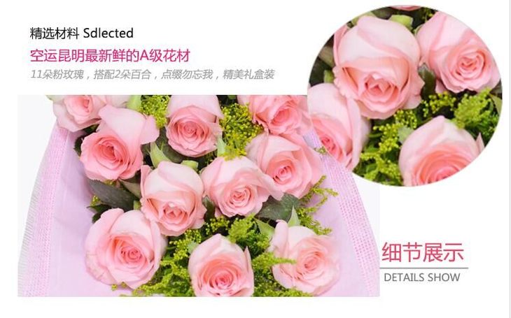 花材:11朵粉玫瑰,2朵白百合,点缀黄莺