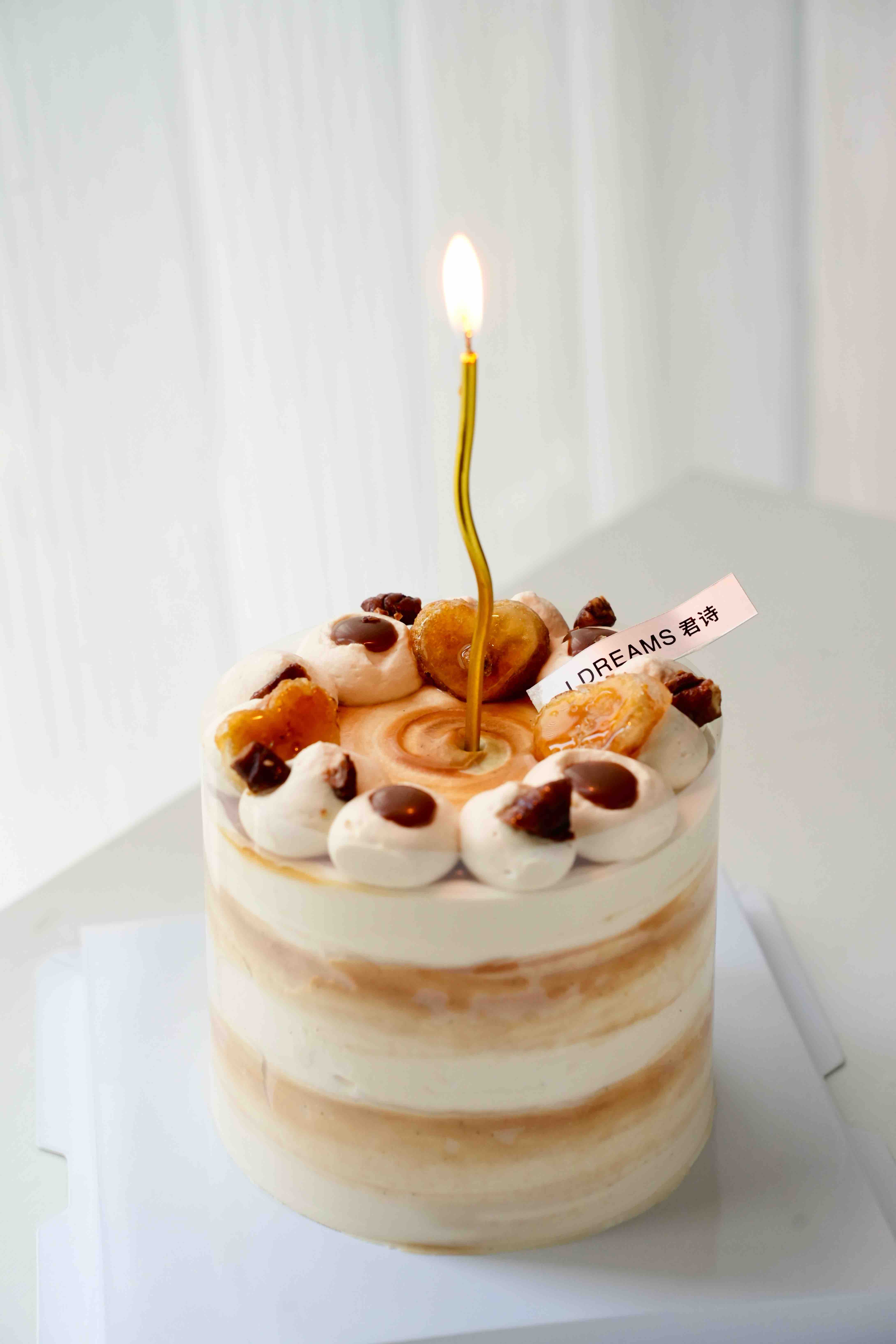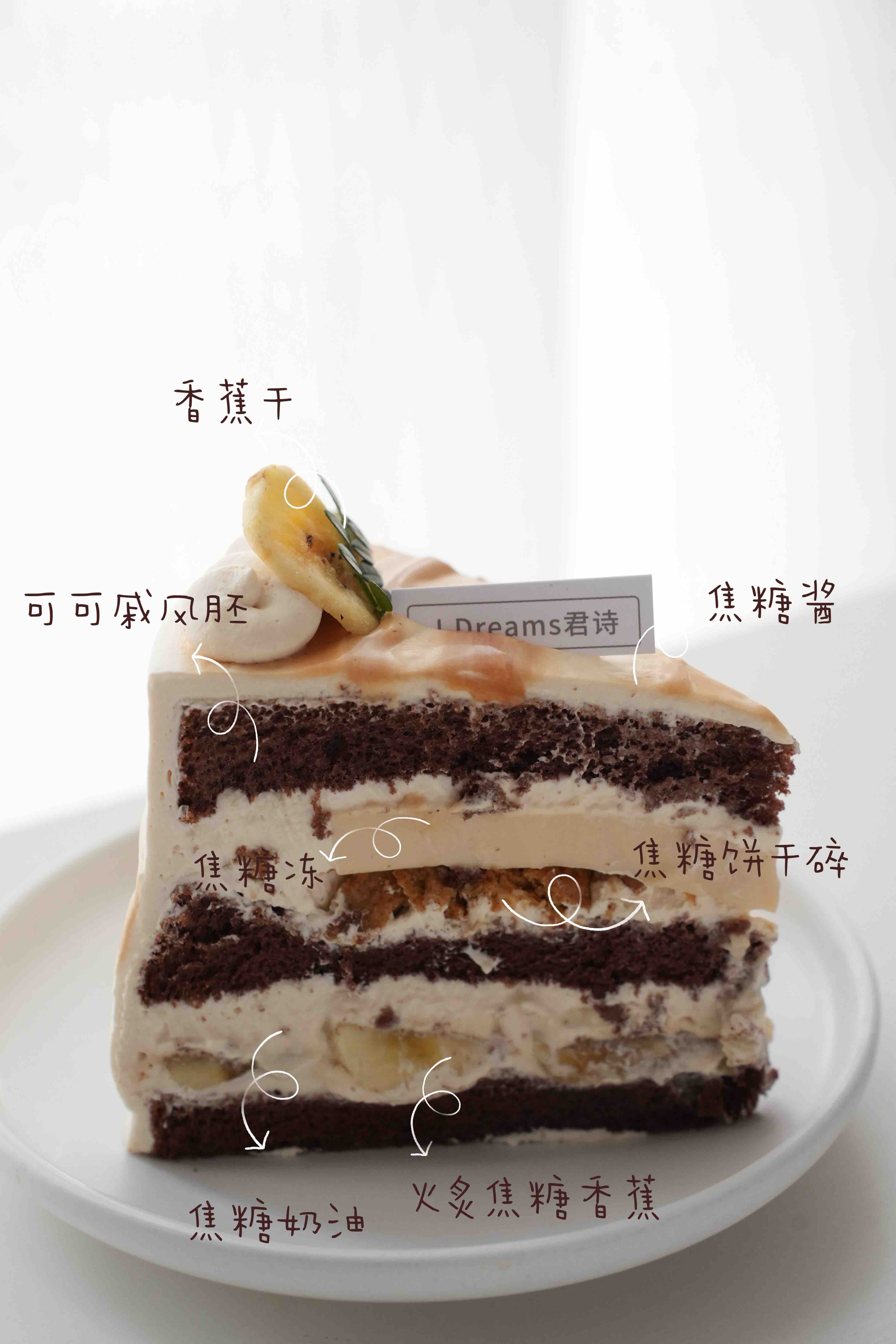 夹心:巧克力胚+焦糖香蕉+焦糖奶冻+焦糖饼干碎,装饰火炙焦糖香蕉、碧根果(展示页首图是最新造型,第二张图是之前的老造型装饰焦糖坚果)