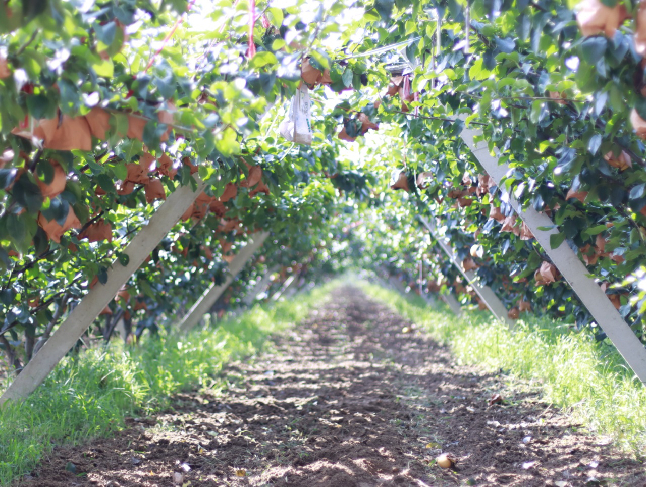 一个个梨子被淡黄色的牛皮纸包裹着营造无菌、防虫、健康的生长环境,虽然费时费力,但隔绝了虫害,果形更优美!受到保护的梨子个头会更大
