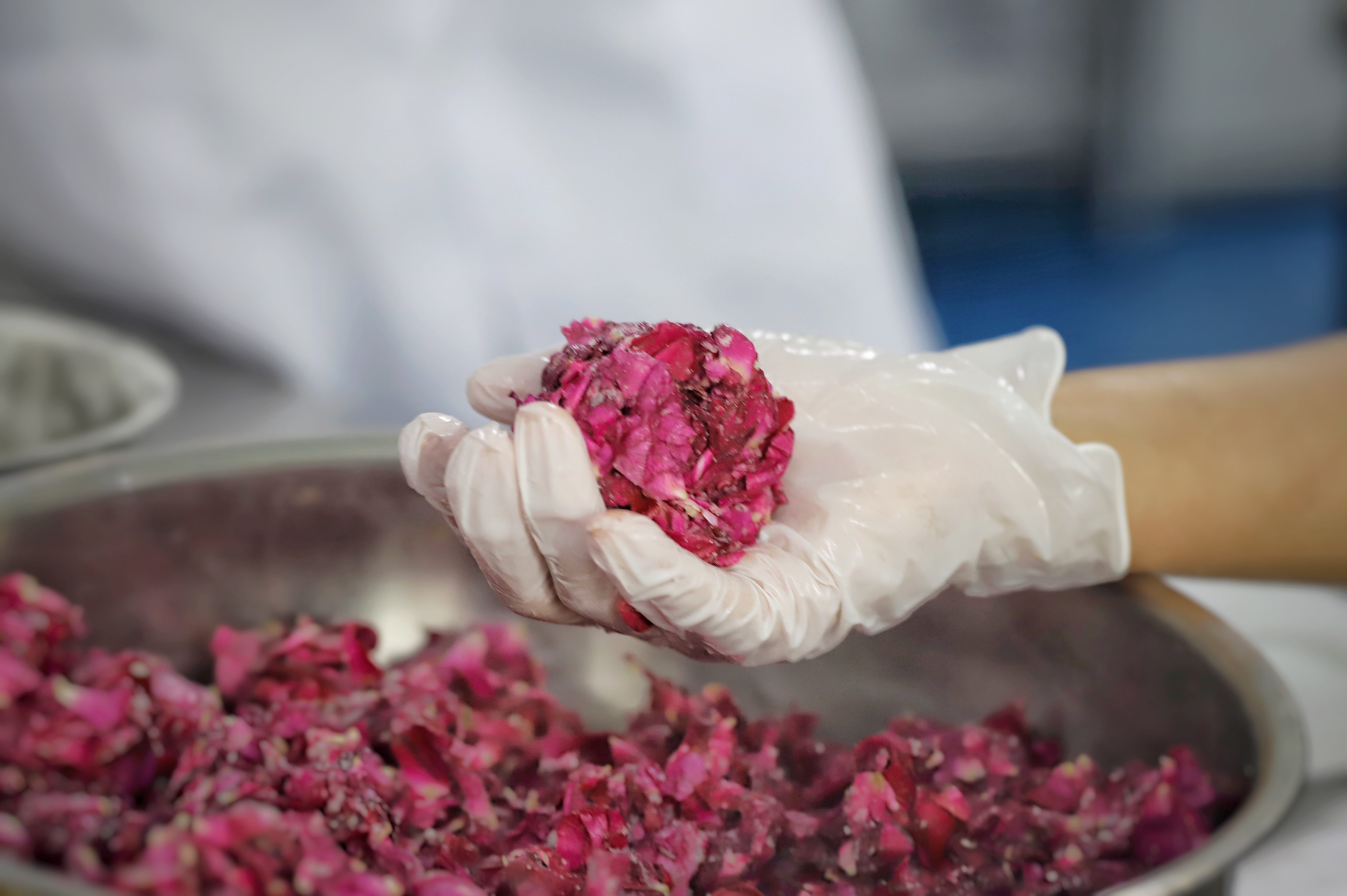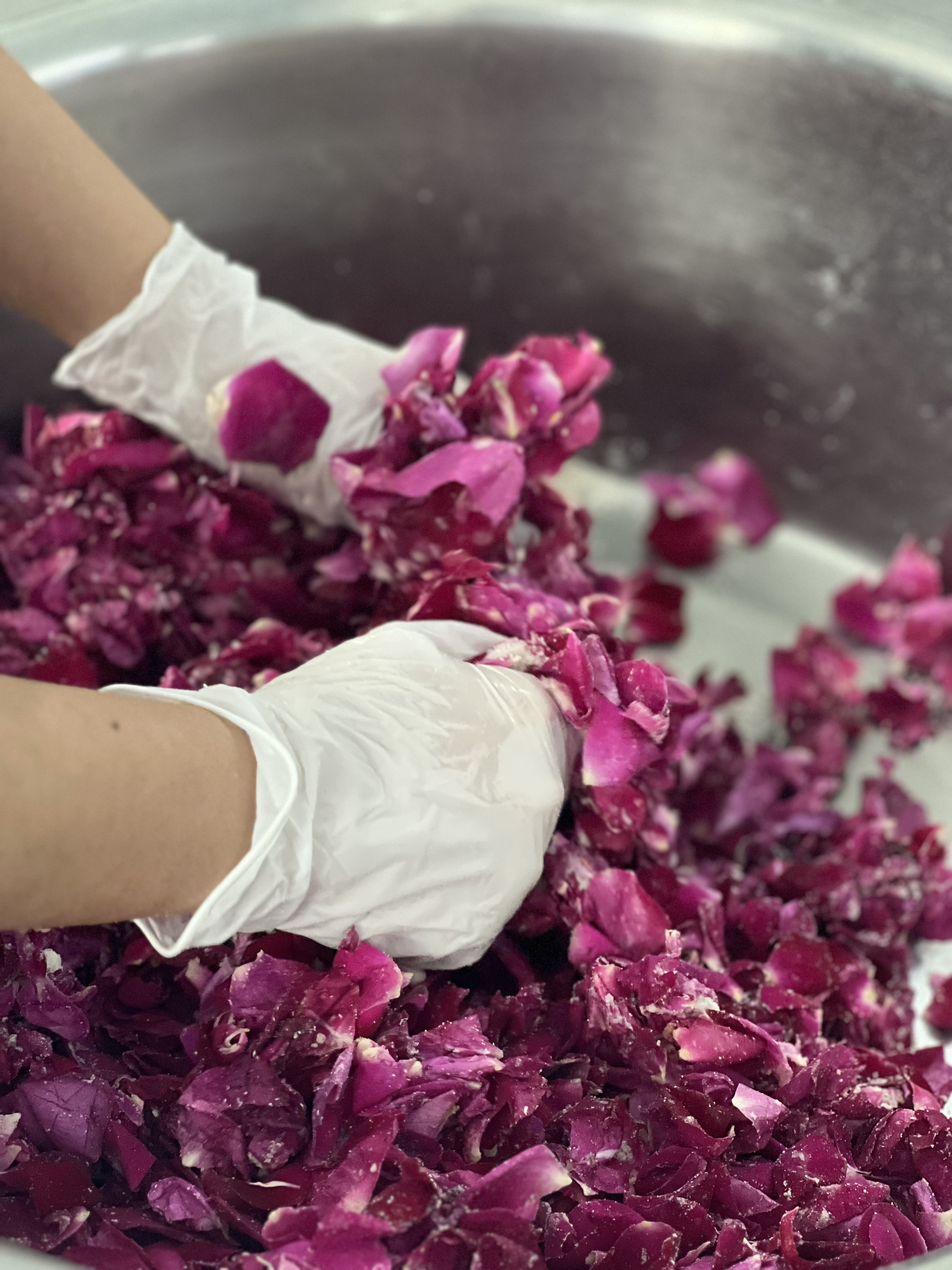 将玫瑰鲜花、白糖、土蜂蜜、猪油揉搓在一起,整个过程需要15分钟左右
