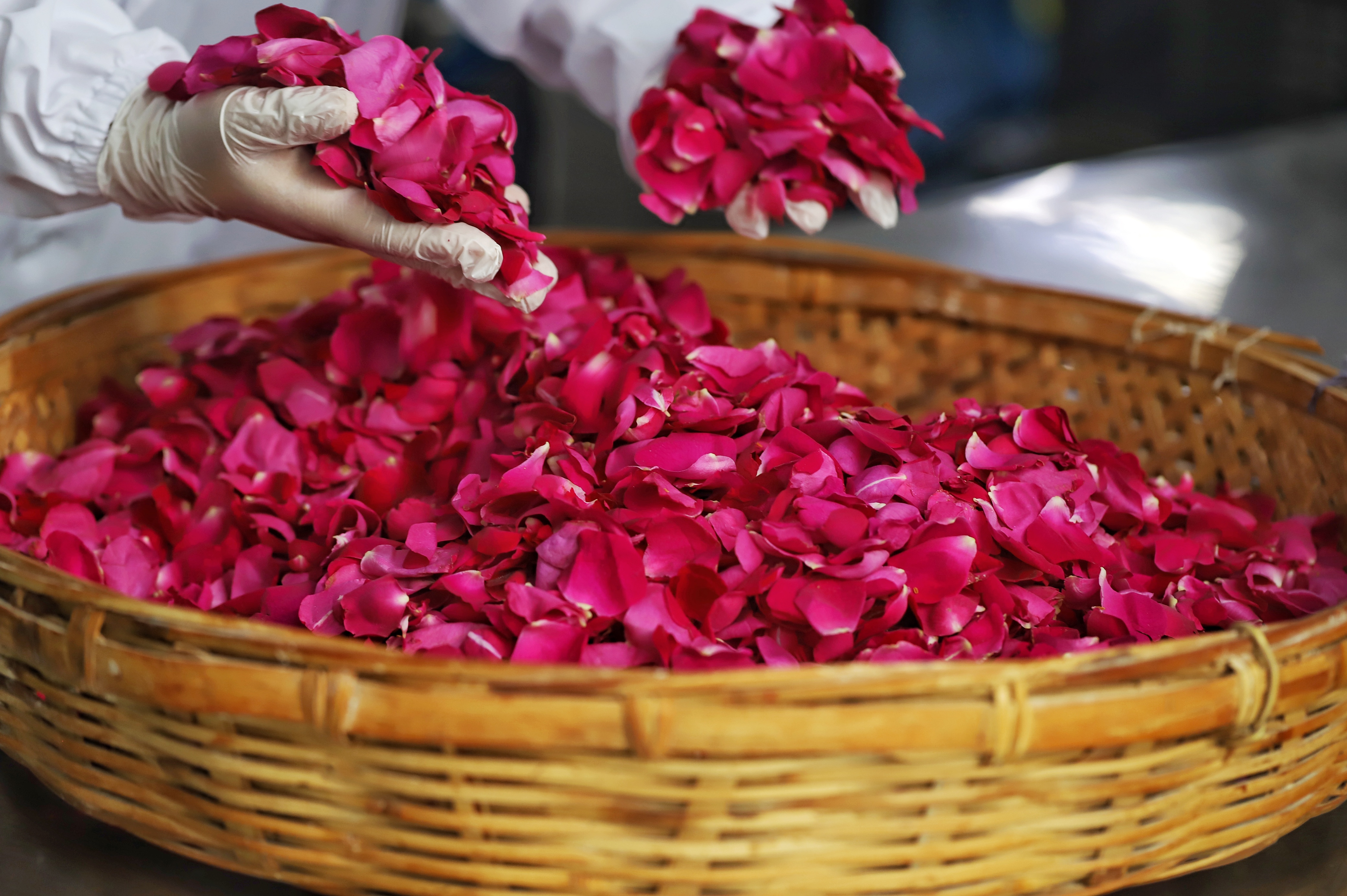 对每日现采的滇红重瓣玫瑰花瓣进行挑拣,选取新鲜、完整、品质好的花瓣作为原料