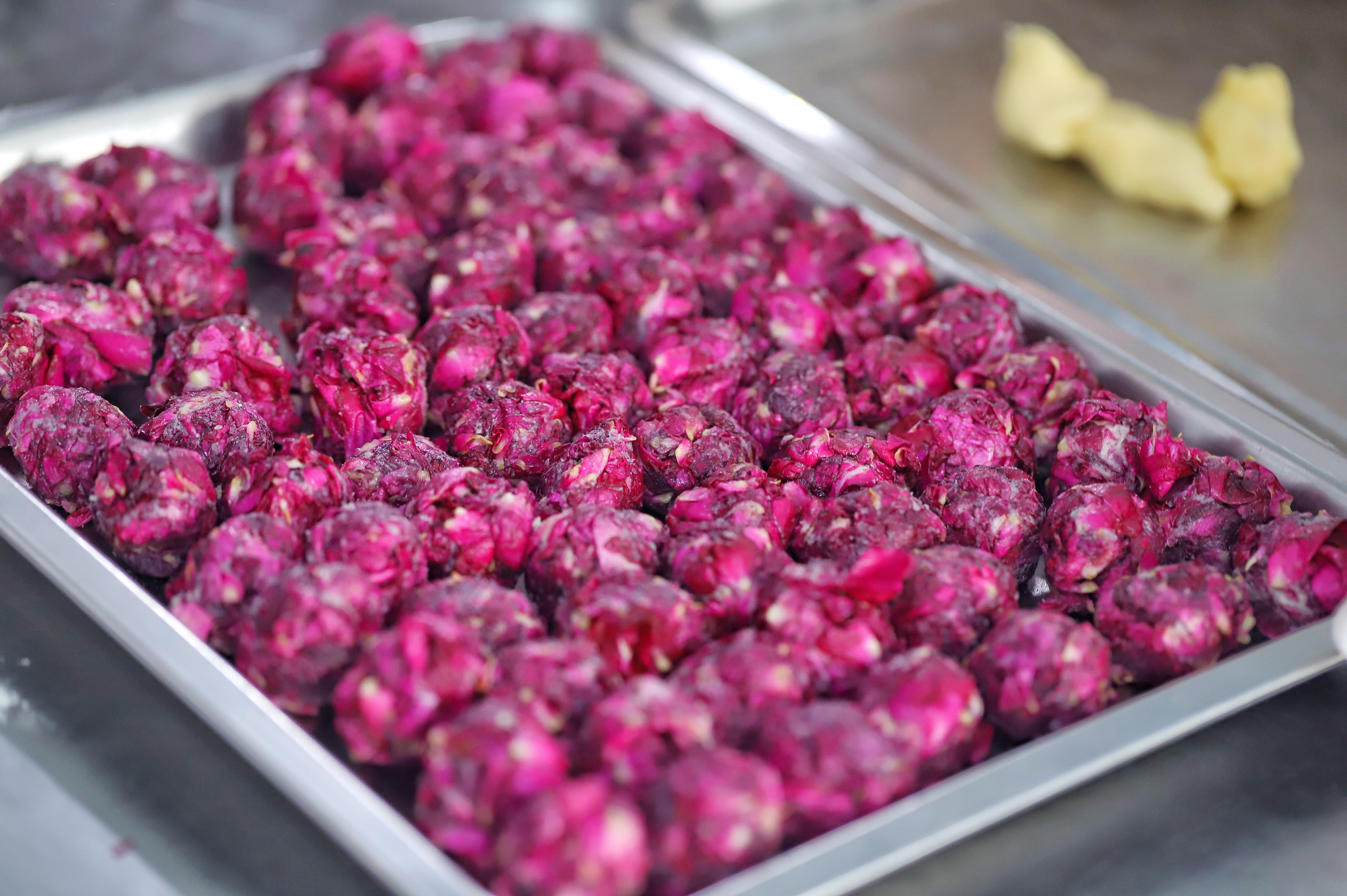 采摘自海拔1900米的昆明市安宁八街小陡山玫瑰庄园(滇红重瓣玫瑰花核心产地)晨露玫瑰,这里拥有其他区域无法比拟的优势—四季如春的气候,优质充沛的日照,高氧含量的种植环境。为保留花瓣的浓郁香气,清晨就要开始采摘鲜花。采摘后层层挑选,当天制作入馅,保证新鲜、本味的口感。