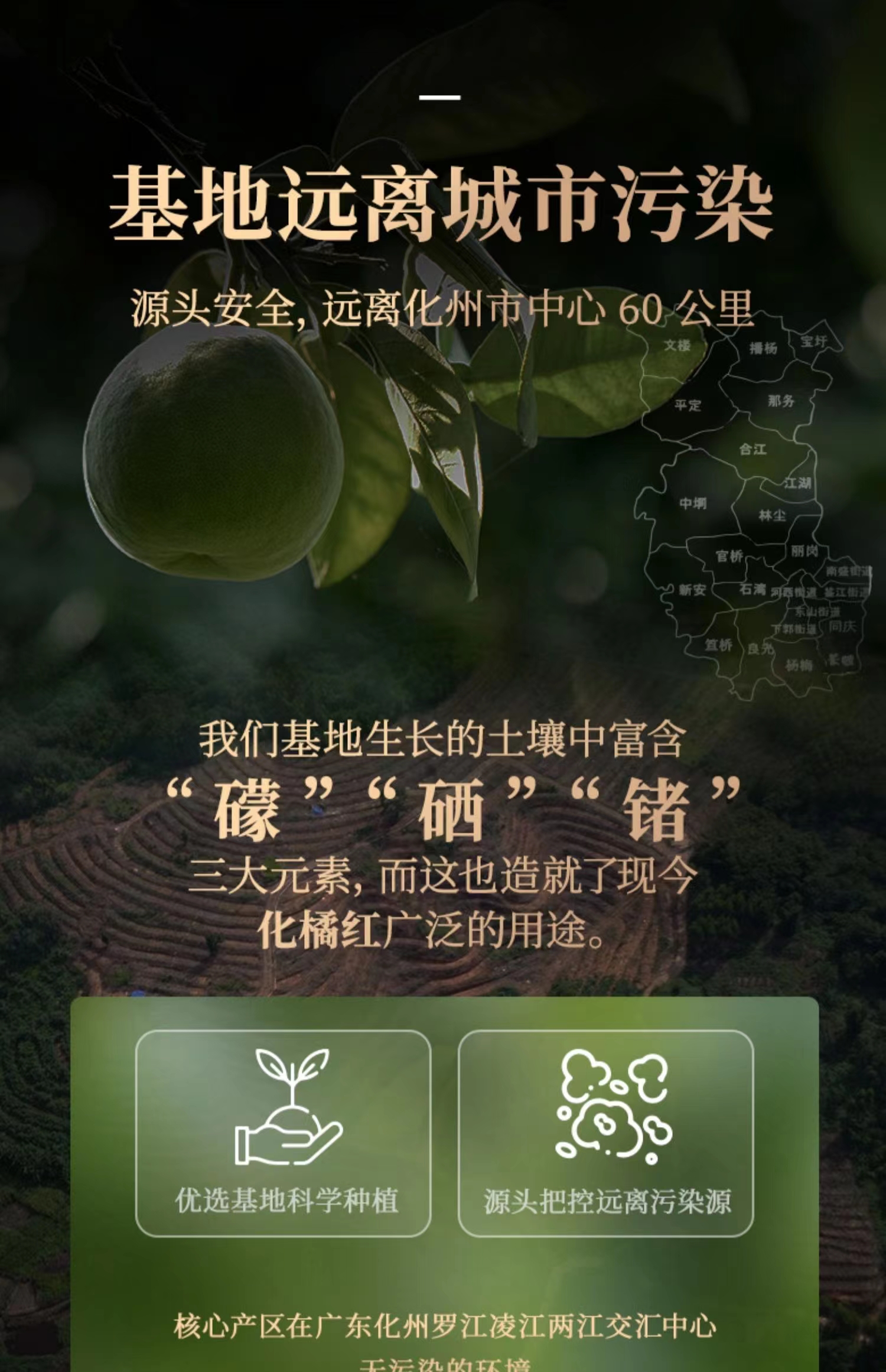 化州市地处亚热带,气候温和,热量丰富,平均气温21℃,全年光照达2500小时以上,雨量充沛,年均降雨量1900毫米,土地肥沃,原始植被属自然生态群落亚热带山地砖红壤,发育于石、砂页岩。化州市种植化橘红的土壤属偏酸性赤红土壤,pH在5.5-6.5之间,土壤结构良好,有机质≥2%,富含礞脱石、Mn、Mg、Fe、Ti等微量元素,山地土壤淋溶作用较为强烈,地理环境条件优越。在这样的环境条件下,加上悠久种植形成的科学栽培技术,使化橘红营养成分高。