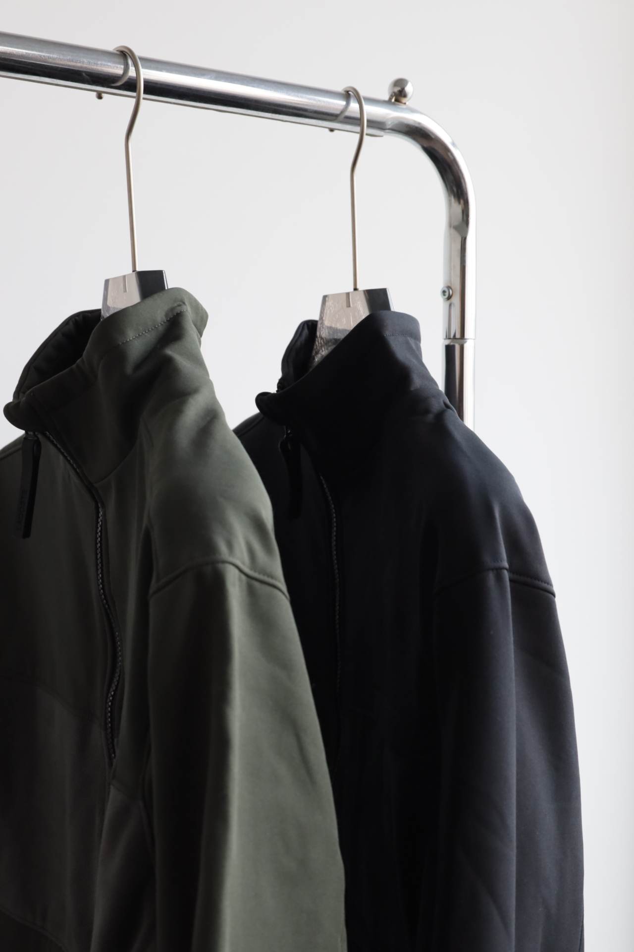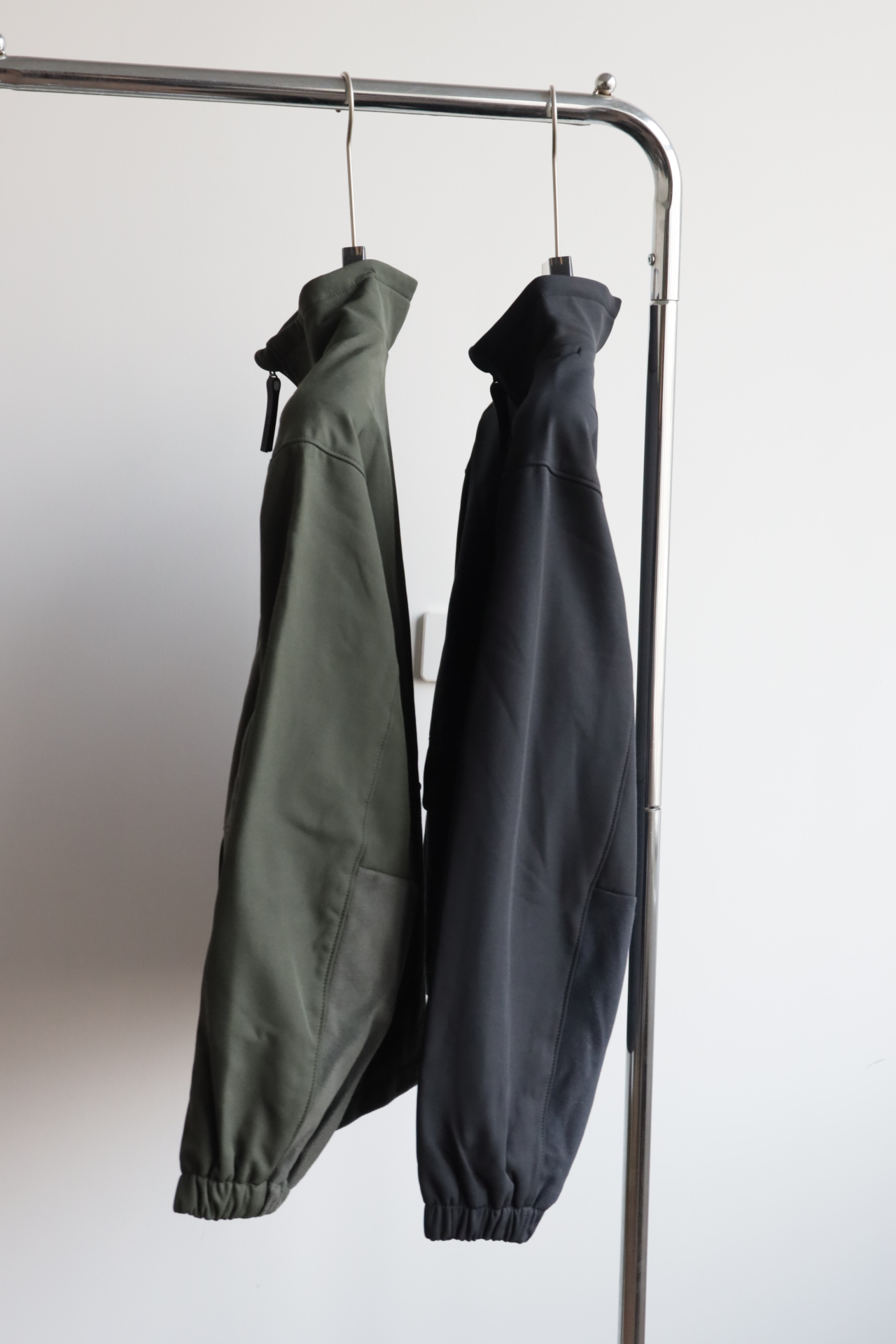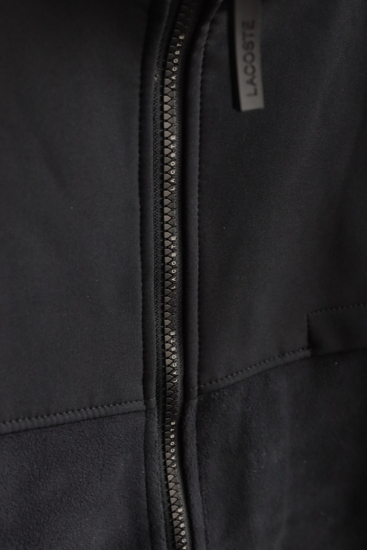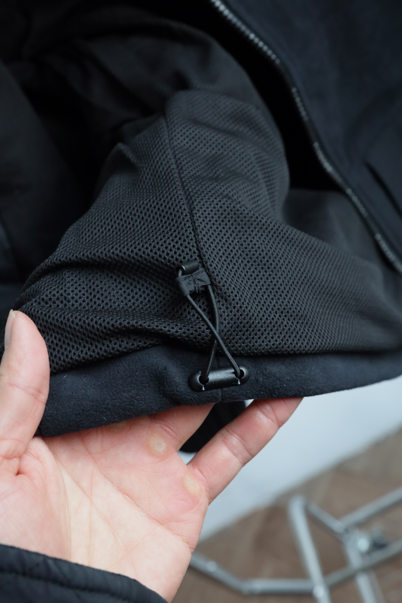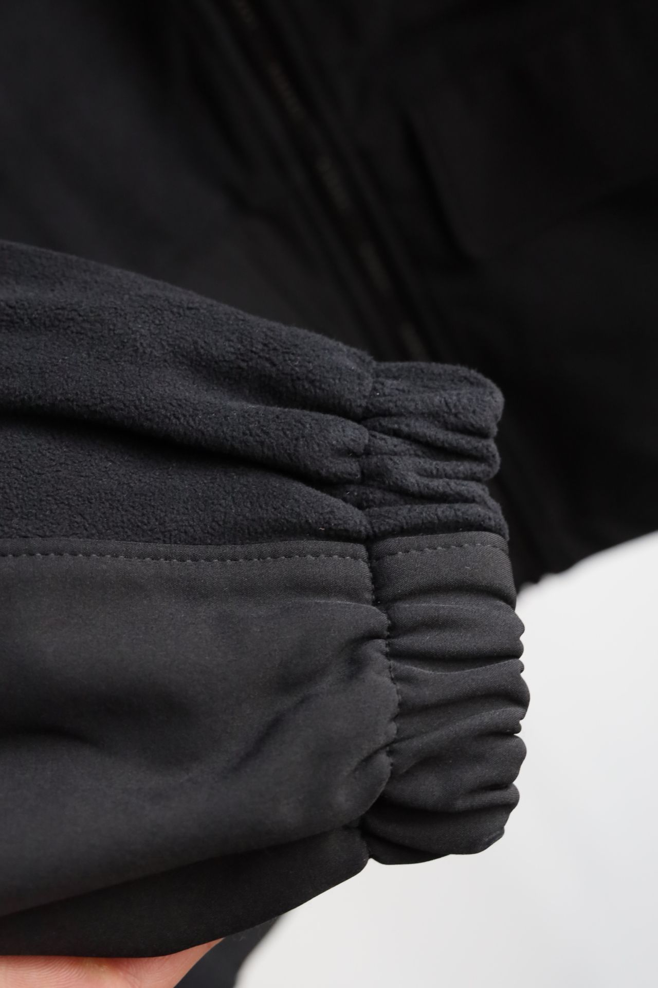 衣身巧妙运用同色系不同质感的面料拼接(梭织与摇粒绒)打破单调,塑造出清晰的色块轮廓