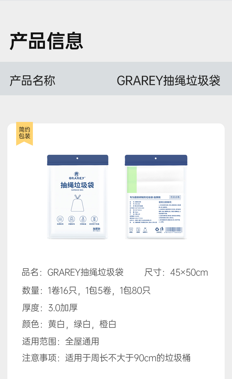 GRAREY 抽绳垃圾袋 3.0加厚版本 专为厨房研制的垃圾袋 高品质 高颜值