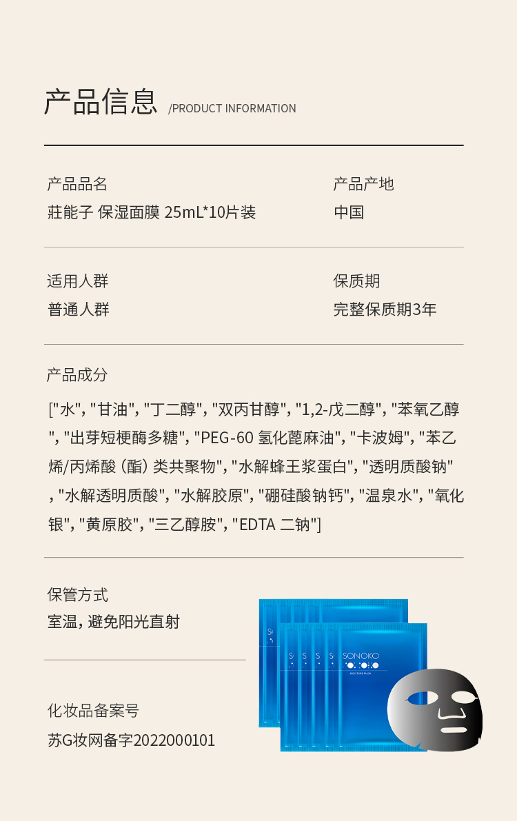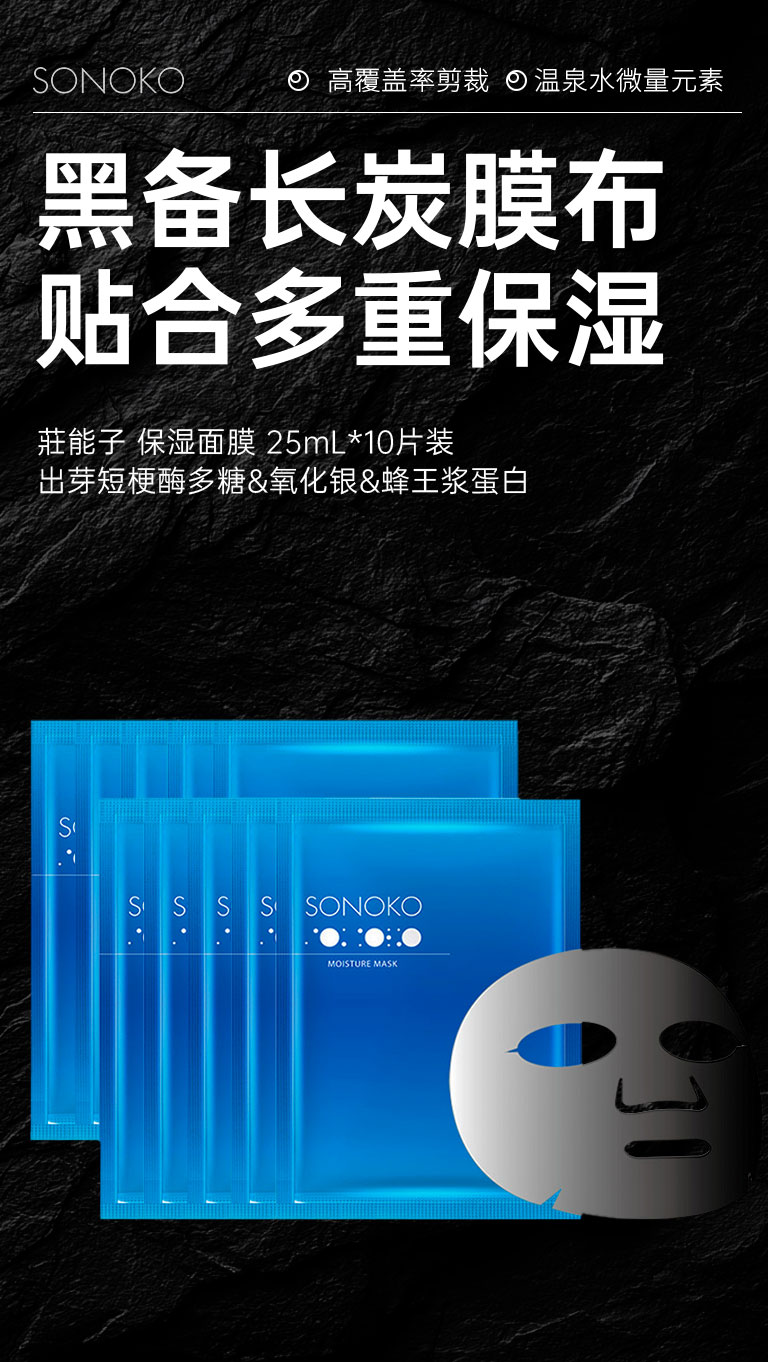SONOKO 荘能子 保湿面膜 25mL单片*10片组 日本技术中国制造 出芽短梗酶多糖&氧化银技术