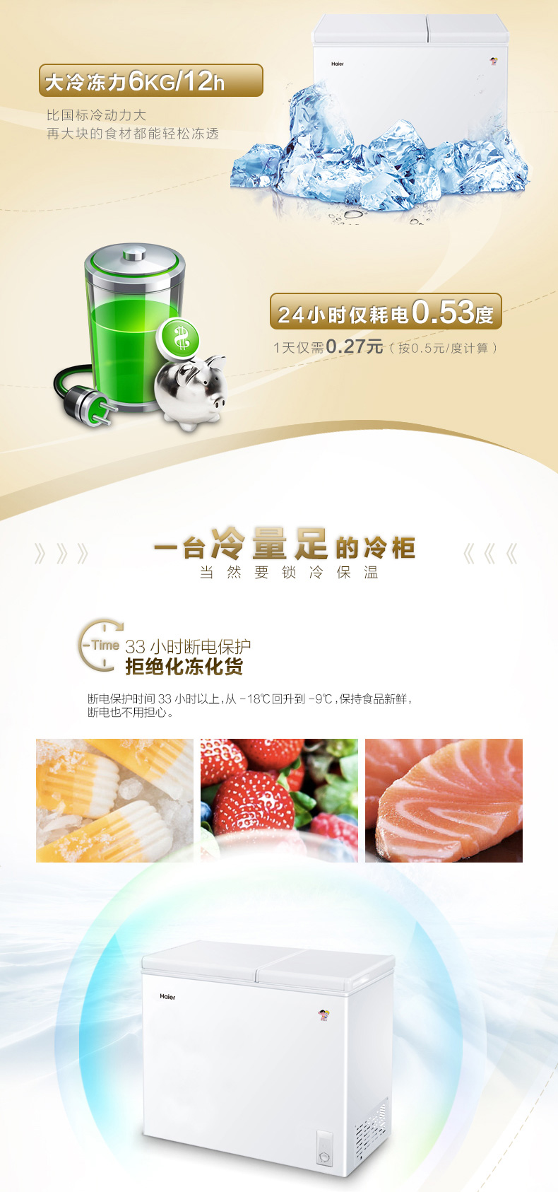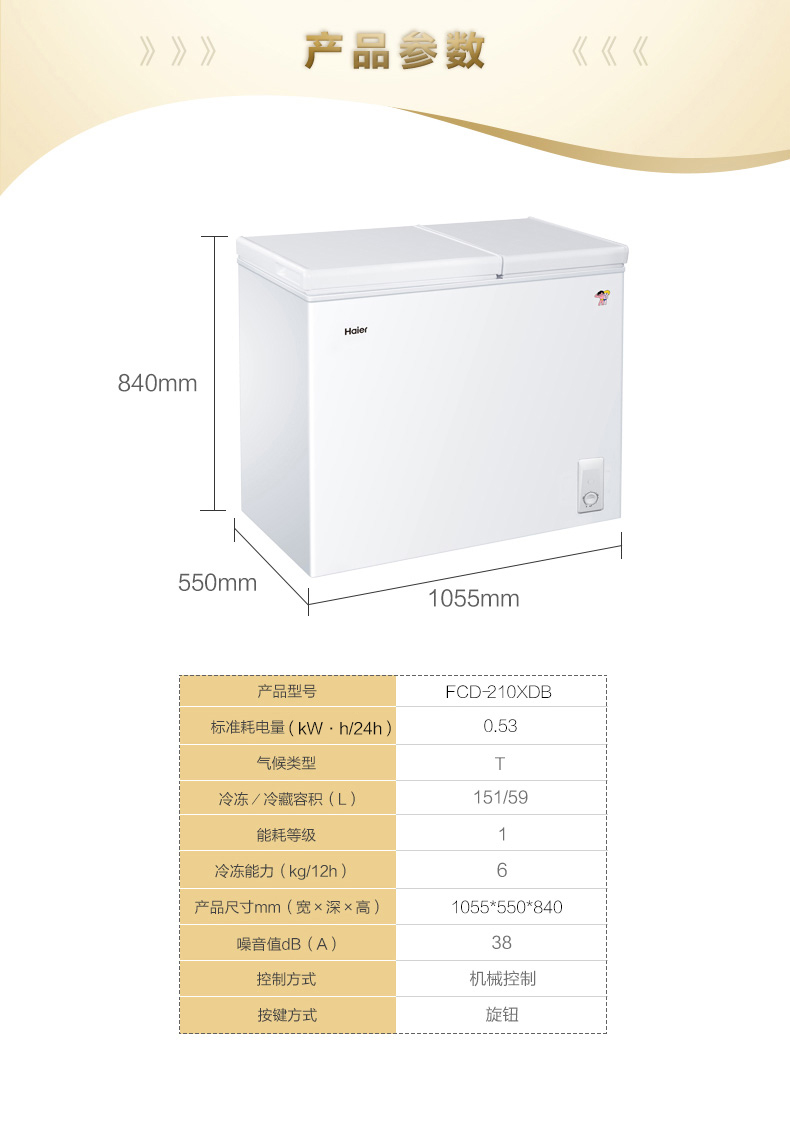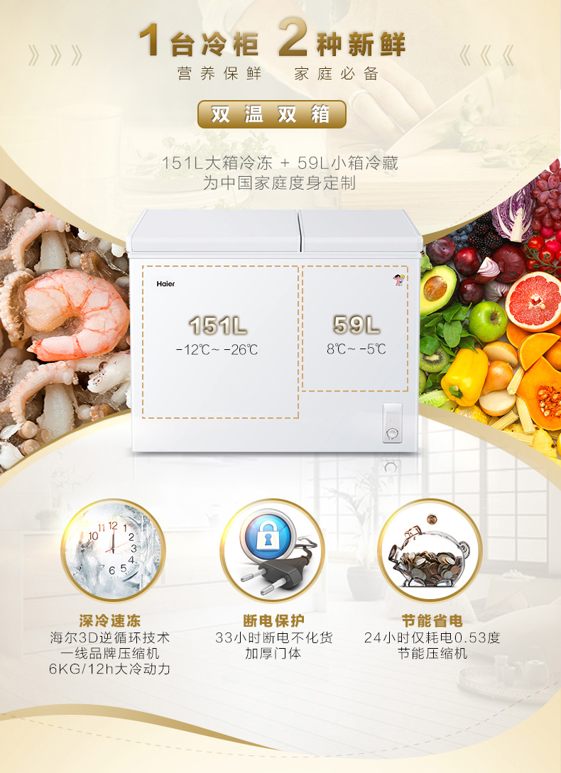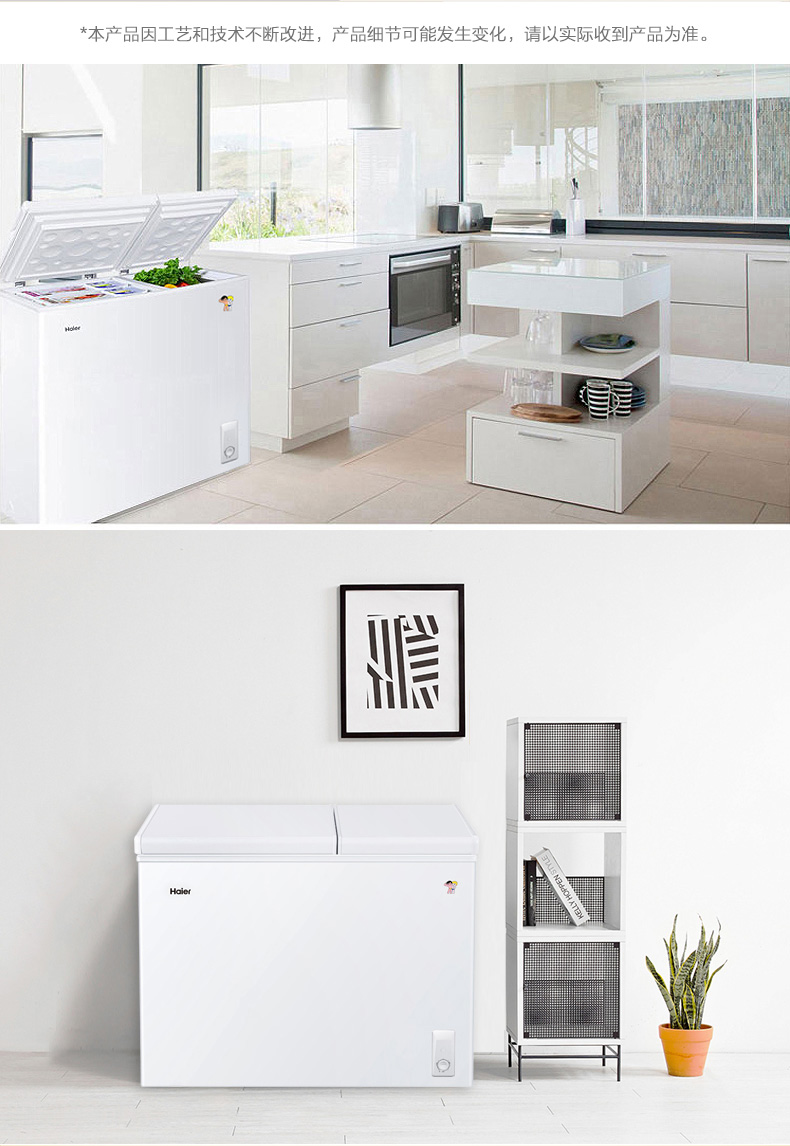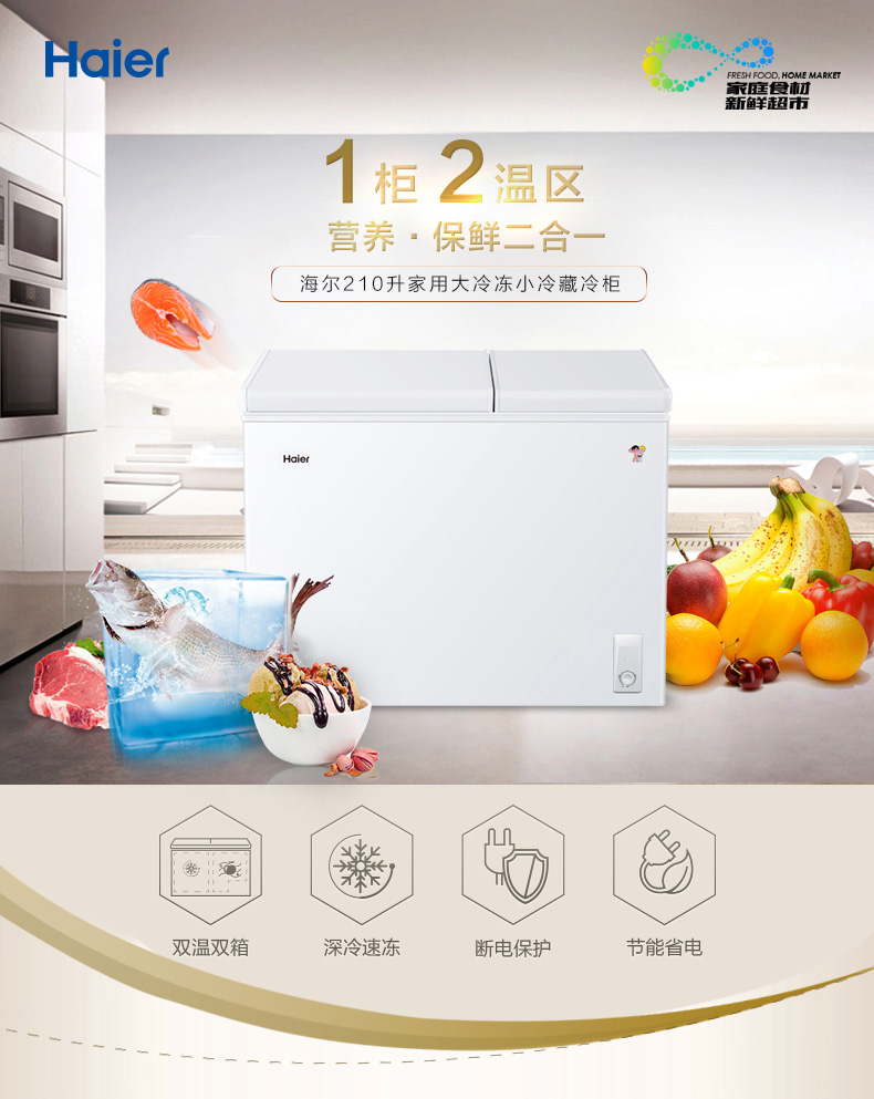 海尔(Haier) 210升 大冷冻小冷藏 家用商用二合一 冷柜 双箱双温区 冰柜 卧式冰箱 FCD-210XDB
