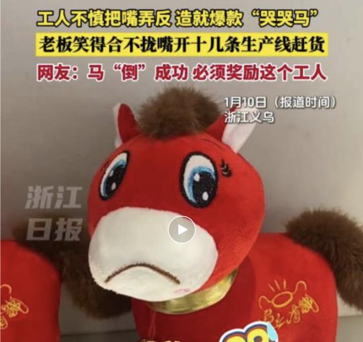 浙江杭州网友意外购入,一只嘴部缝反的马年公仔,并将其购买经历,分享至社交平台后该公仔走红,且被网友戏称为隐藏款“哭哭马”。