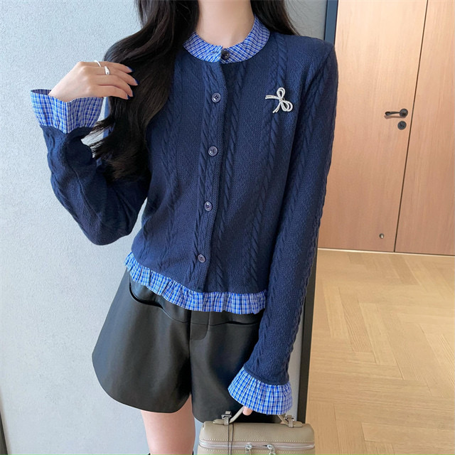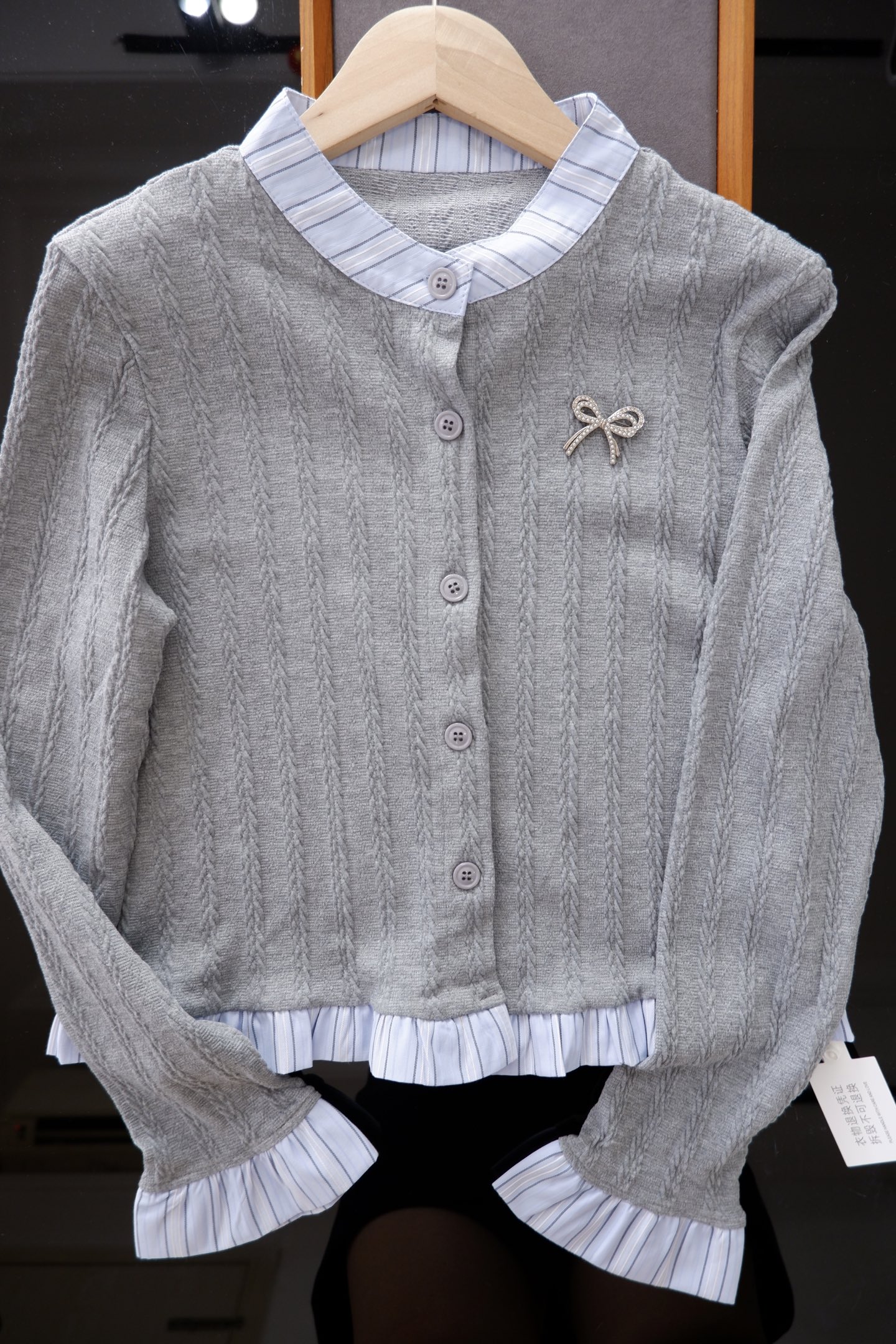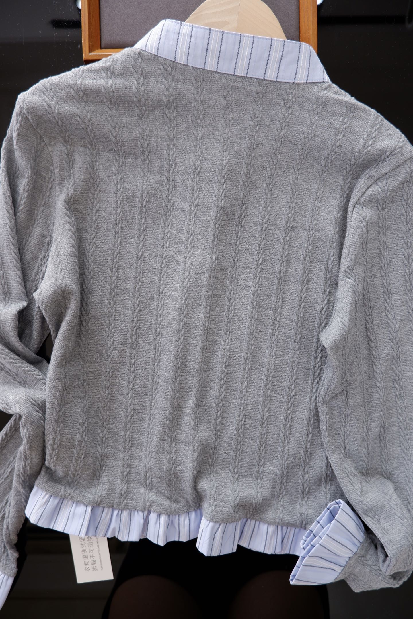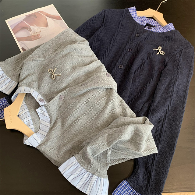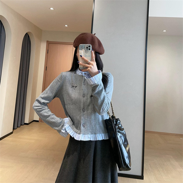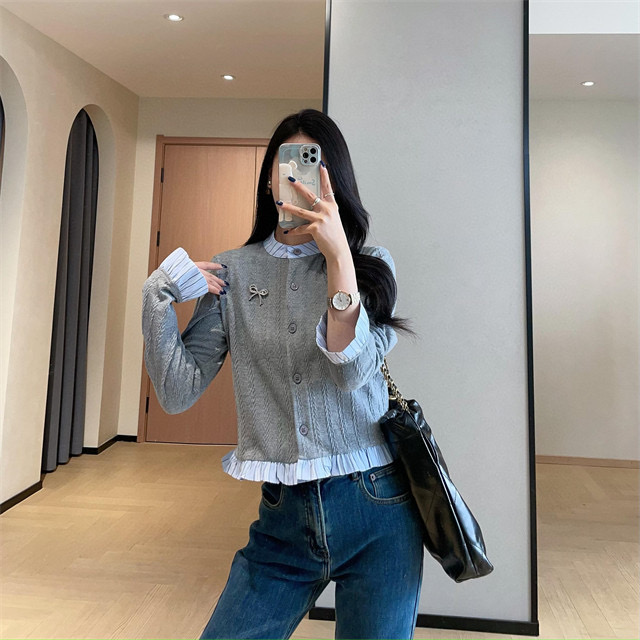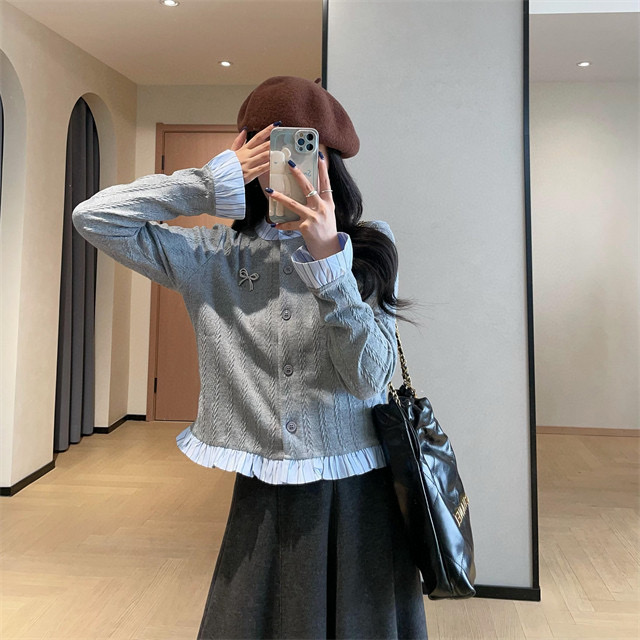 💰79元包邮, 【9512】miu系 设计感假两件法式开衫荷叶边上衣(送蝴蝶别针) 复古优雅T恤打造毫不费力的通勤穿搭颜色:灰色 藏蓝色