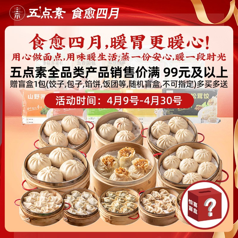 赠品:盲盒1包(五点素饺子、包子、馅饼、饭团等,随机盲盒,不可指定)多买多送