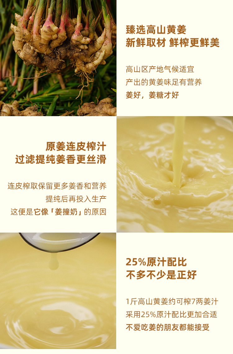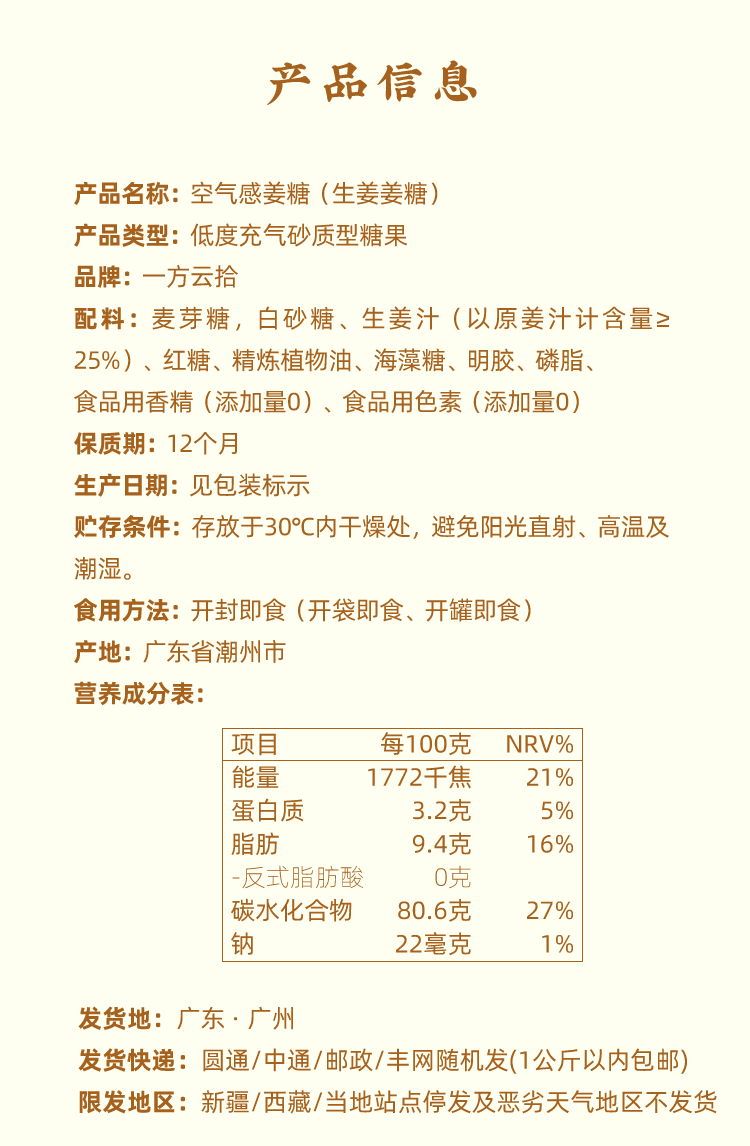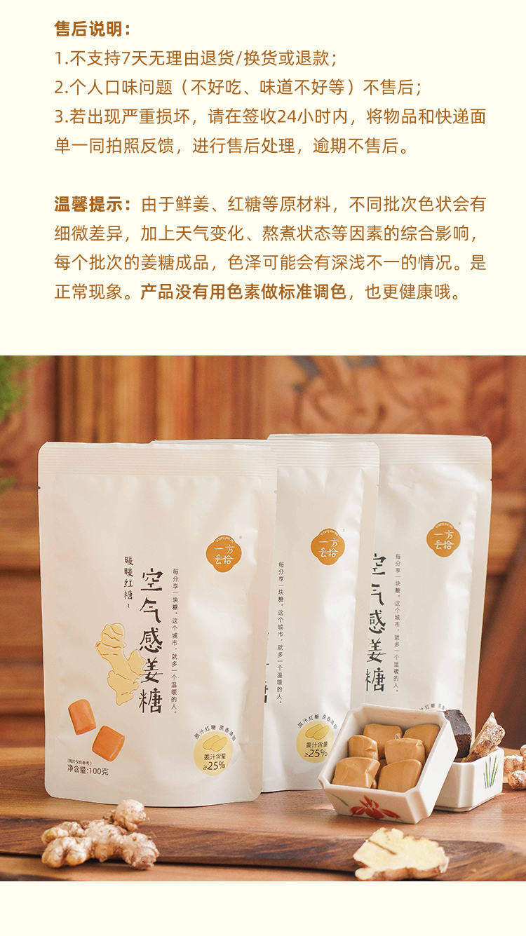温馨提示:由于鲜姜、红糖等原材料,不同批次色状会有细微差异,加上天气变化、熬煮状态等因素的综合影响,每个批次的姜糖成品,色泽可能会有深浅不一的情况。是正常现象。产品没有用色素做标准调色,也更健康哦。