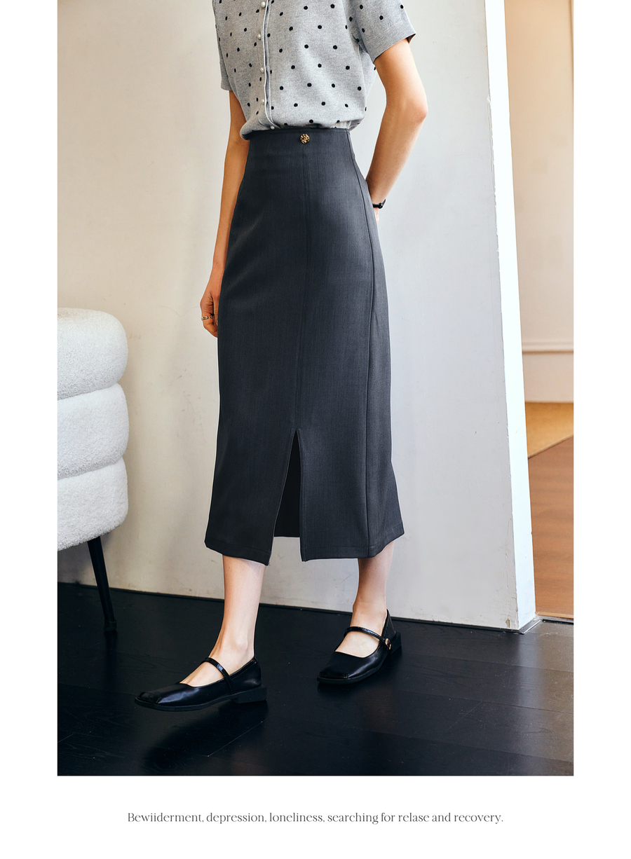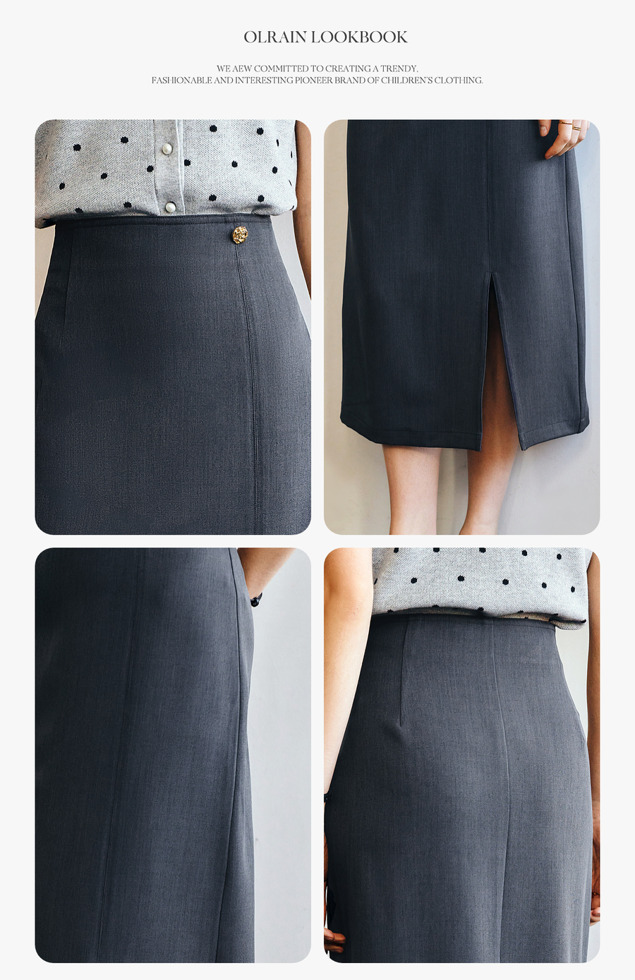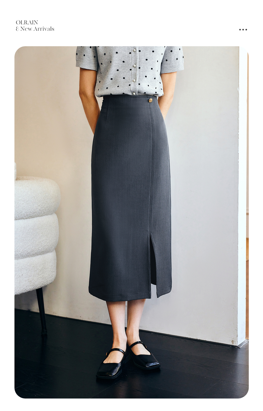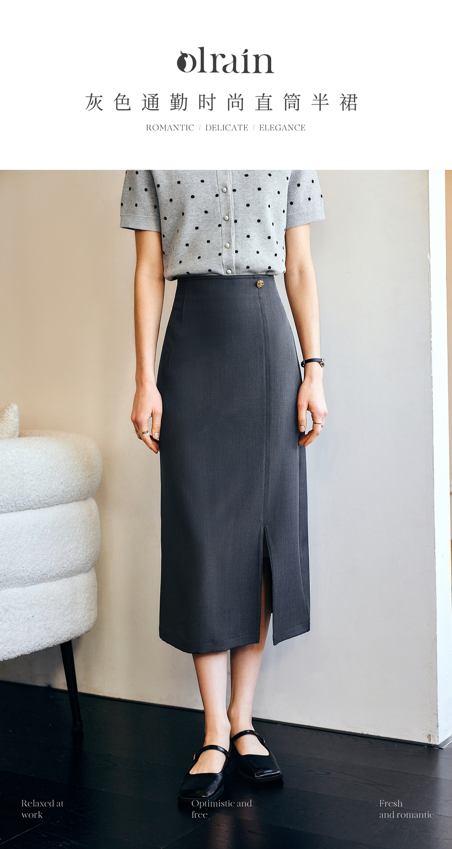 OLrain欧芮儿灰色直筒半身裙女春季2025新款通勤设计感开叉半裙