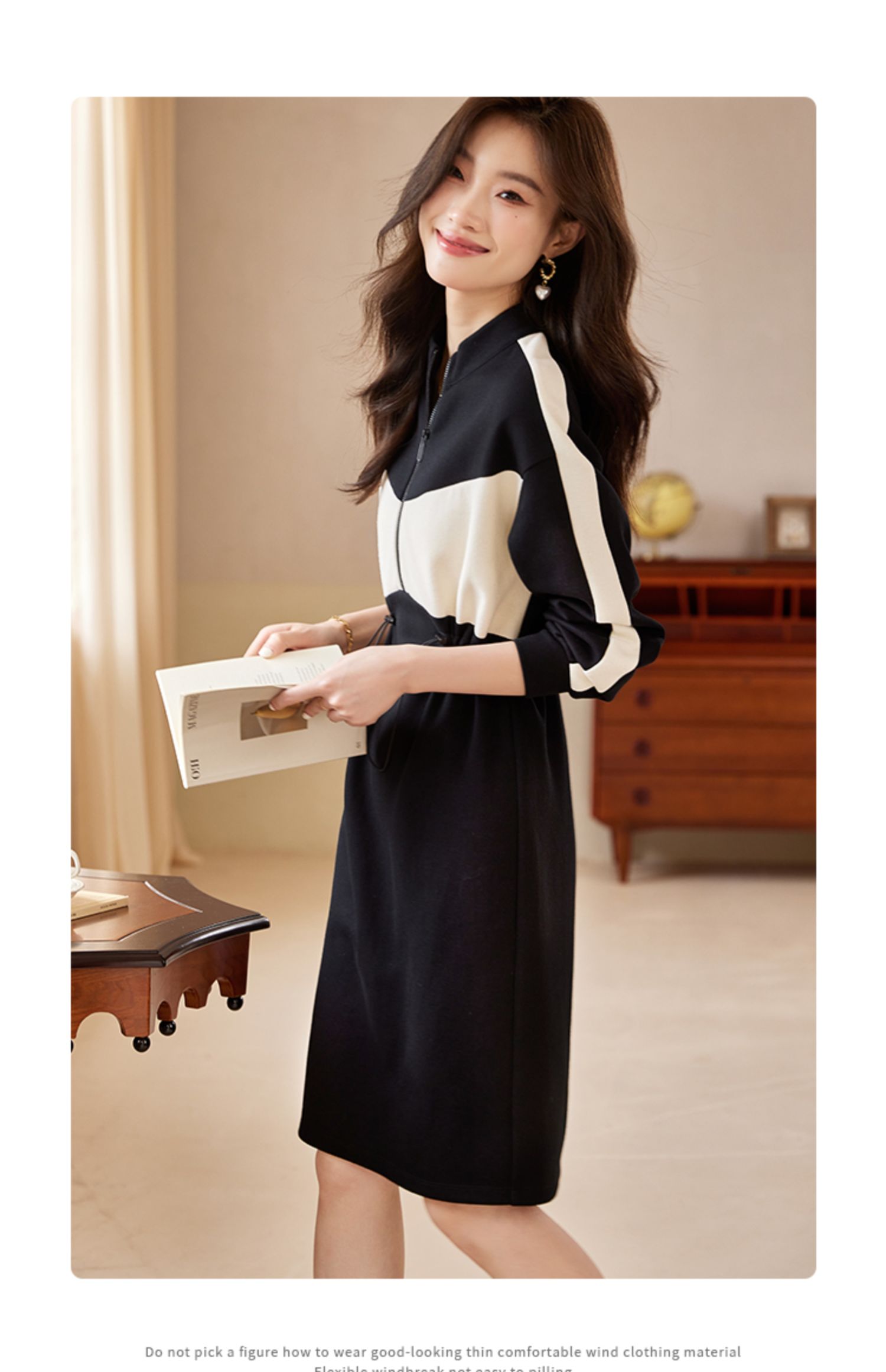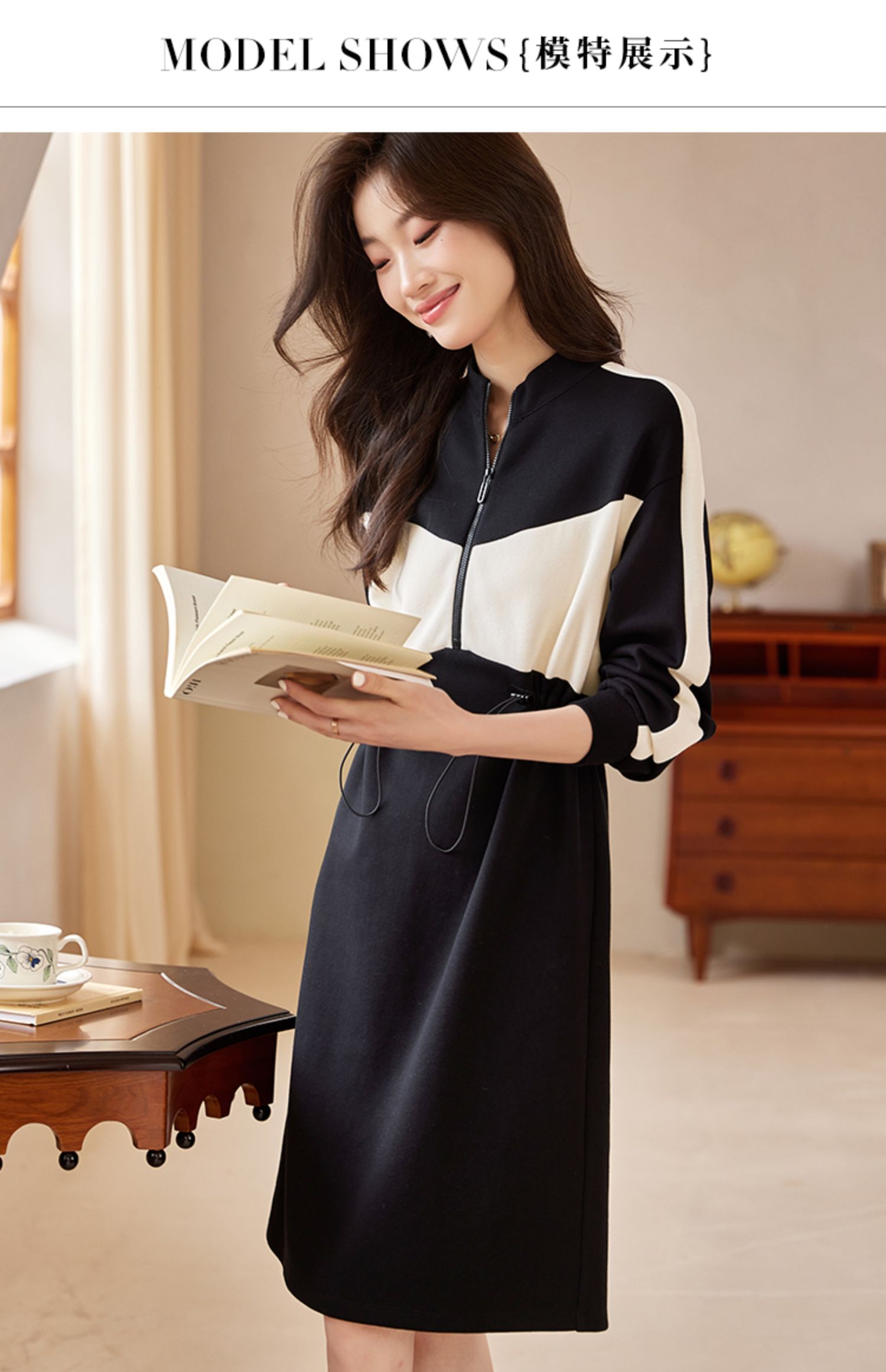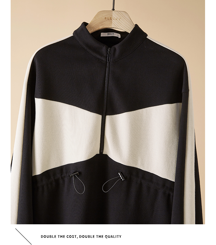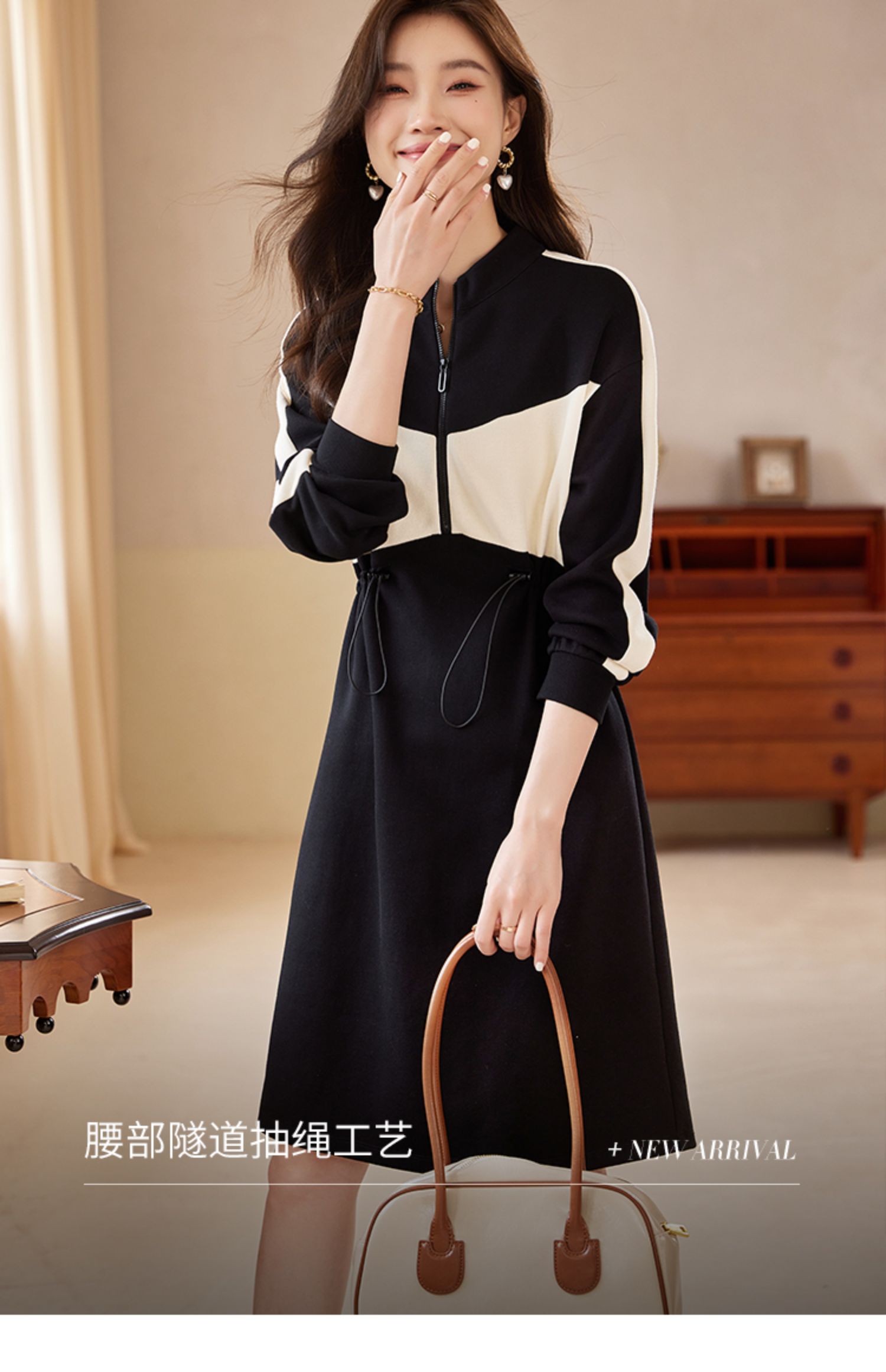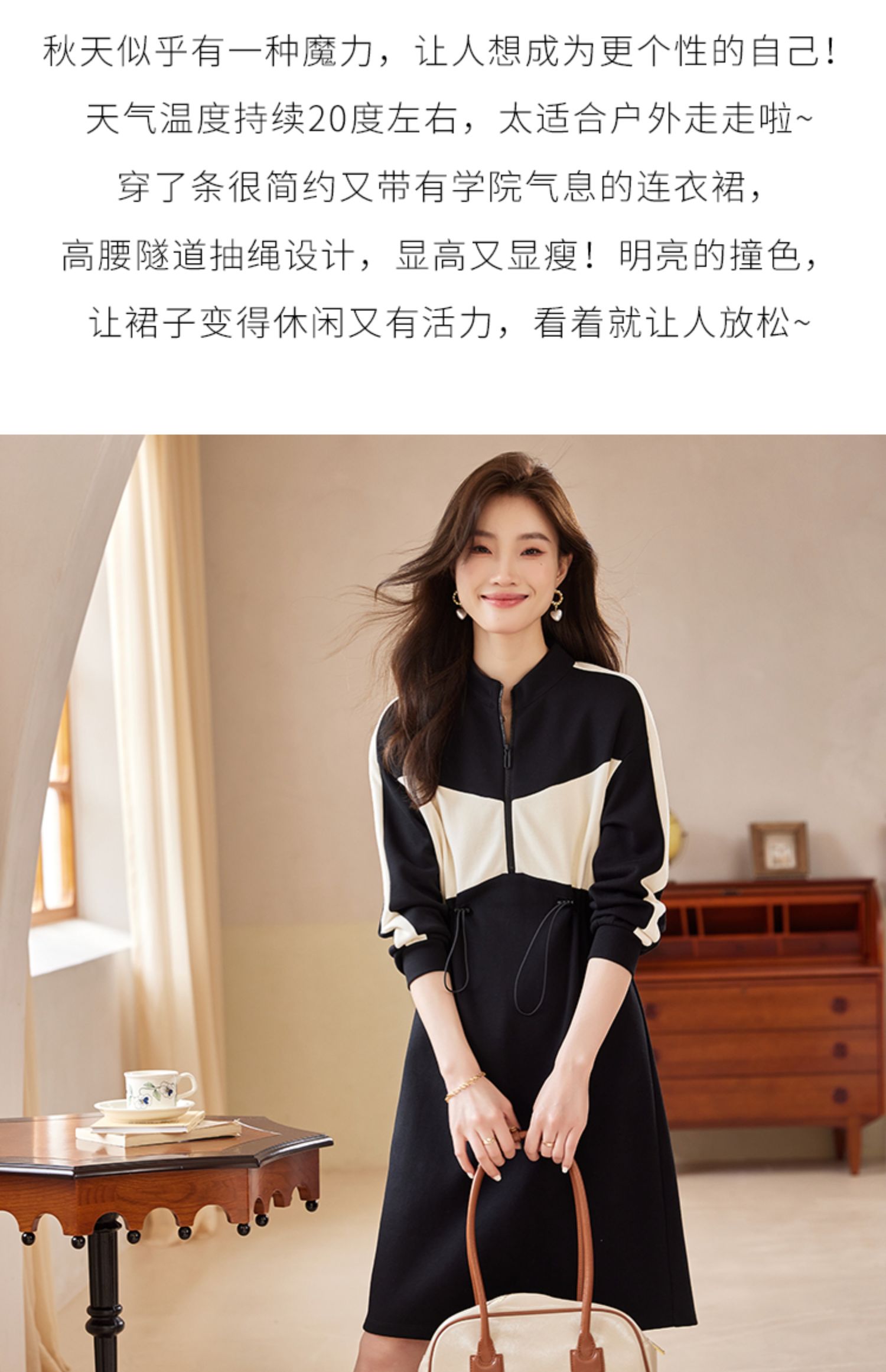 【专属特惠】熙世界运动休闲连衣裙女收腰抽绳显瘦时尚撞色卫衣裙2025秋季新款