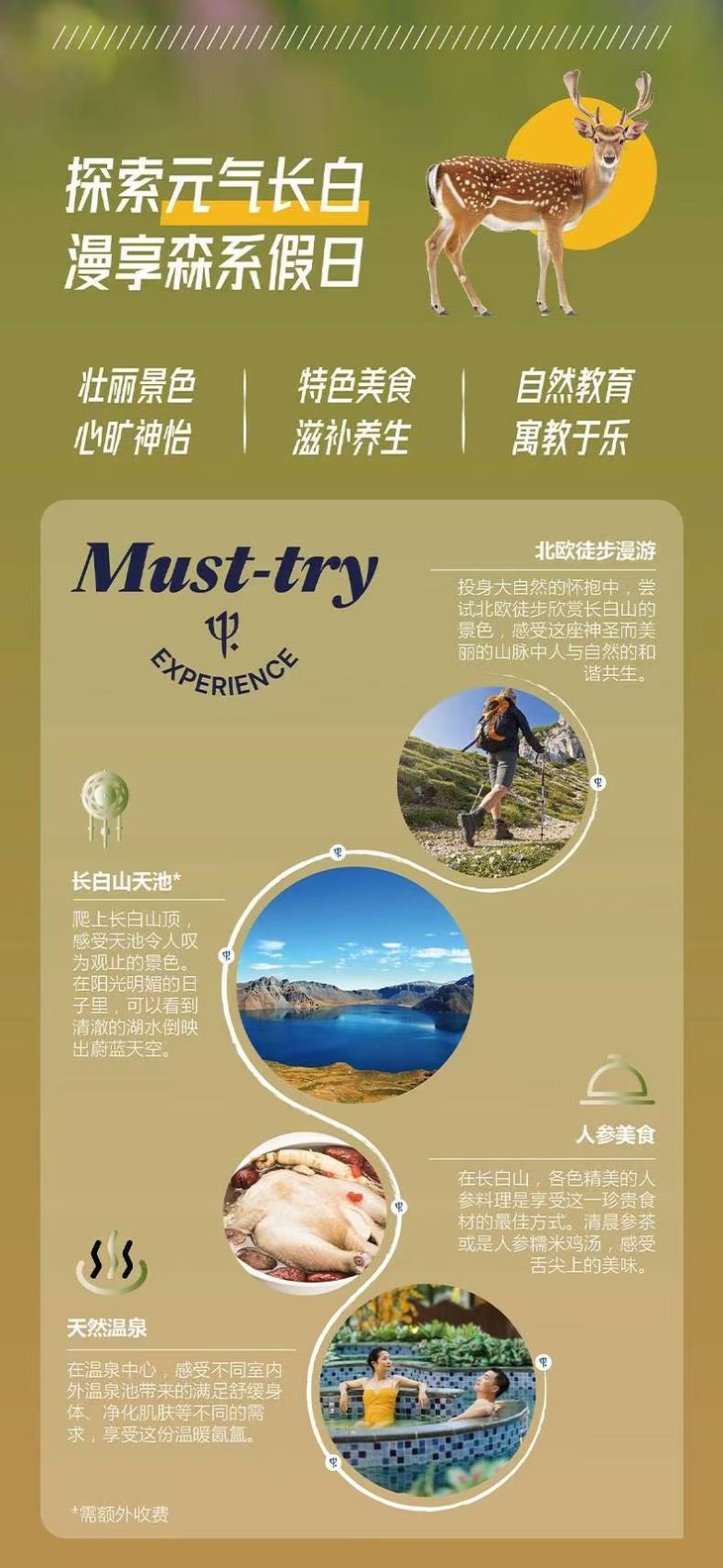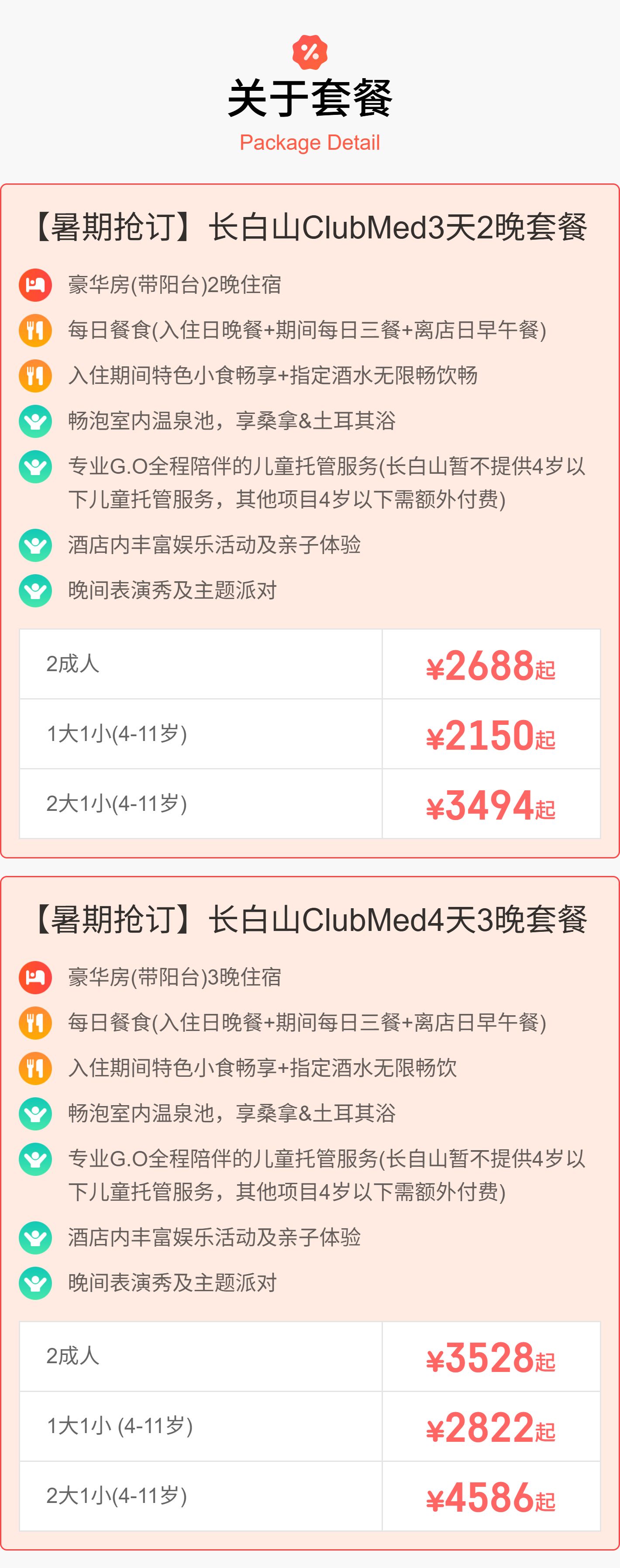 【春夏早鸟】2晚/3晚【长白山ClubMed度假村 (夏季)】暑期抢订!一价全包!畅享长白山夏季山林活动,享3000㎡天然温泉,每日三餐吃喝玩乐全包含,更有专业G.O帮你带娃!