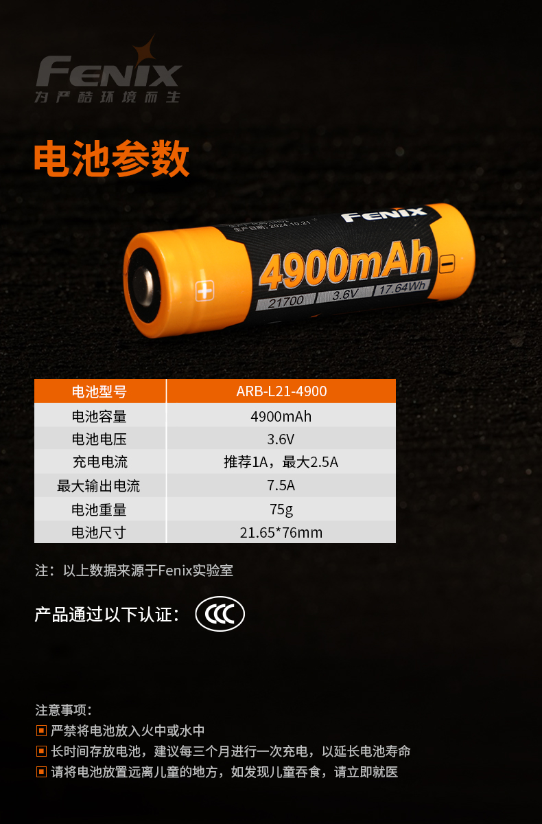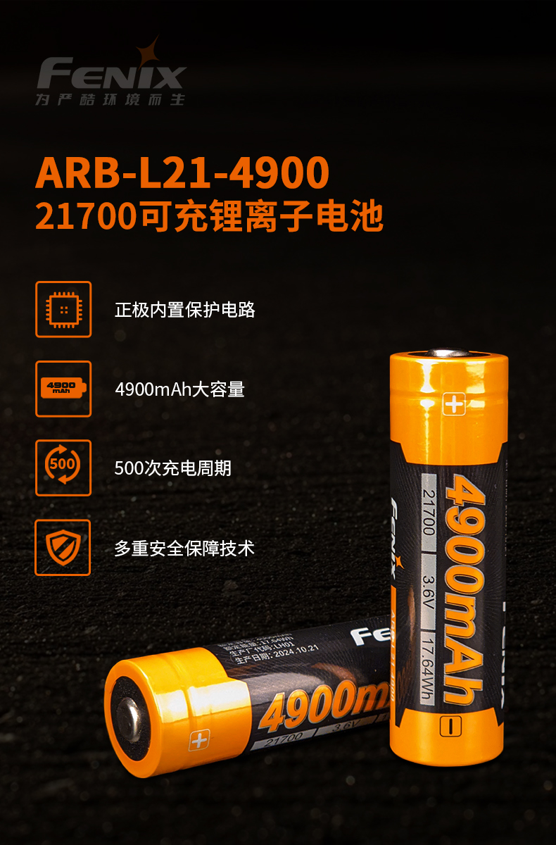 Fenix ARB-L21-4900U USB充电21700锂电池强光手电筒充电电池