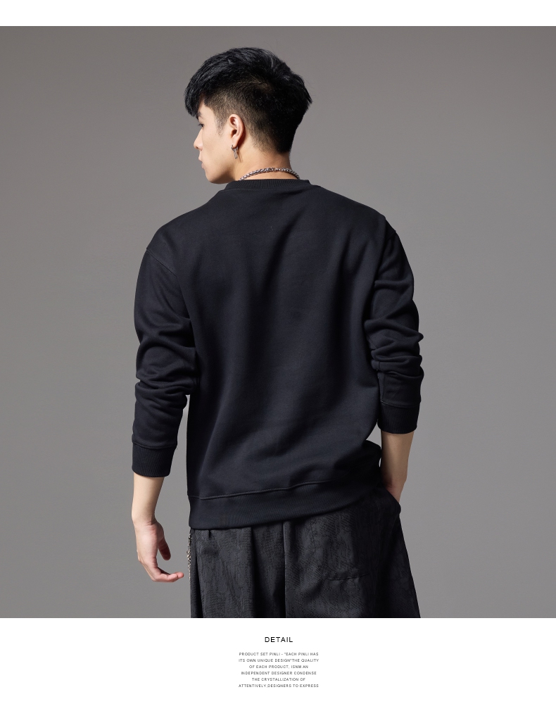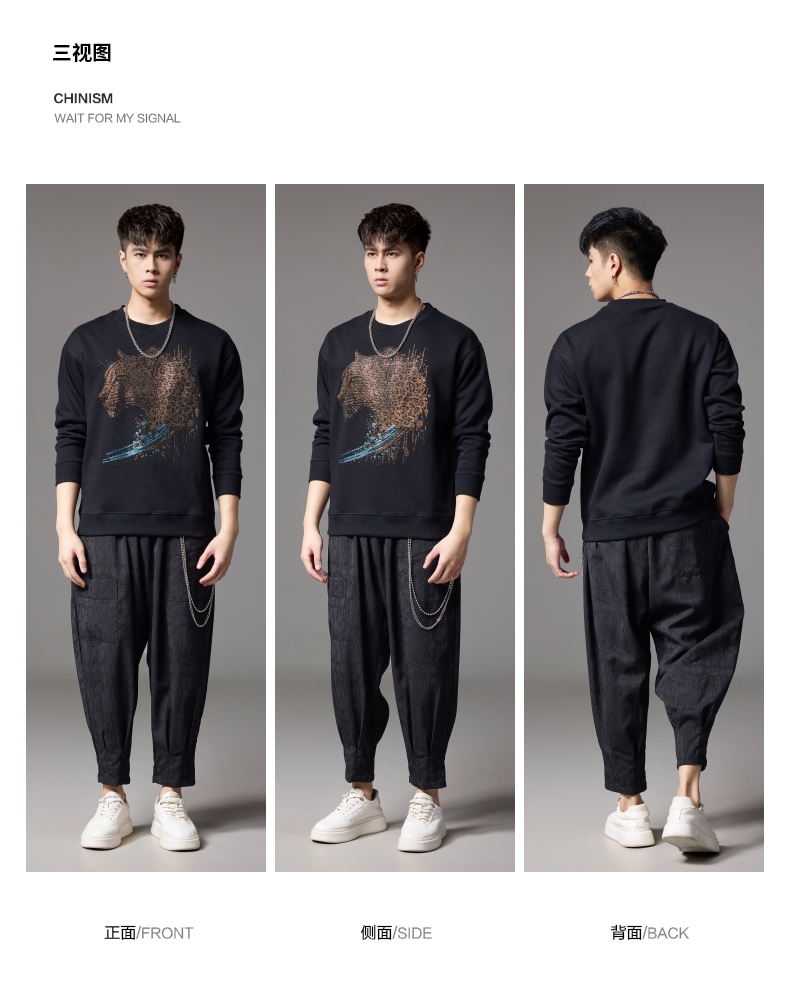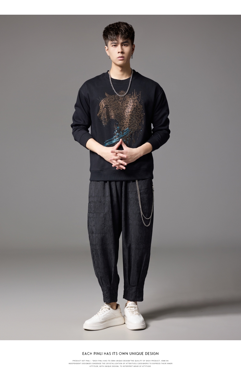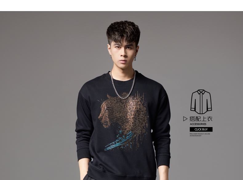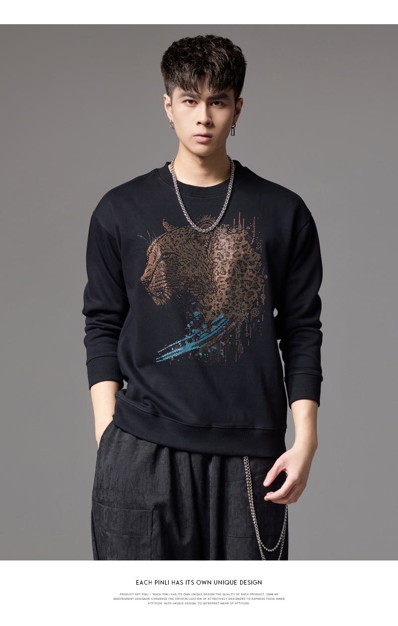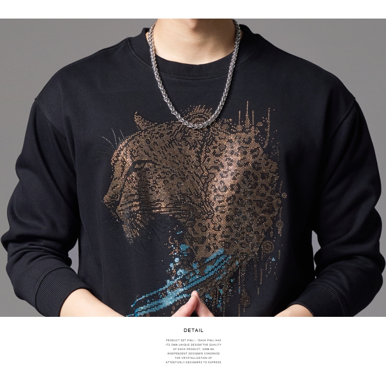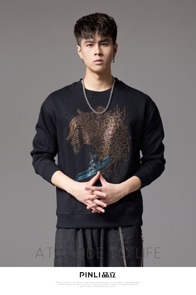 PINLI品立2024秋季新款男士圆领宽松落肩金钱豹烫钻套头卫衣上衣BG243109039