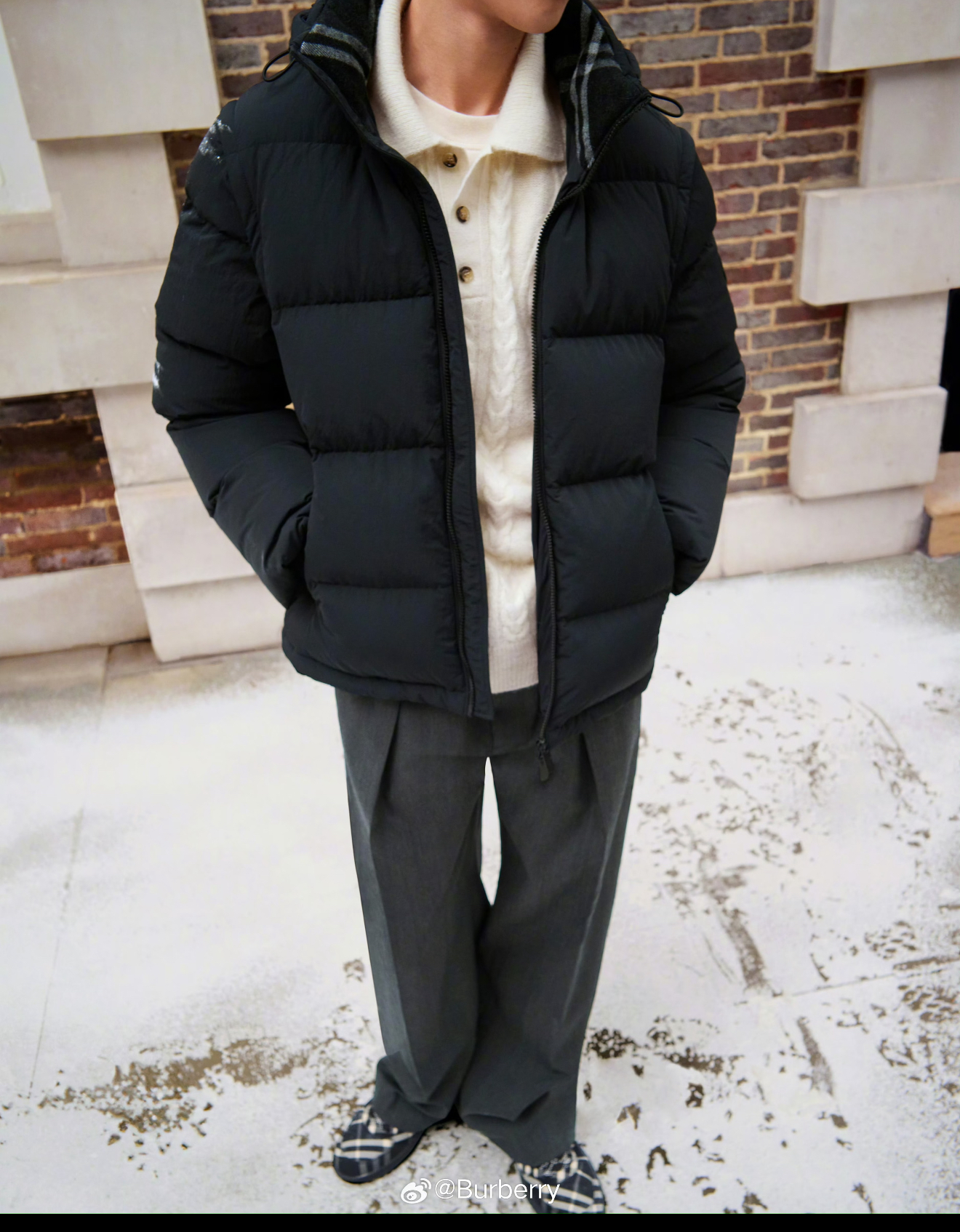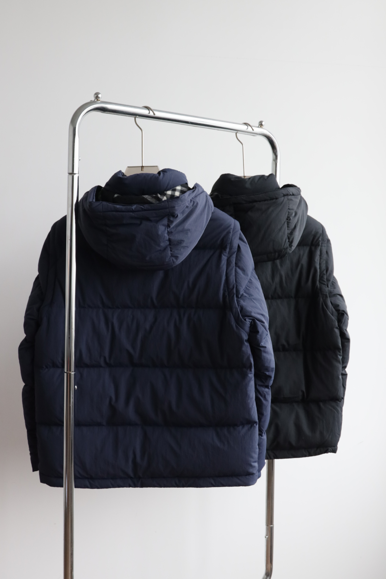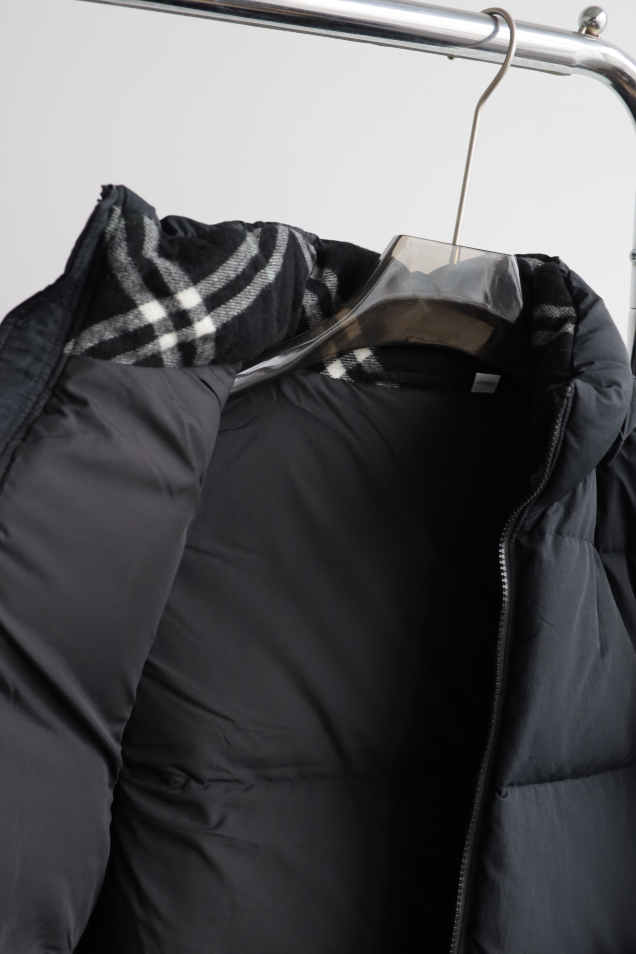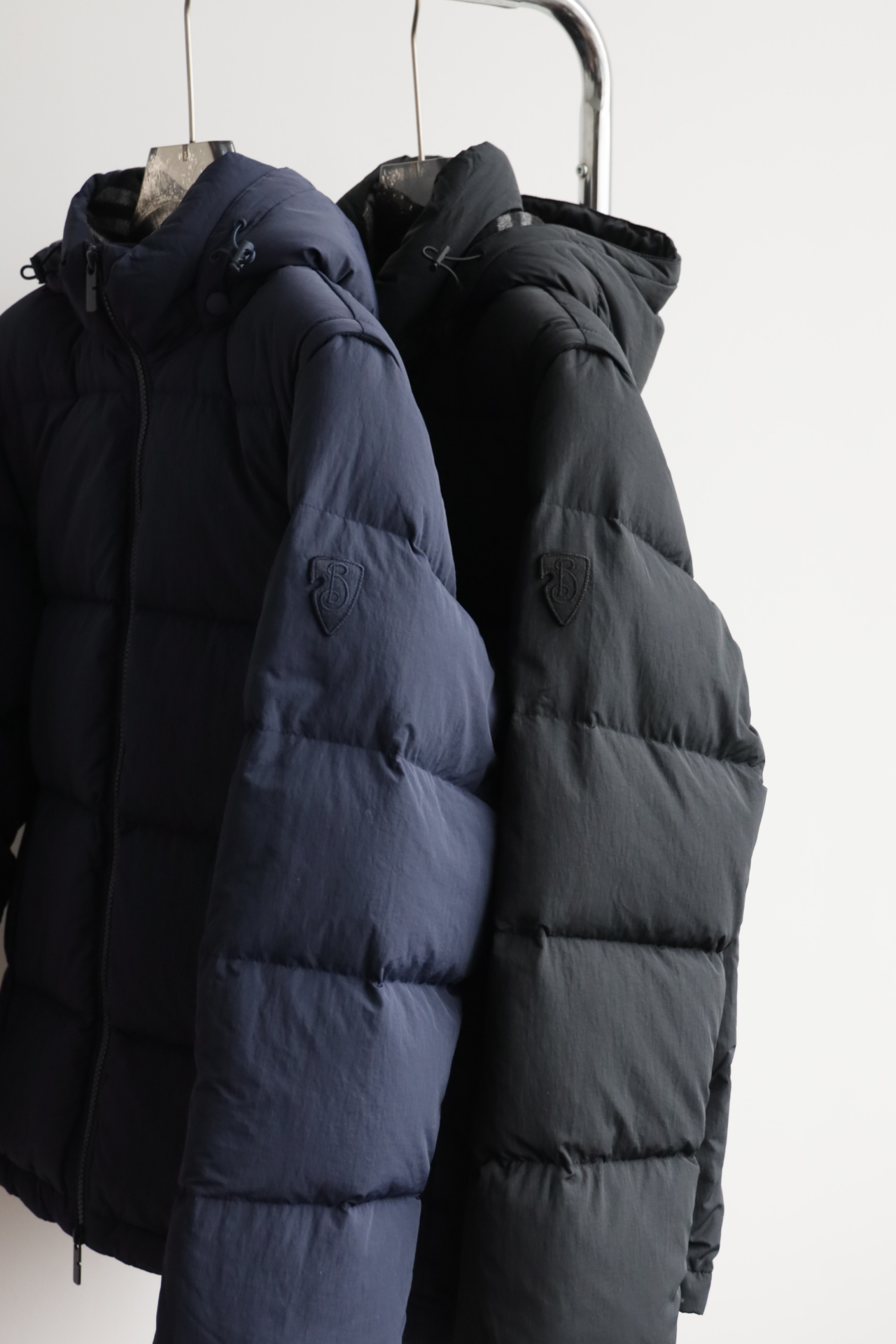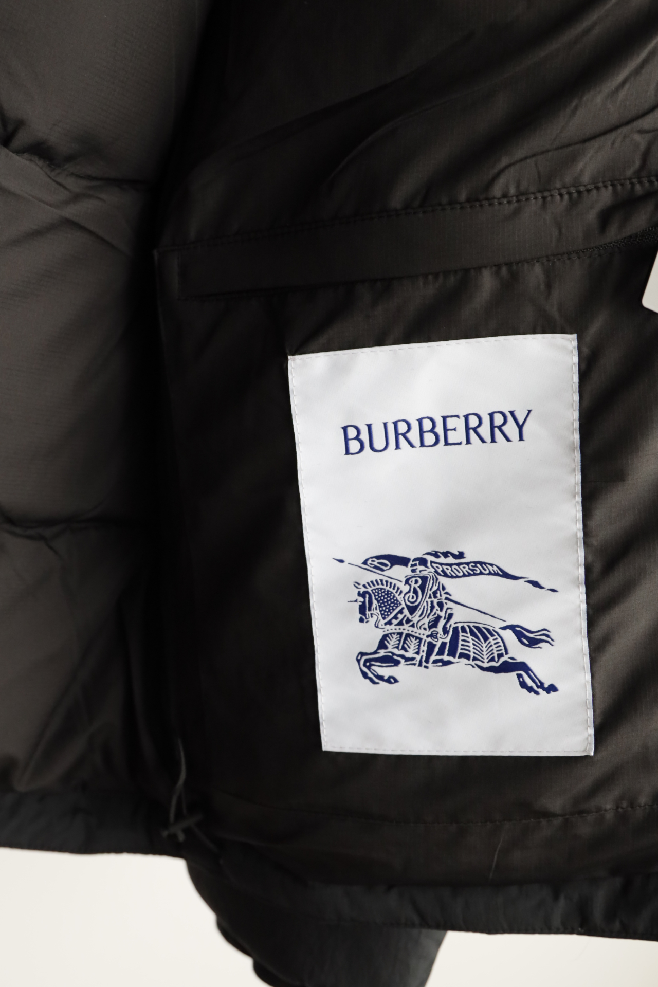 装饰有B字型盾牌图案贴花,以及连帽和衣领上的格纹内衬,这些经典的品牌元素不仅彰显了品牌的独特风格,也增加了羽绒服的时尚感和辨识度。