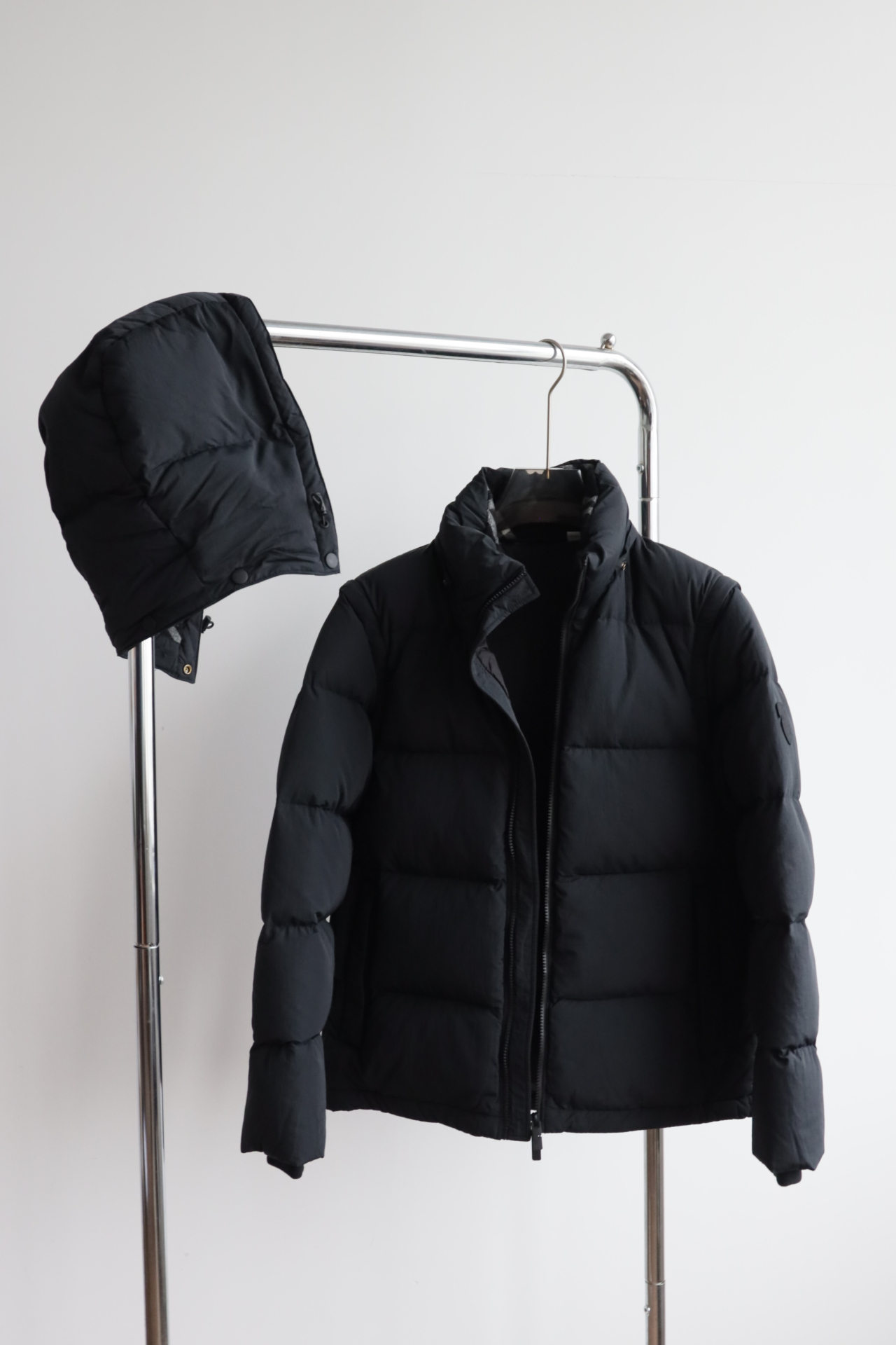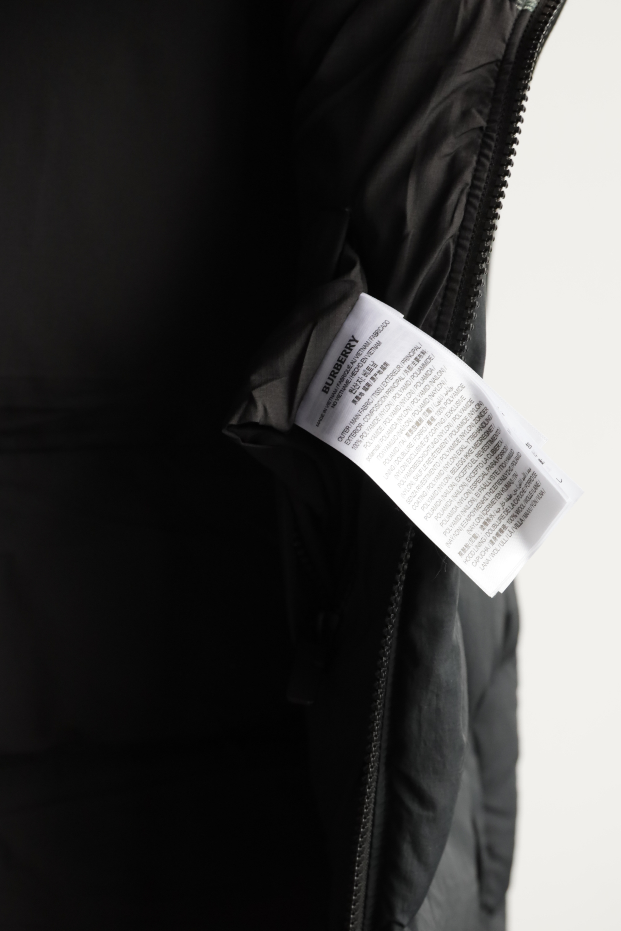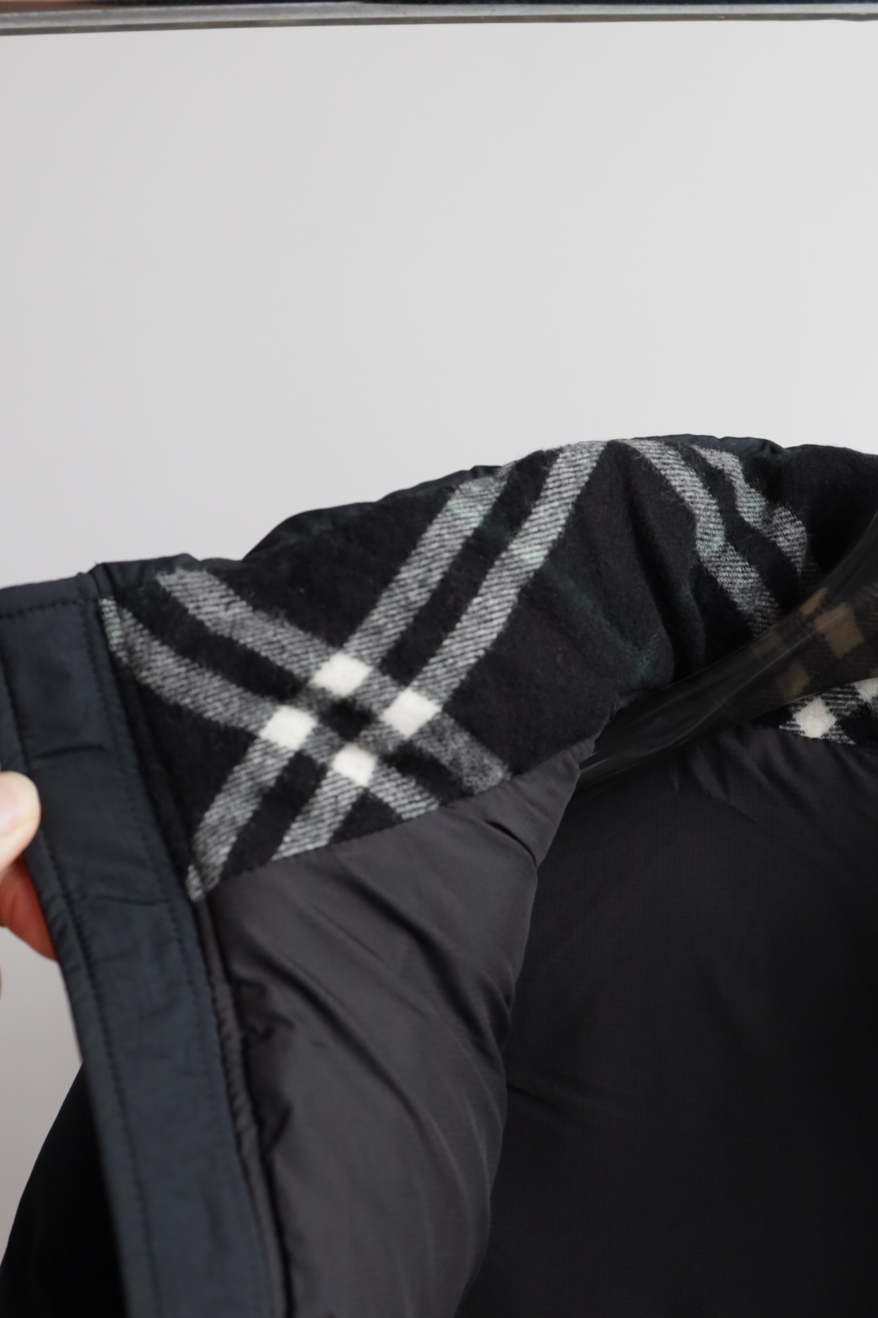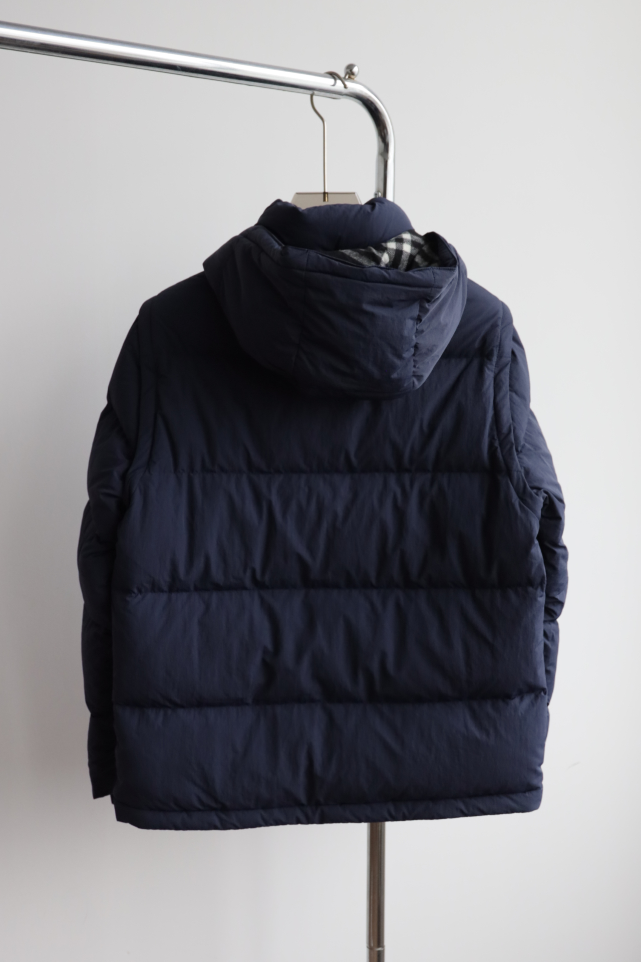 装饰有B字型盾牌图案贴花,以及连帽和衣领上的格纹内衬,这些经典的品牌元素不仅彰显了品牌的独特风格,也增加了羽绒服的时尚感和辨识度。