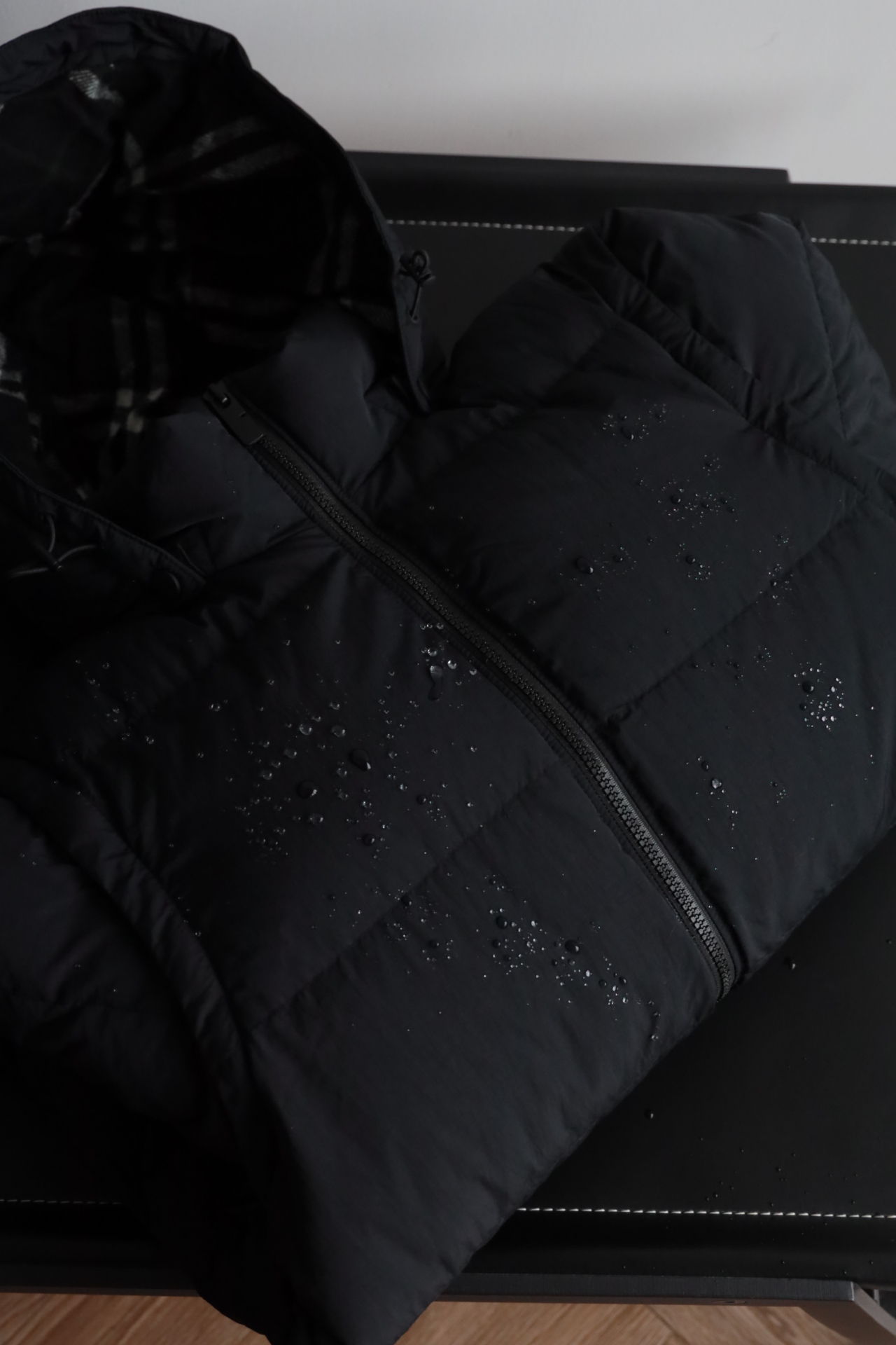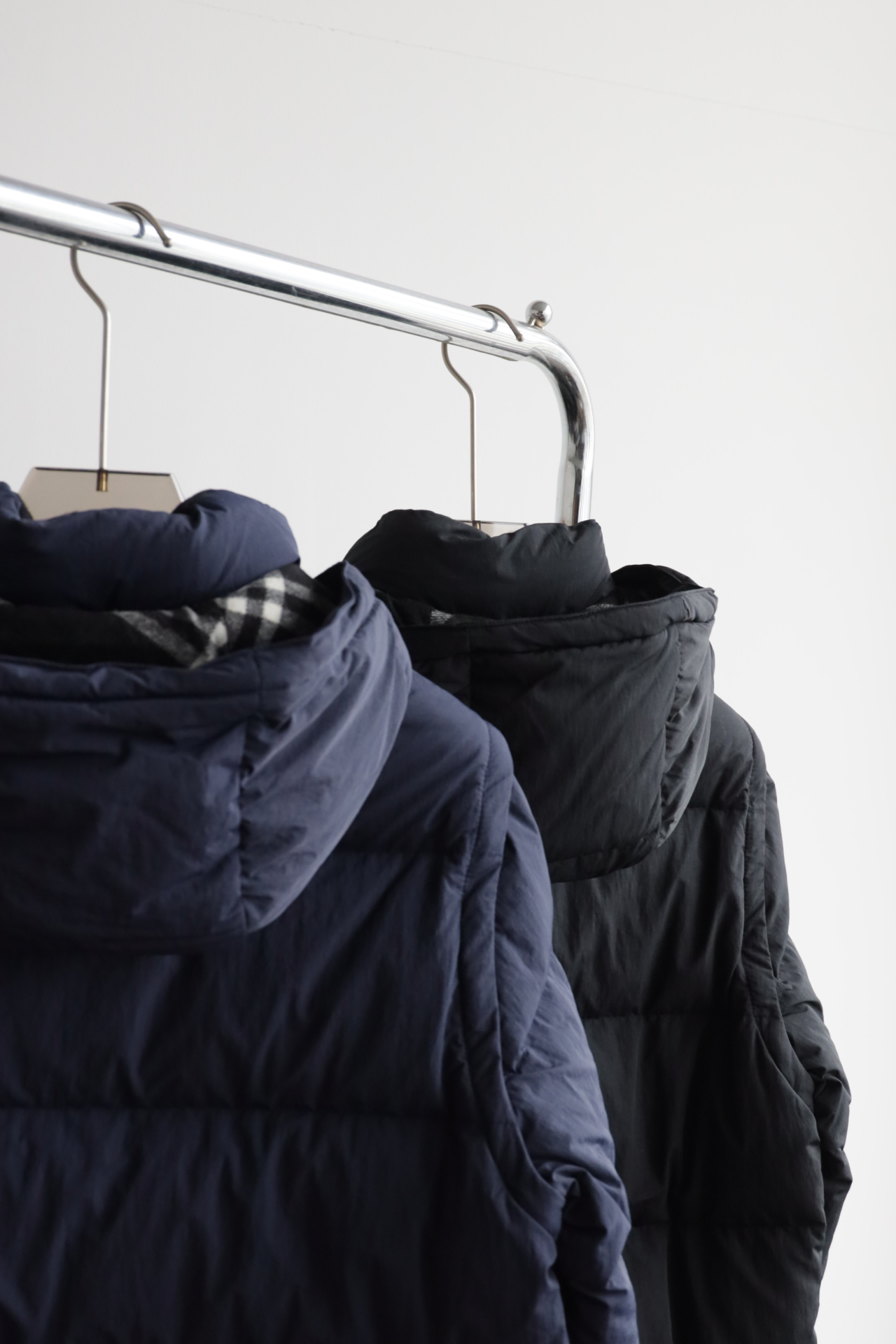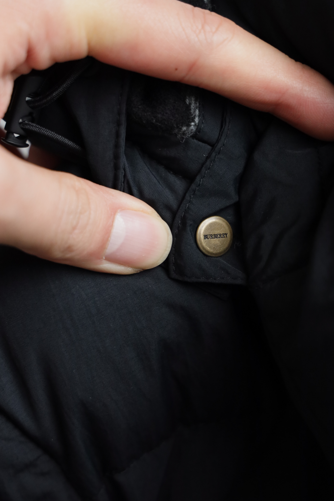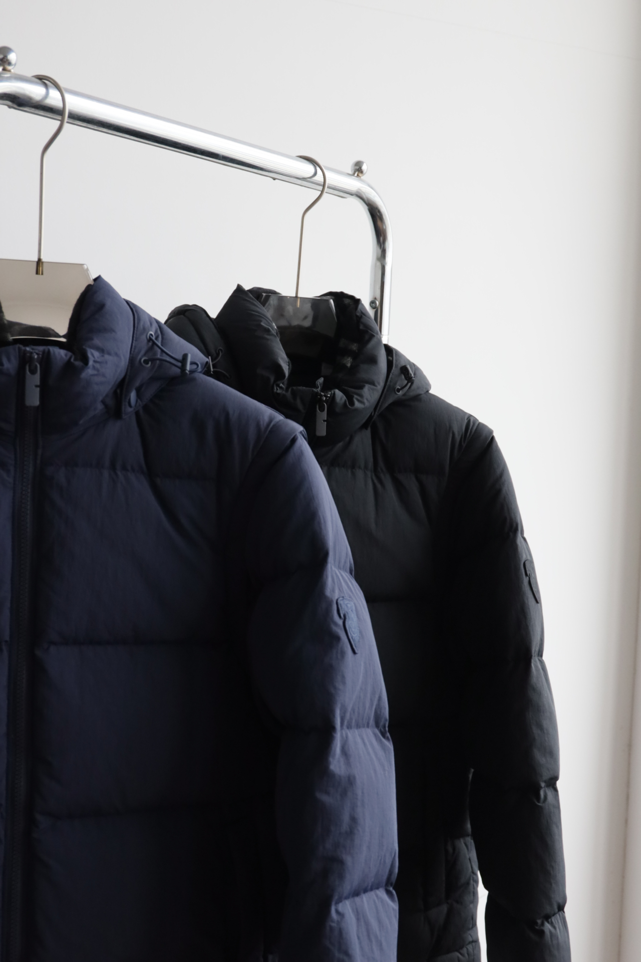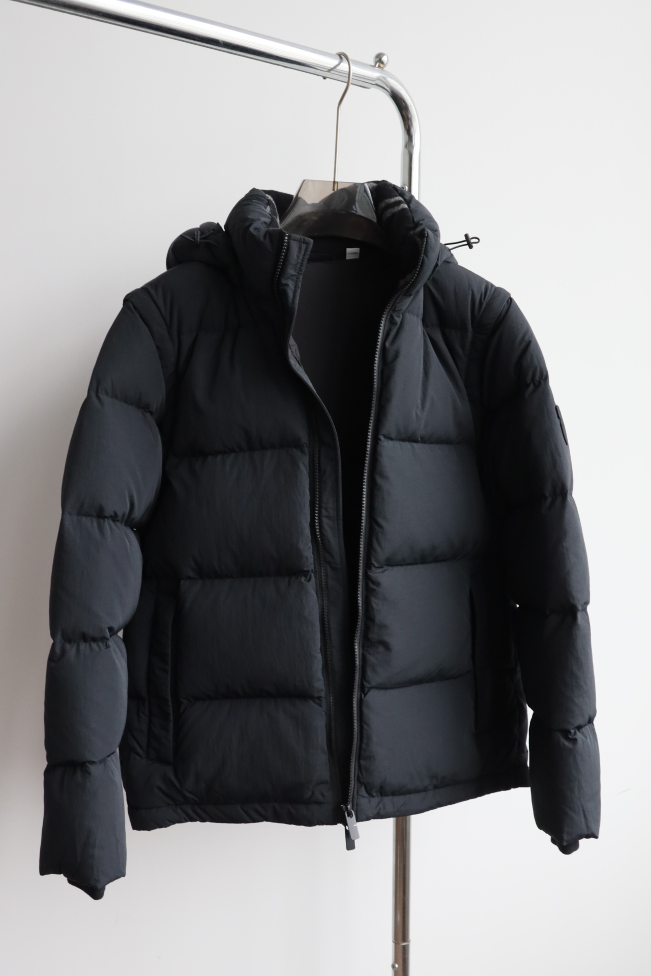 装饰有B字型盾牌图案贴花,以及连帽和衣领上的格纹内衬,这些经典的品牌元素不仅彰显了品牌的独特风格,也增加了羽绒服的时尚感和辨识度。