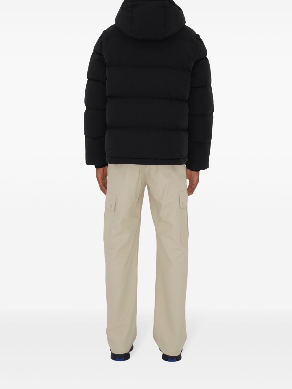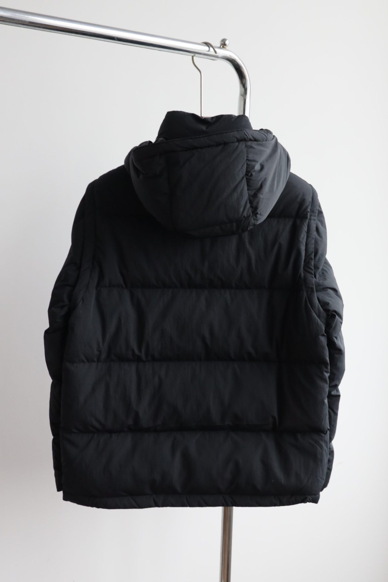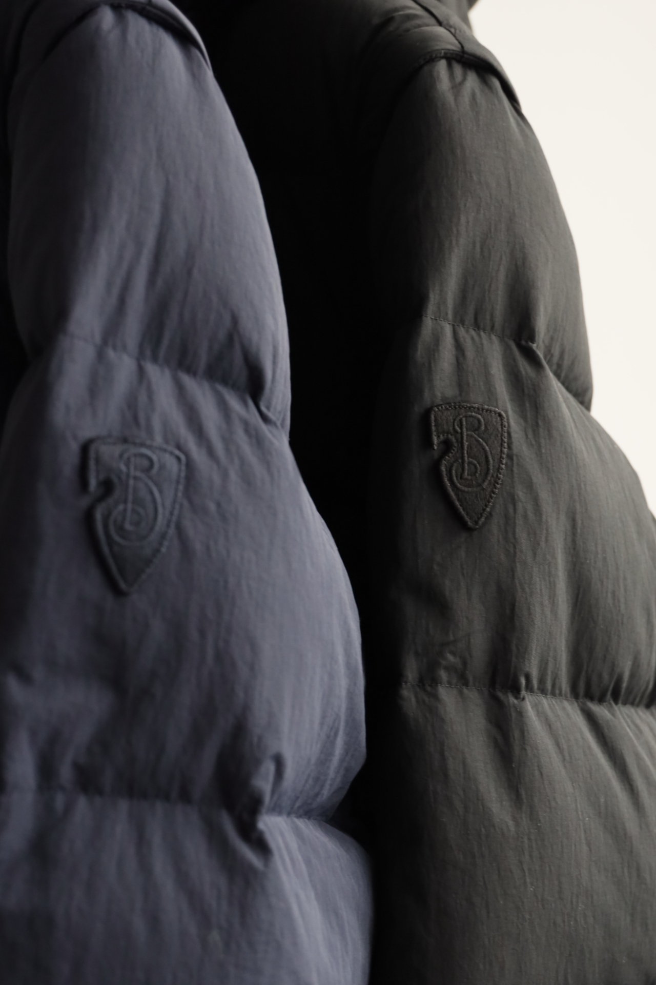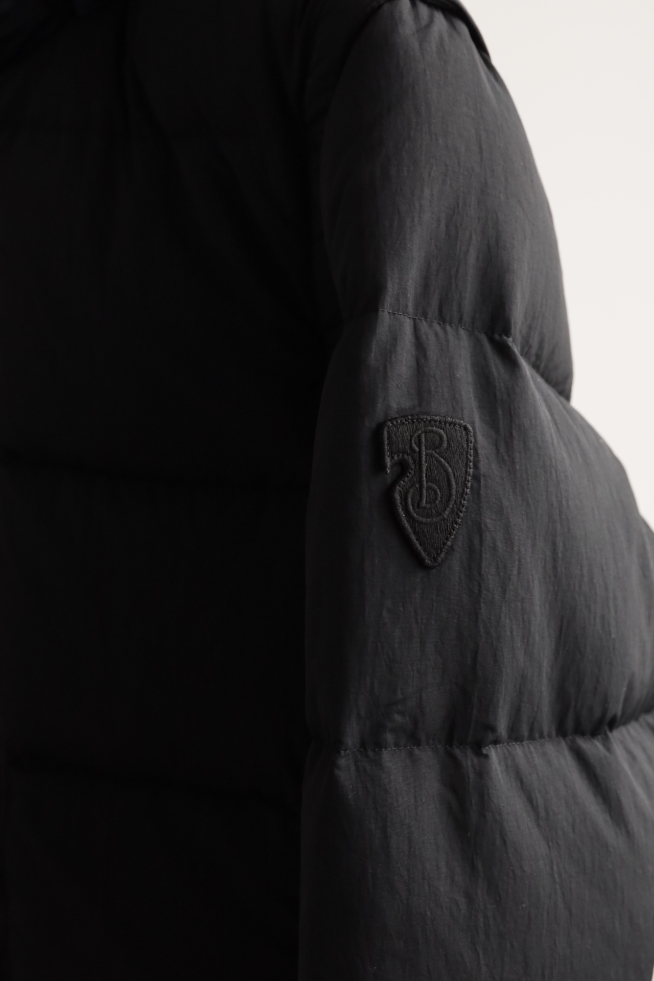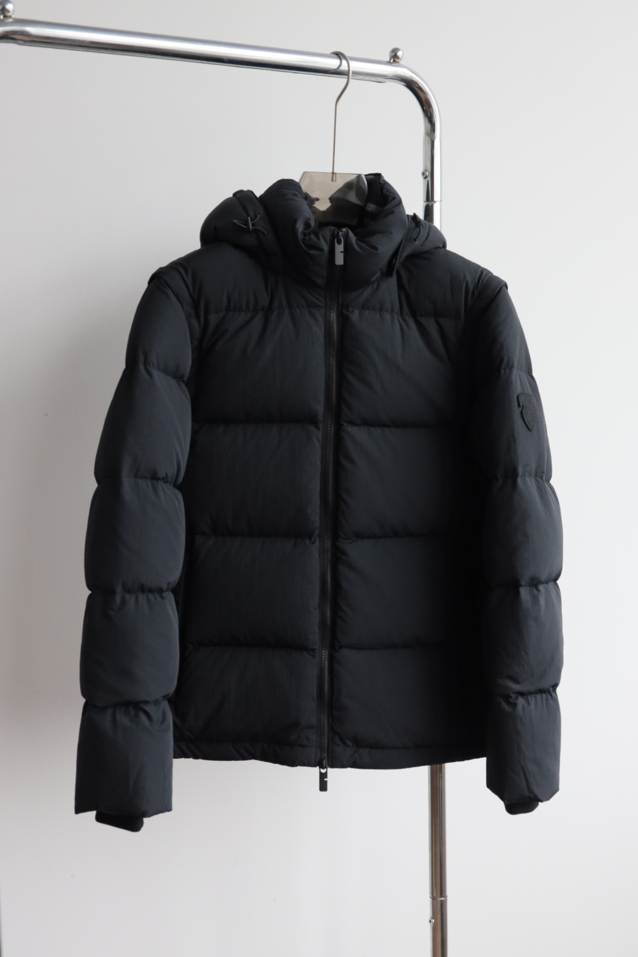 装饰有B字型盾牌图案贴花,以及连帽和衣领上的格纹内衬,这些经典的品牌元素不仅彰显了品牌的独特风格,也增加了羽绒服的时尚感和辨识度。