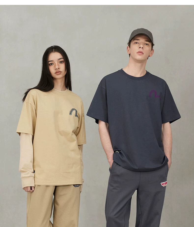 90 货号078599090 LL 宝子们,挖到宝啦!【福神Evisu胸前小海鸥简约标纯棉宽松短袖T恤】浅杏色温柔似水,碳灰色酷帅百搭,一个清新文艺,一个低调沉稳,轻松适配不同风格需求!男女同款的设计,情侣穿超有CP感,单人穿也尽显个性!纯棉材质,透气亲肤,如爱人的轻抚,柔软舒适,给予肌肤最贴心的呵护!松版型遮肉又随性!宽松的版型,男女同款的短袖,打破了性别的界限,不仅是一种时尚态度,更是对自由生活的向往与追求!无论是搭配短裤展现夏日活力,还是叠穿外套打造层次感,它都能轻松驾驭!