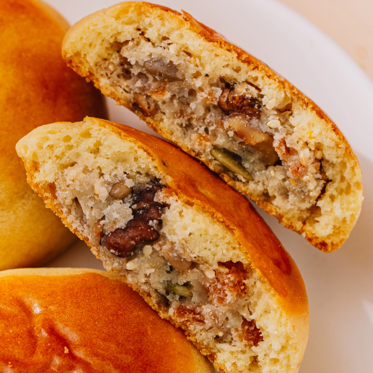 充足的内馅由南瓜仁、白芝麻、核桃仁、蜜饯和金桔干揉制,饱满的果仁嚼劲十足,满口脆香,酸甜的金桔干画龙点睛,丝毫不觉甜腻,满口果仁香和桔香。