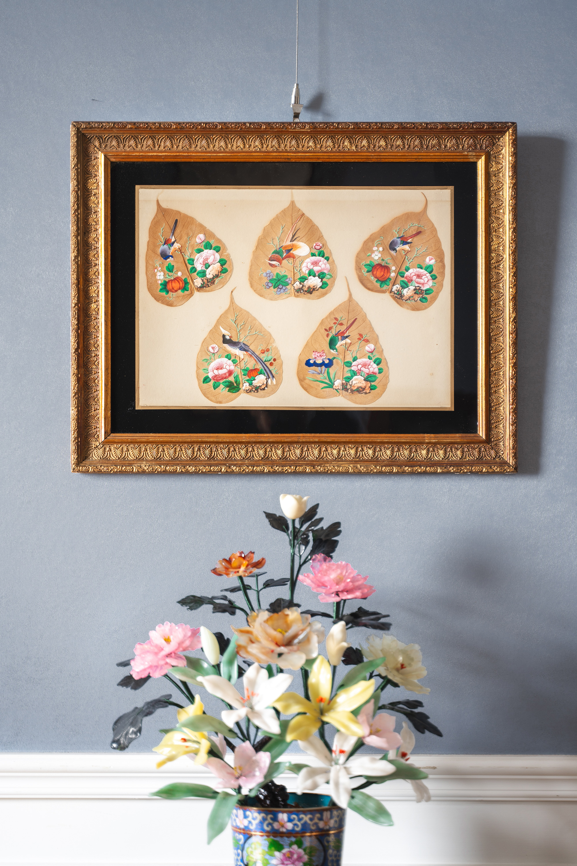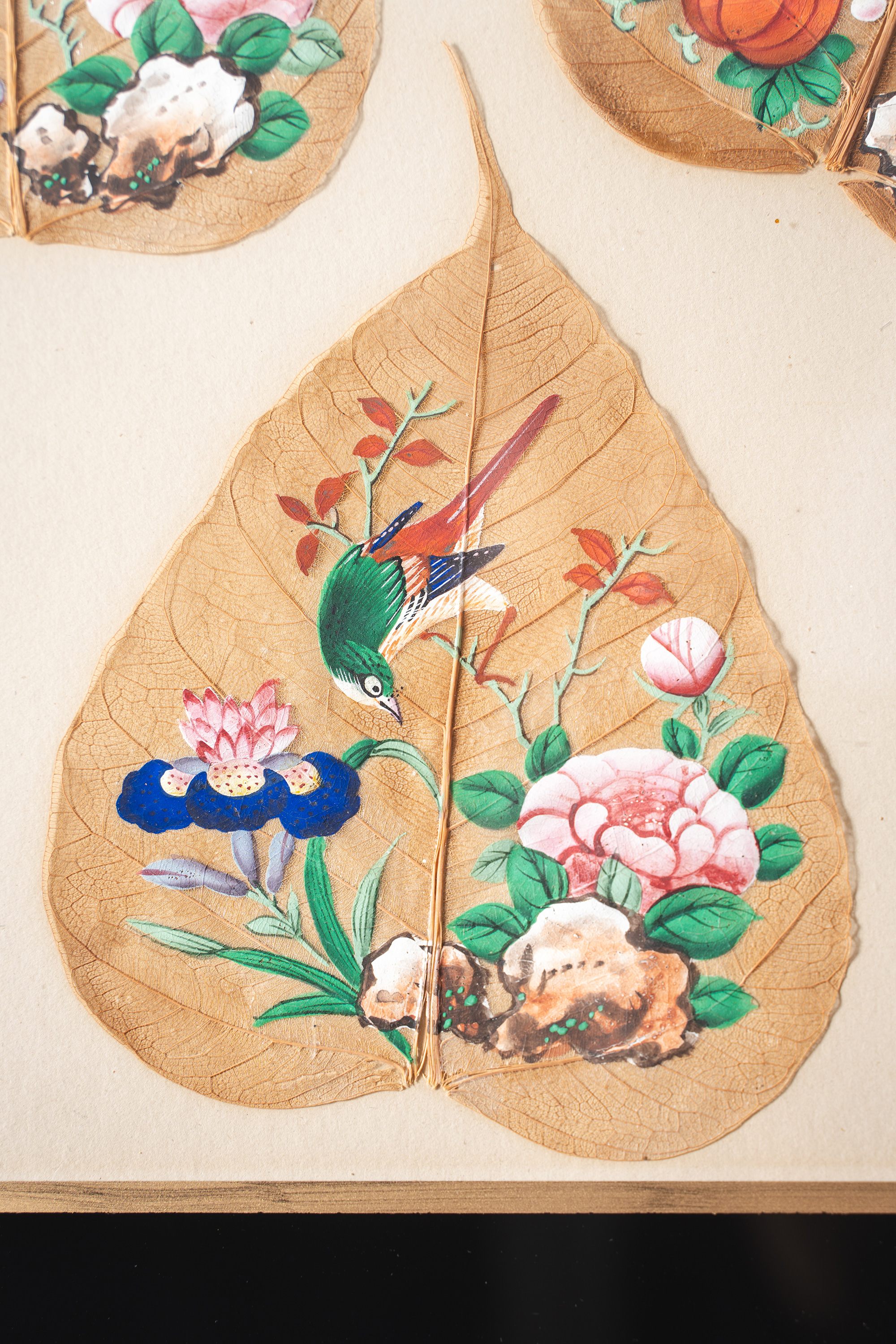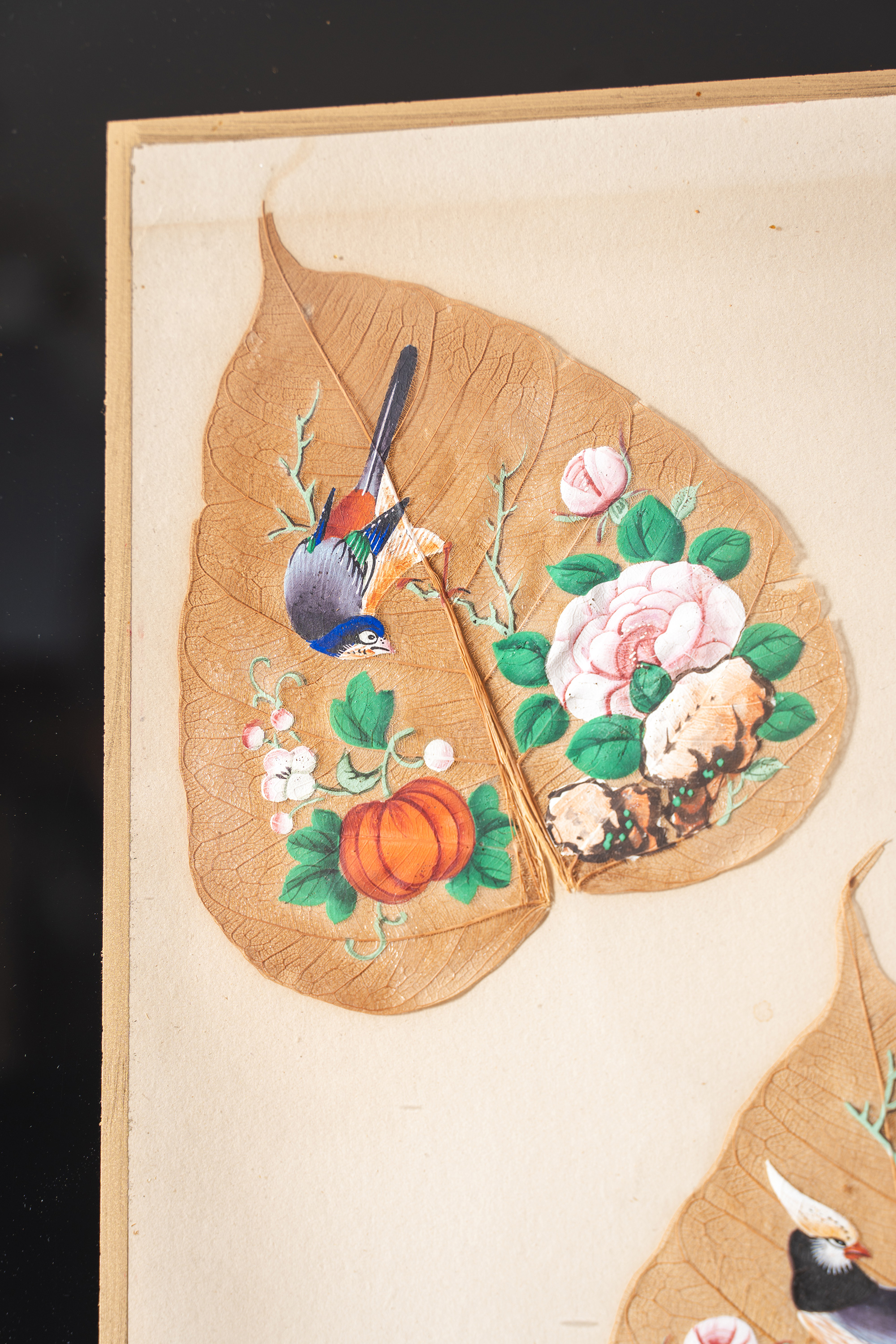 19世纪中国清代出品鎏金精雕外框装裱菩提叶彩绘工笔画五件套《花鸟果实》