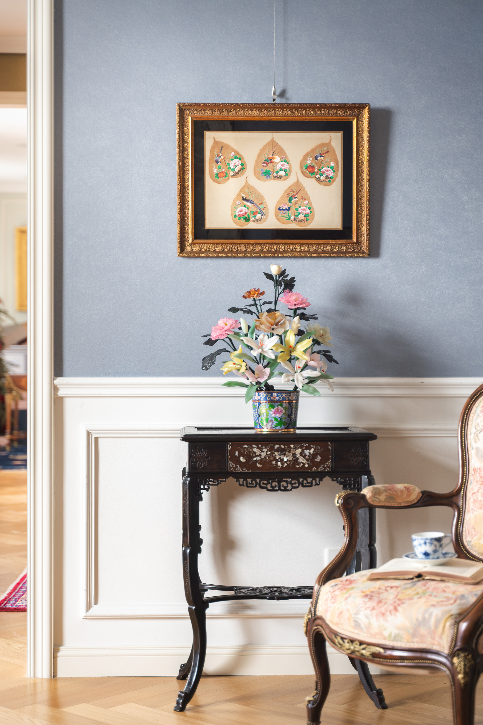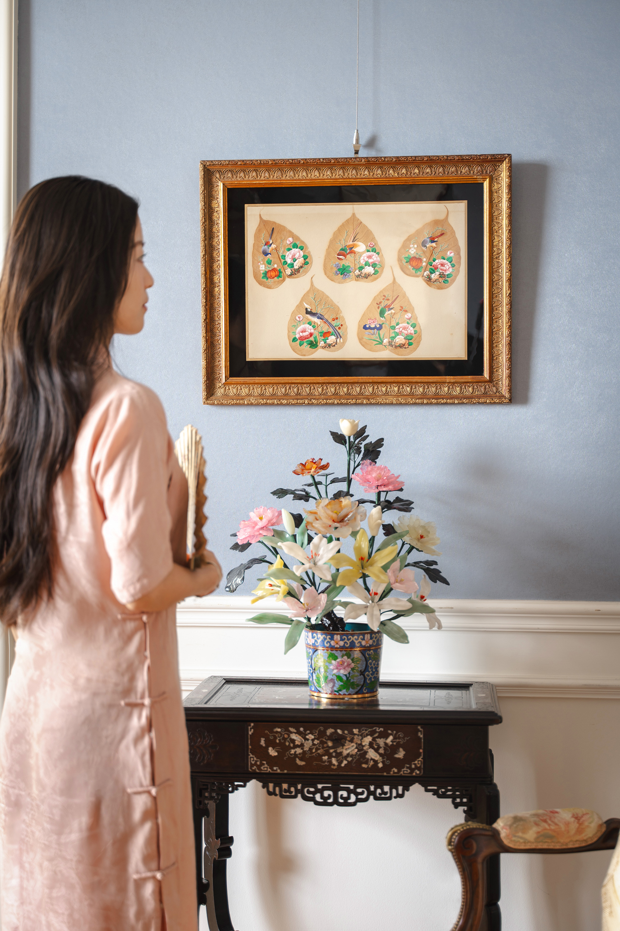 【已售】独角鹿西洋古董19世纪中国清代出品鎏金精雕外框装裱菩提叶彩绘工笔画五件套《花鸟果实》