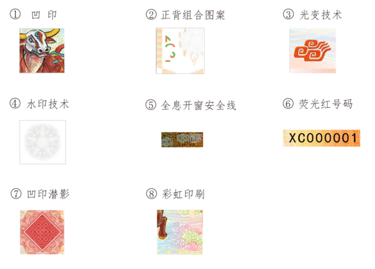 纪念券更是首次加入潜影技术,应用在凹印中国结中。平时观察为中国结图案,侧光观察为篆书“牛”文字图案。