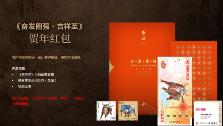 产品包含辛丑年生肖纪念券(双连张)、《辛丑年》生肖邮票版式一、《国裕家康》贺年专用邮票单枚、收藏证书