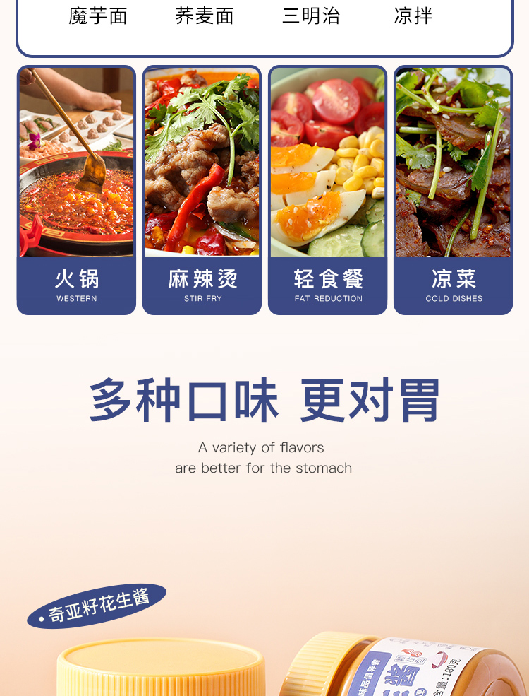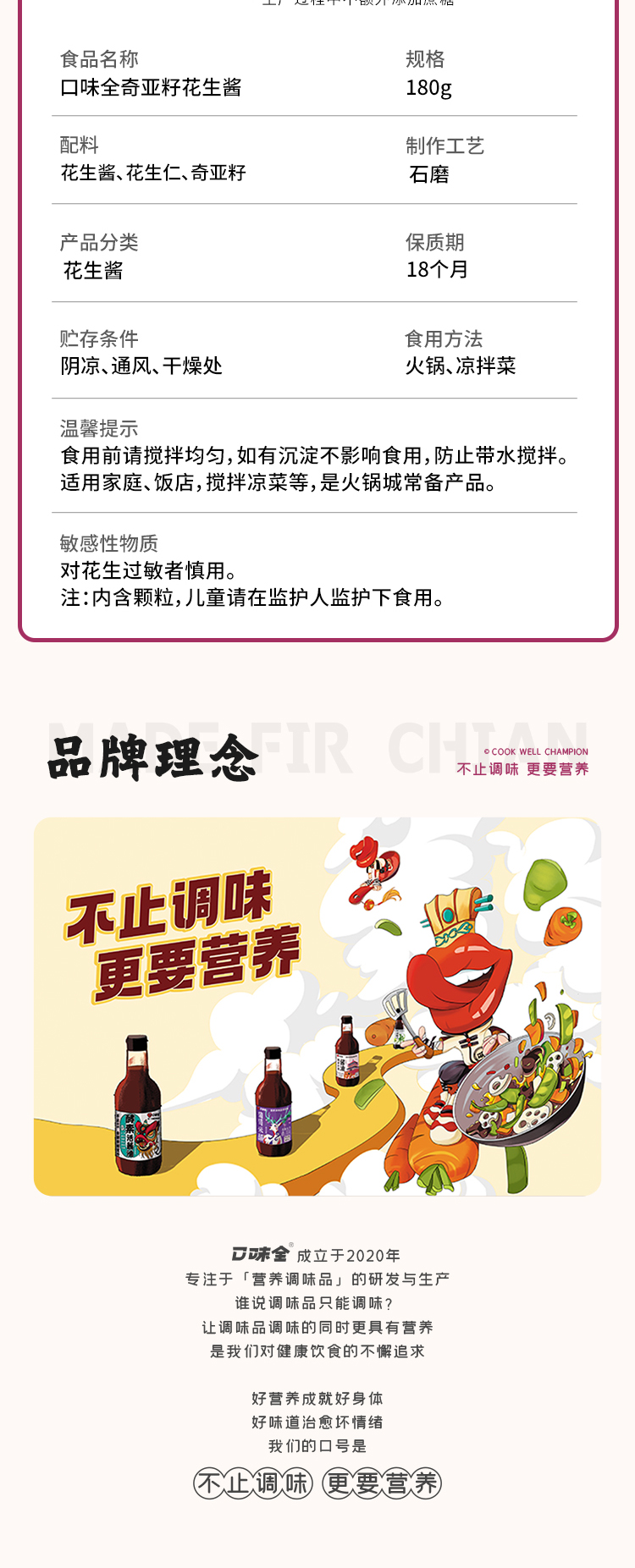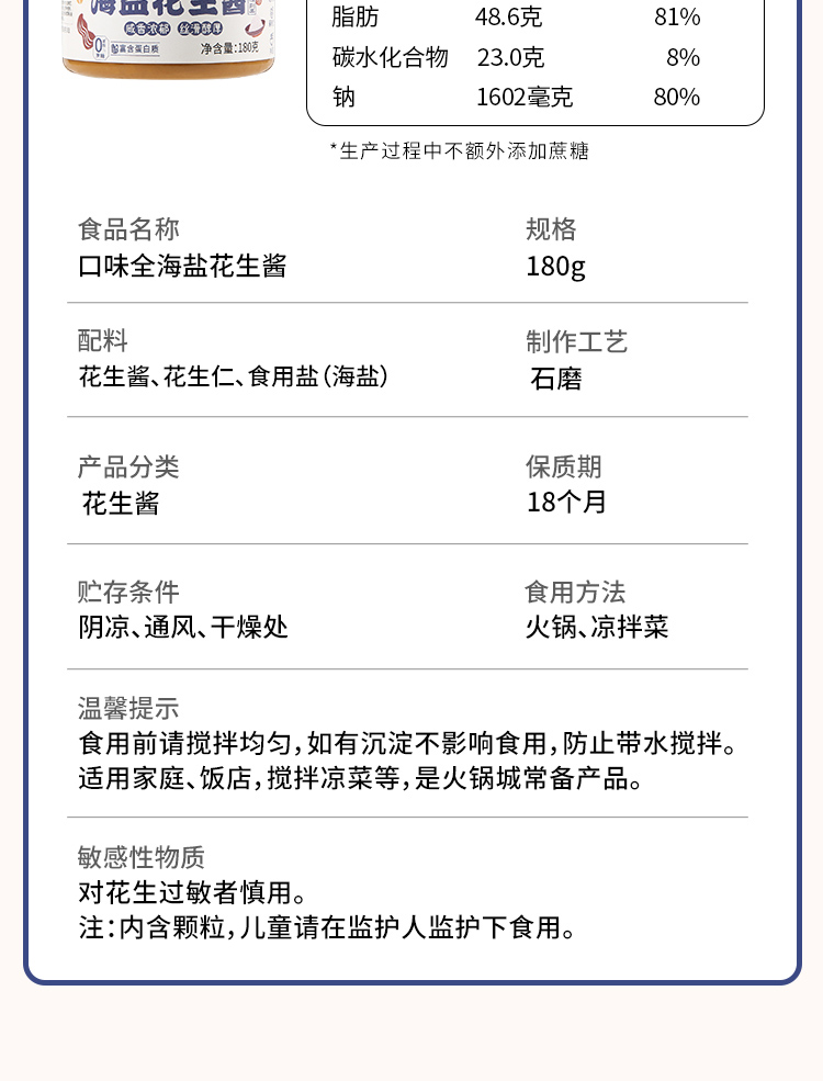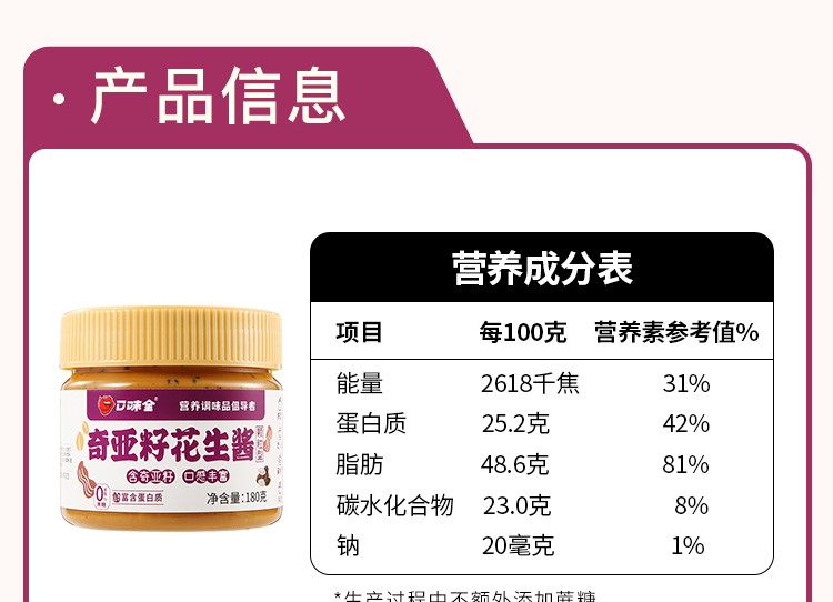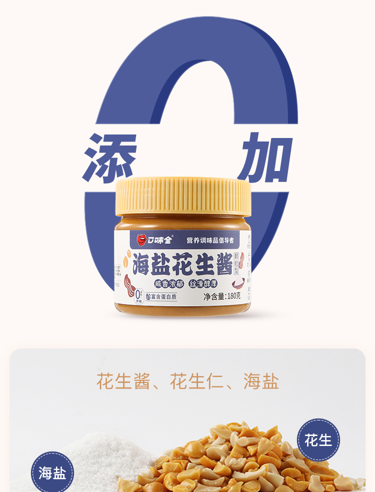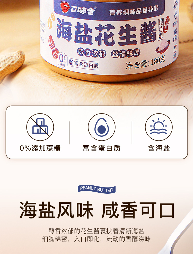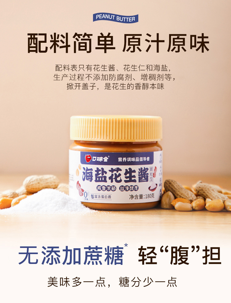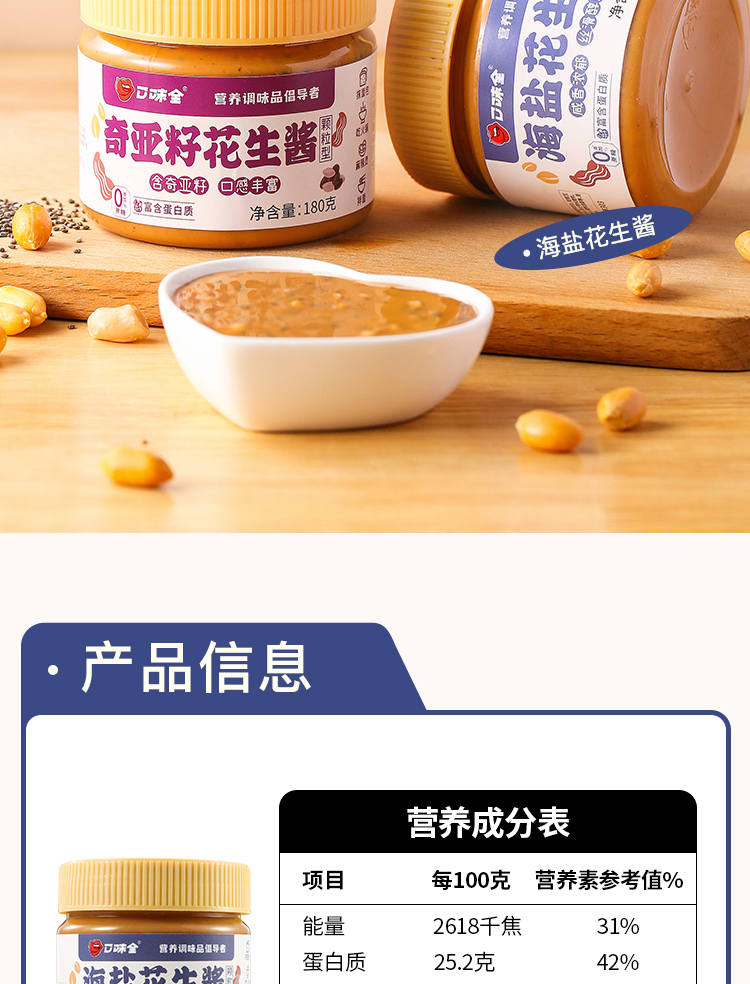 产品规格:海盐花生酱180g/罐/奇亚籽花生酱180g/罐