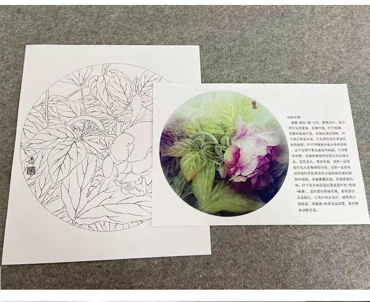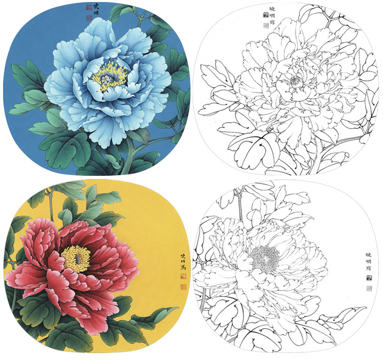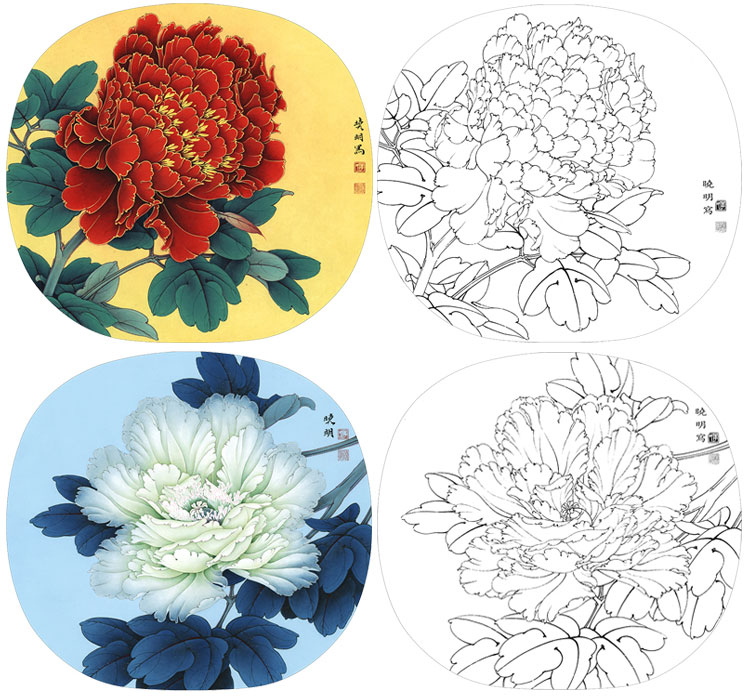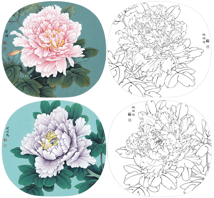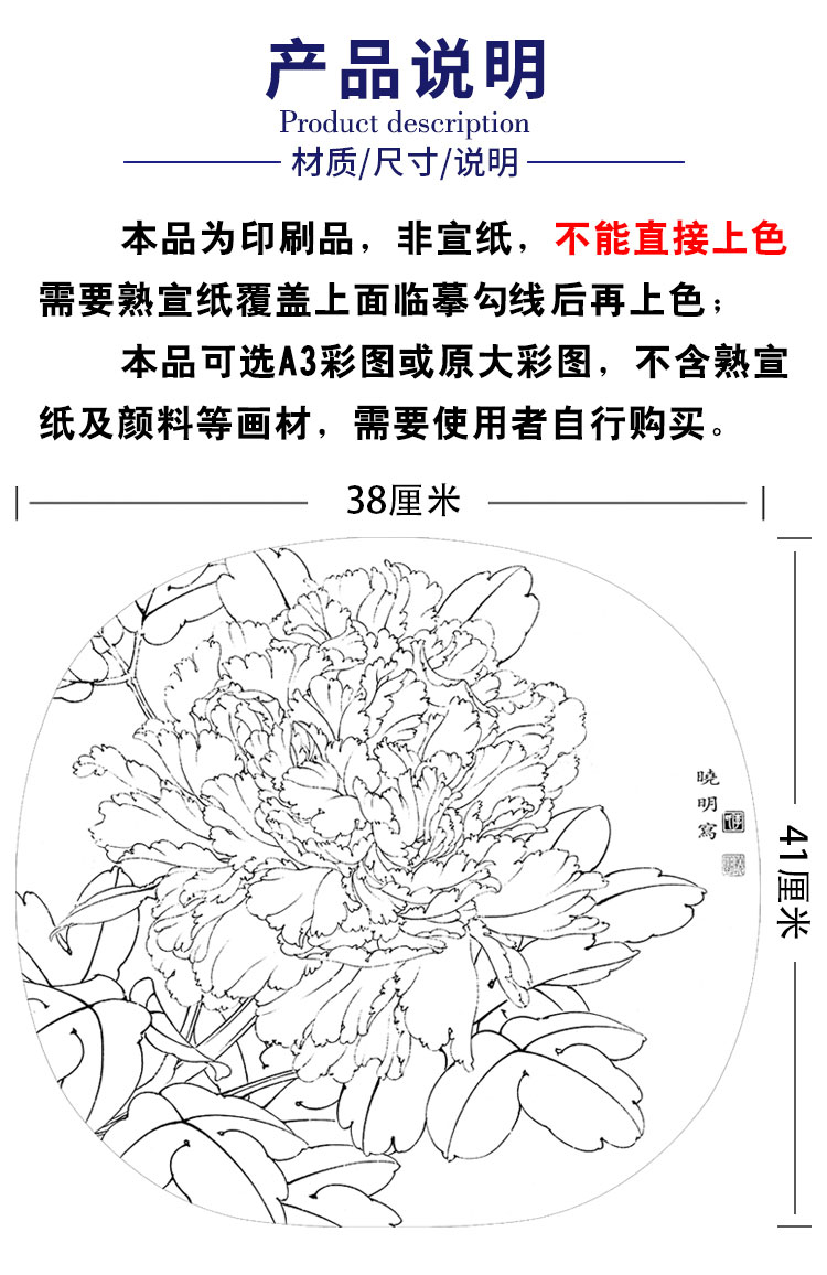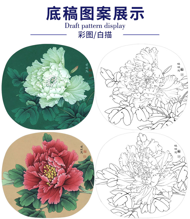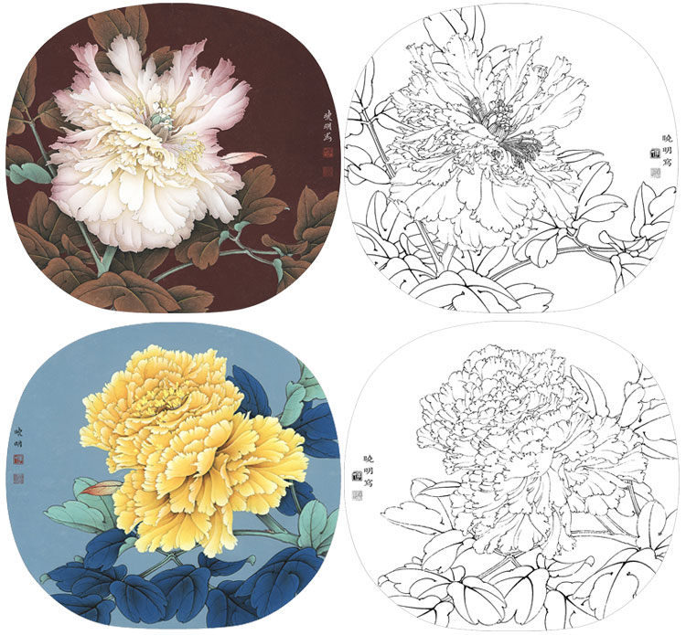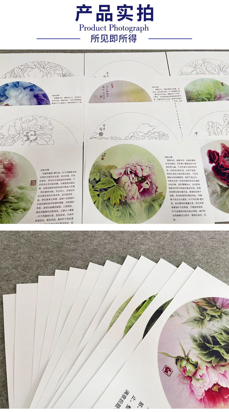 李晓明工笔花鸟画白描底稿牡丹一套八幅册页尺寸35×35厘米花鸟线稿KF21