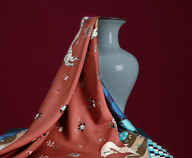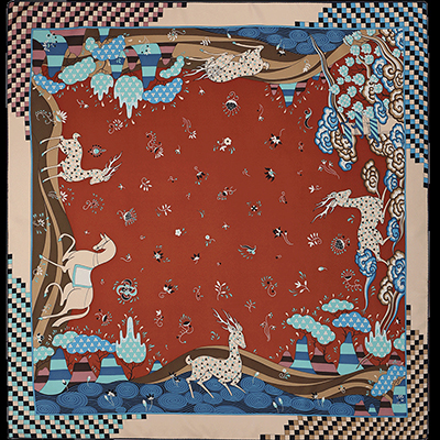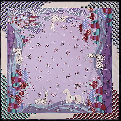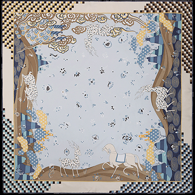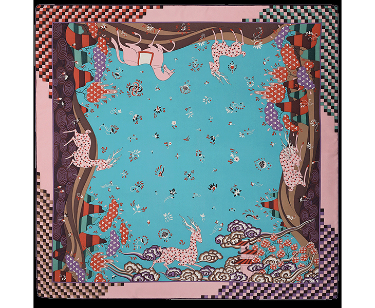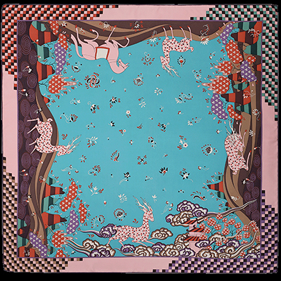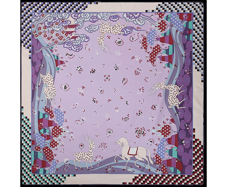 灵感源自敦煌莫高窟北魏257窟壁画,该壁画以长卷式连环画展现了《鹿王本生》的故事。故事中九色鹿是真善美的化身,具有非凡的象征意义,象征着爱、勇气和智慧。丝巾以九色鹿配以青绿山水,并点缀寓意吉祥的花卉、忍冬等纹样,表达美好及福禄之意。