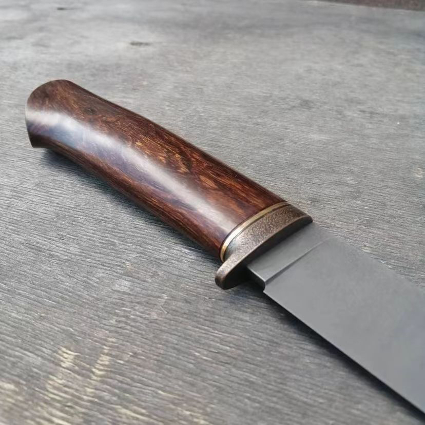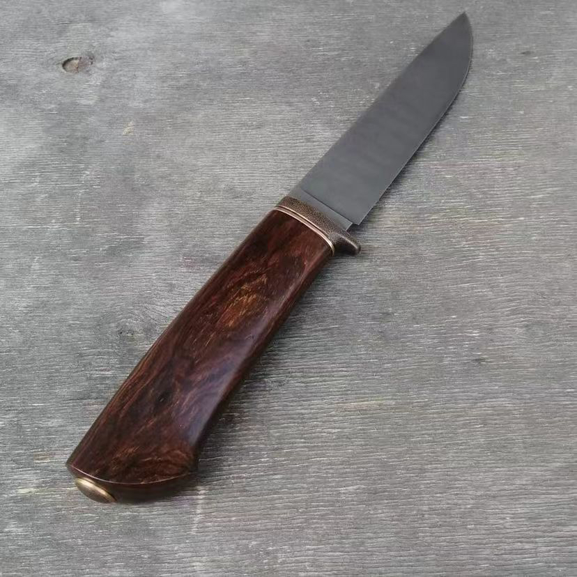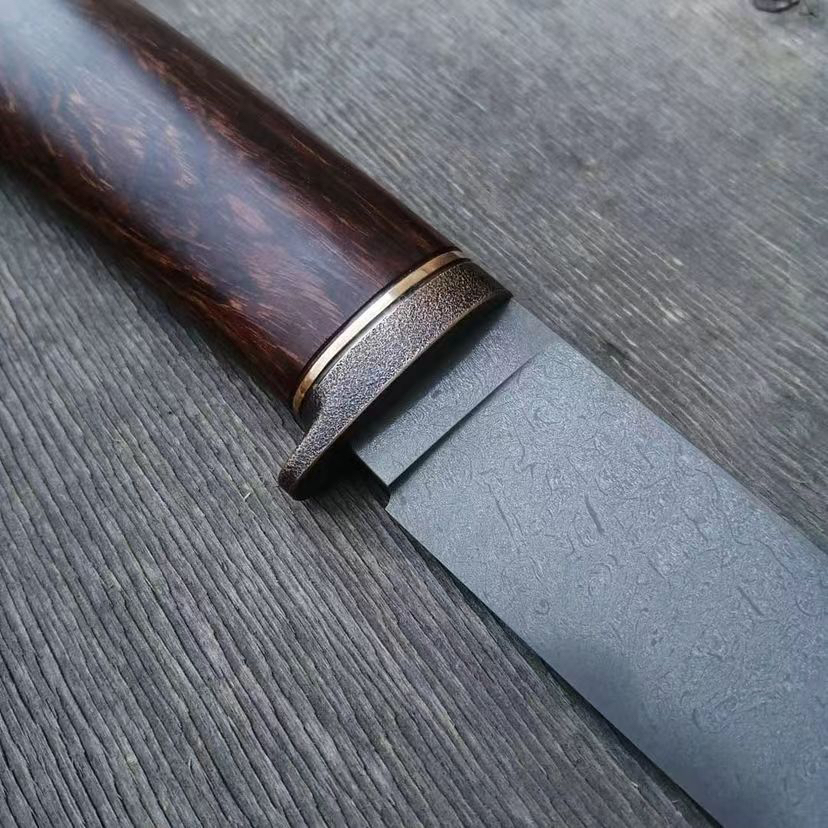 我们最经典的乌兹钢小猎刀 朴素大方 简约而不简单 全长25左右 做简约风格的作品是最难的 很考验师傅对线条比例的把控 稍微有一点不合适 整个东西就会非常难看 每一把经典作品出来的时候我都挺激动的 玩刀做刀很多年了 至今还会让我不淡定的就是这些简约大气 极具质感的作品了 我爱这一类的东西 乌兹钢刃 手工打磨到位 雪花纹路是永恒的经典 不可复制的美 黄铜复古护手 美国进口的沙漠铁木柄 天然材料的纹路和质感是我喜欢的 稍微有点阅历的人慢慢都会偏向玩物的一种感觉 一种味道 这是一把好刀的灵魂 是机器做的东西身上没有的东西 各位自己玩或者送朋友都非常合适