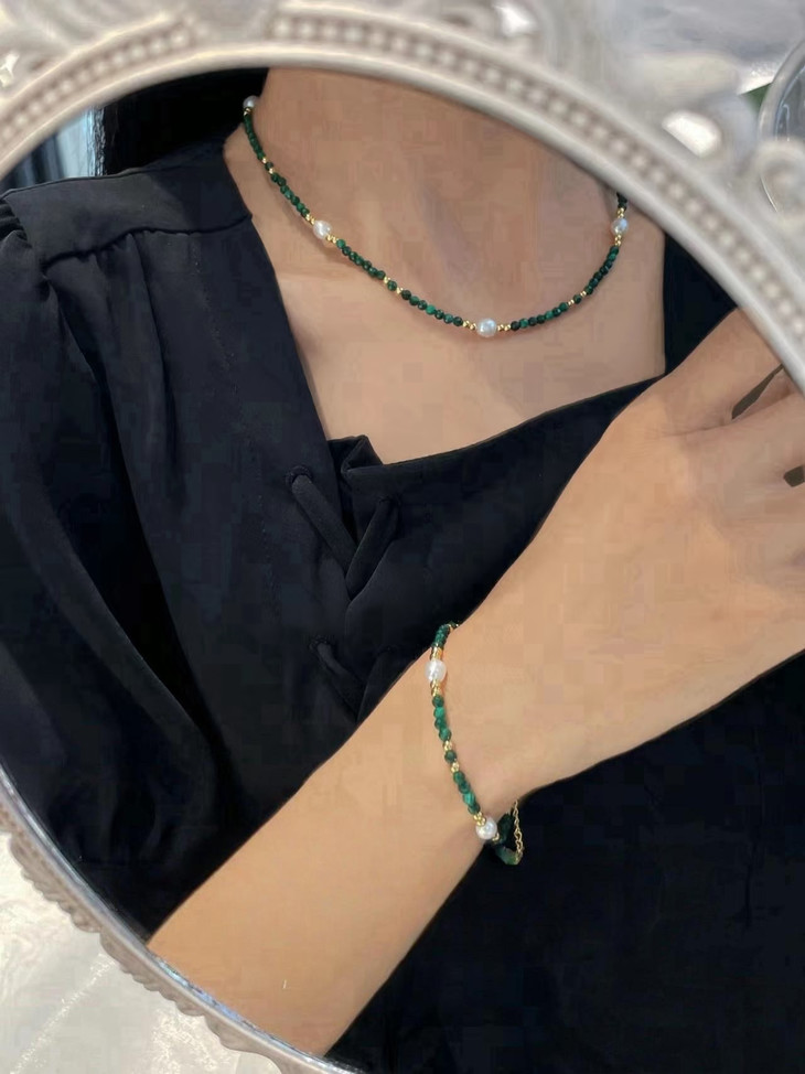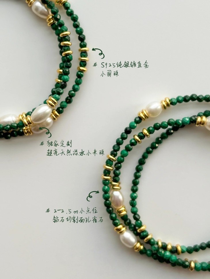 我们采用孔雀石、镀金小银珠、小米珠